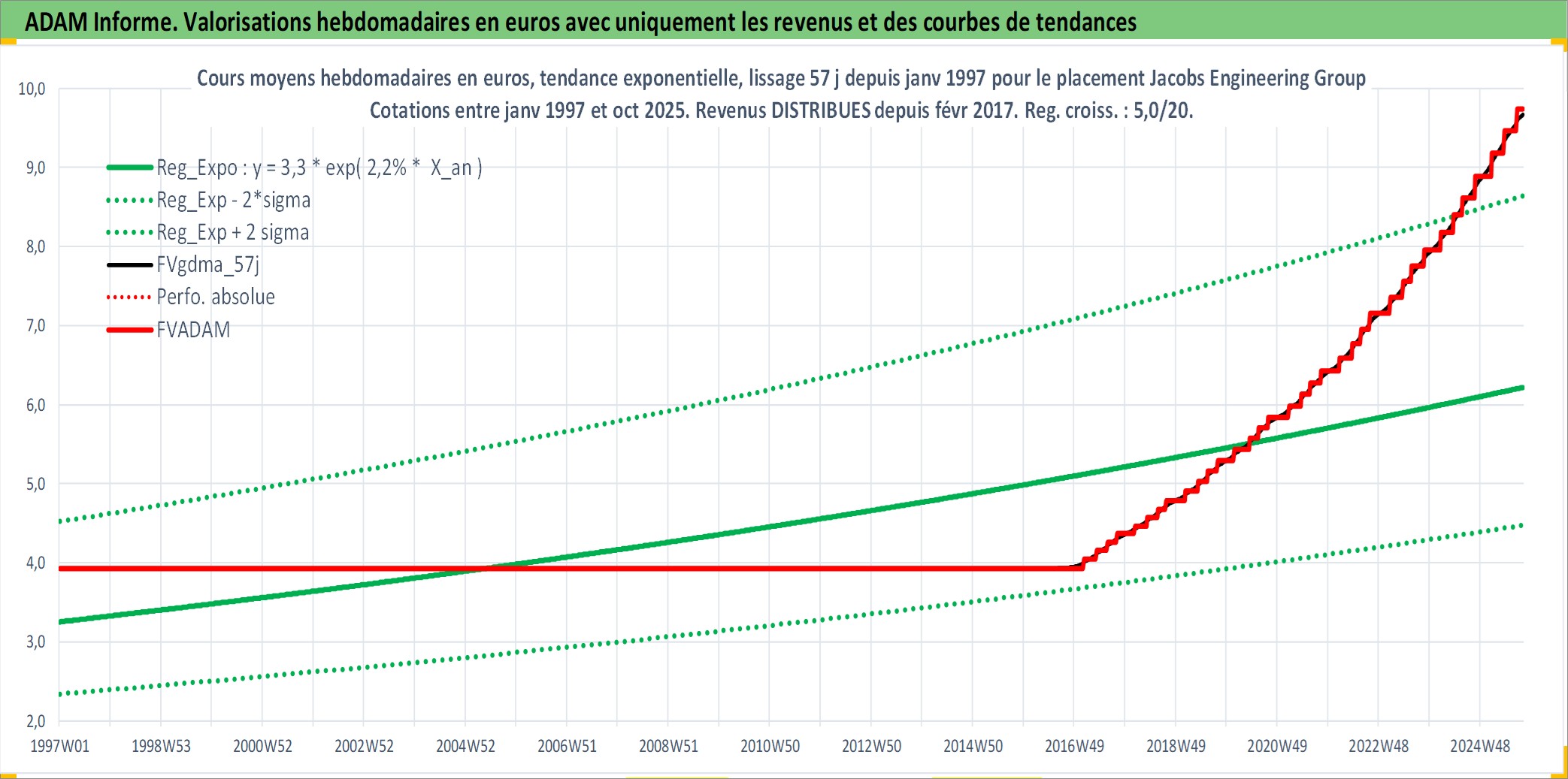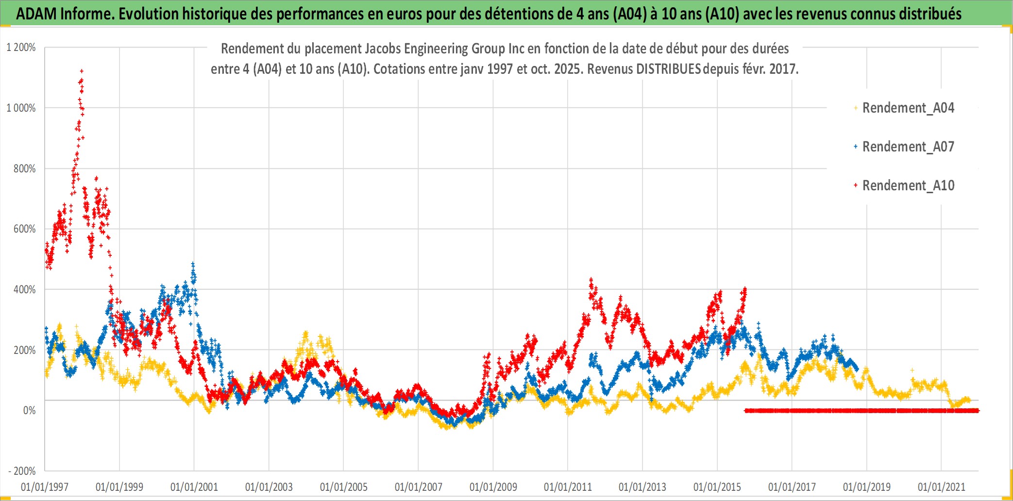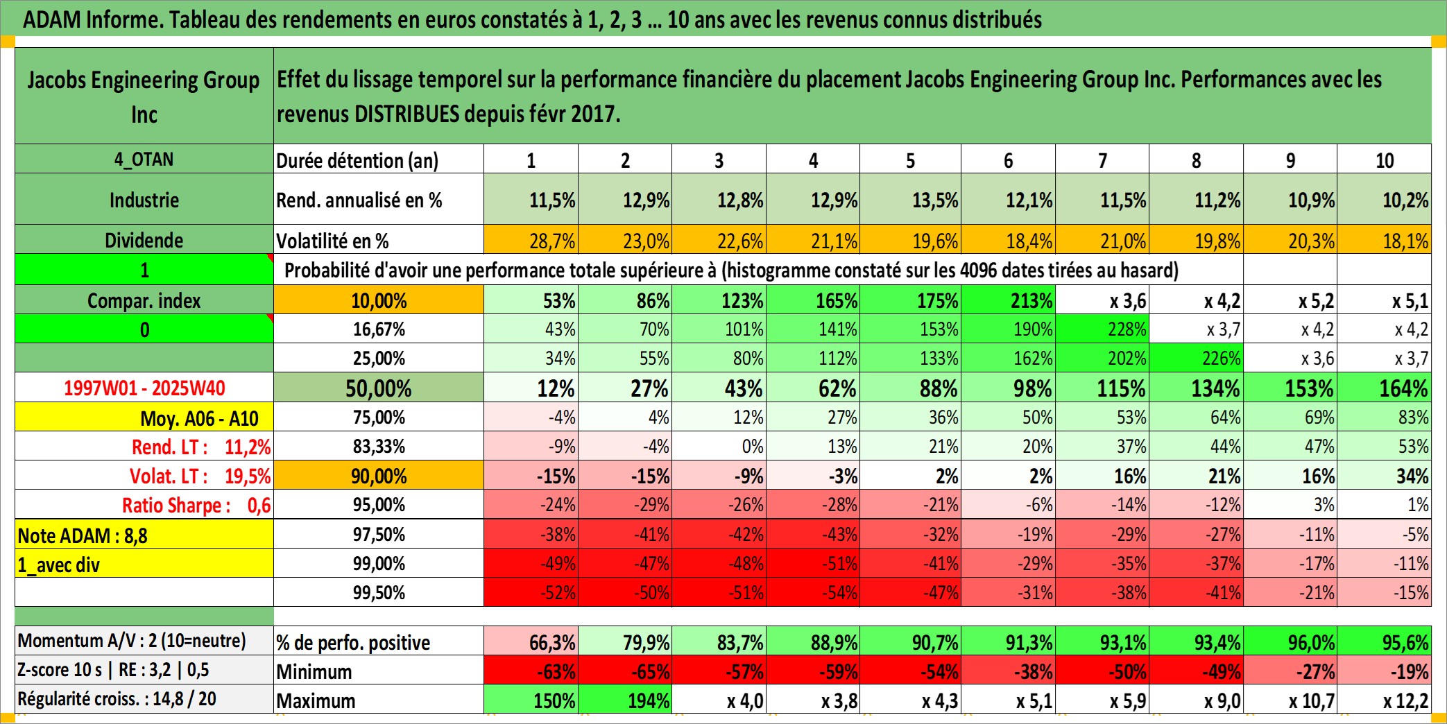 Site dédié aux investisseursPage dédiée sur site financeAnalyse des valorisations hebdomadaires de l'action Jacobs Engineering Group Inc. Cet actif est cote en USD. Les valorisations sont en contrevaleur EURO et couvrent les semaines 1997W01 a 2025W40. Les revenus de cet actif financier sont pris en compte depuis la semaine 2017W07. La note globale ESG de cet actif est estimee a 9.0 (apres rebasage entre 0 et 20).