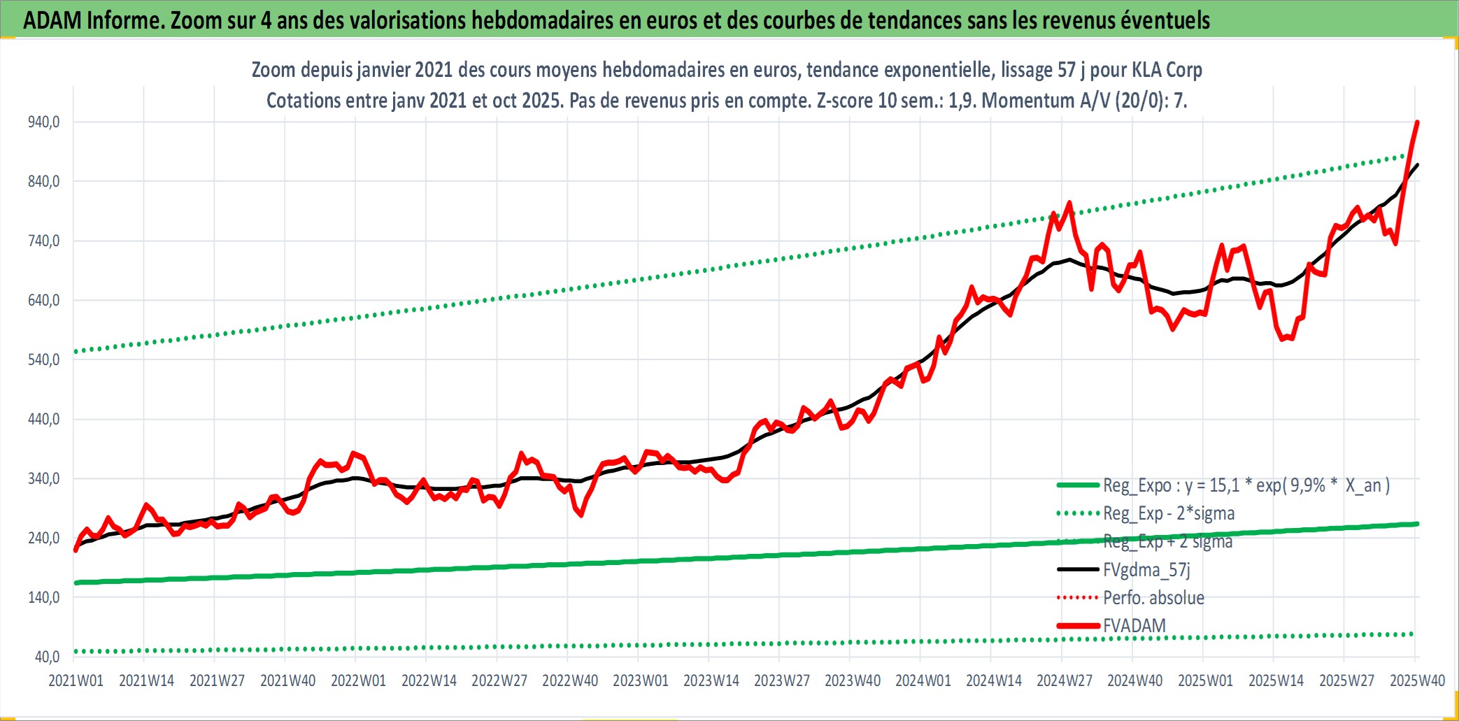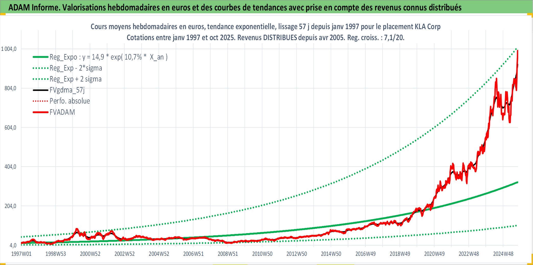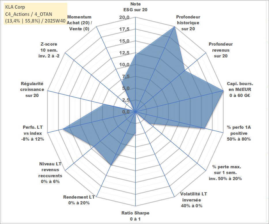 Site dédié aux investisseursPage dédiée sur site financeAnalyse des valorisations hebdomadaires de l'action KLA Corp. Cet actif est cote en USD. Les valorisations sont en contrevaleur EURO et couvrent les semaines 1997W01 a 2025W40. Les revenus de cet actif financier sont pris en compte depuis la semaine 2005W17. La note globale ESG de cet actif est estimee a 12.0 (apres rebasage entre 0 et 20).