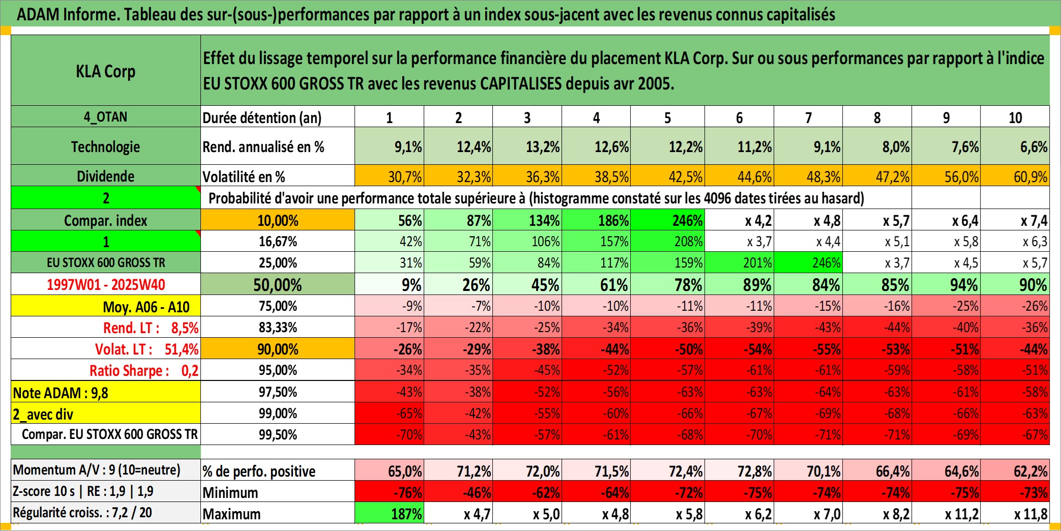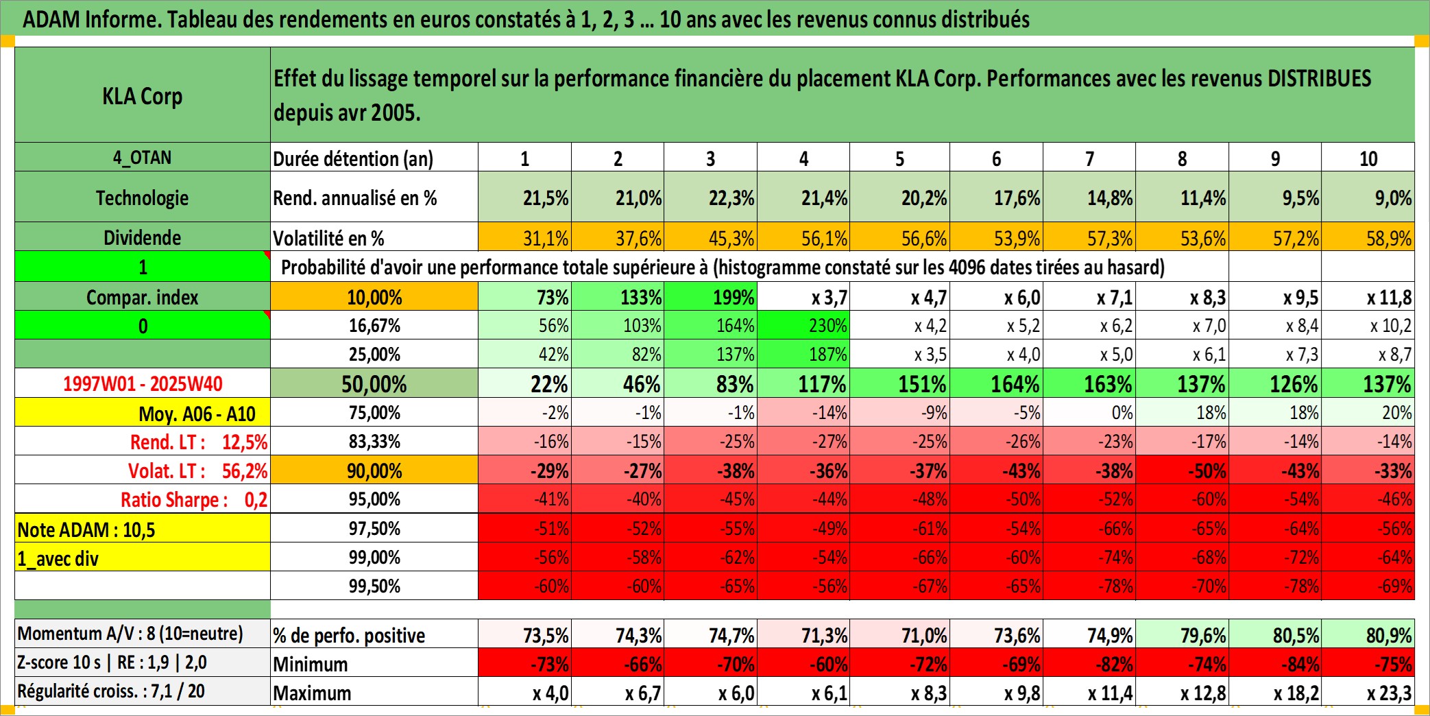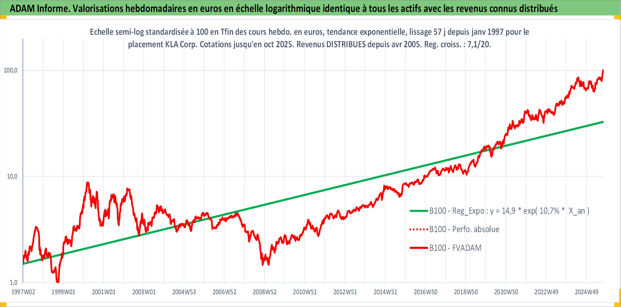Site dédié aux investisseursPage dédiée sur site financeAnalyse des valorisations hebdomadaires de l'action KLA Corp. Cet actif est cote en USD. Les valorisations sont en contrevaleur EURO et couvrent les semaines 1997W01 a 2025W40. Les revenus de cet actif financier sont pris en compte depuis la semaine 2005W17. La note globale ESG de cet actif est estimee a 12.0 (apres rebasage entre 0 et 20).