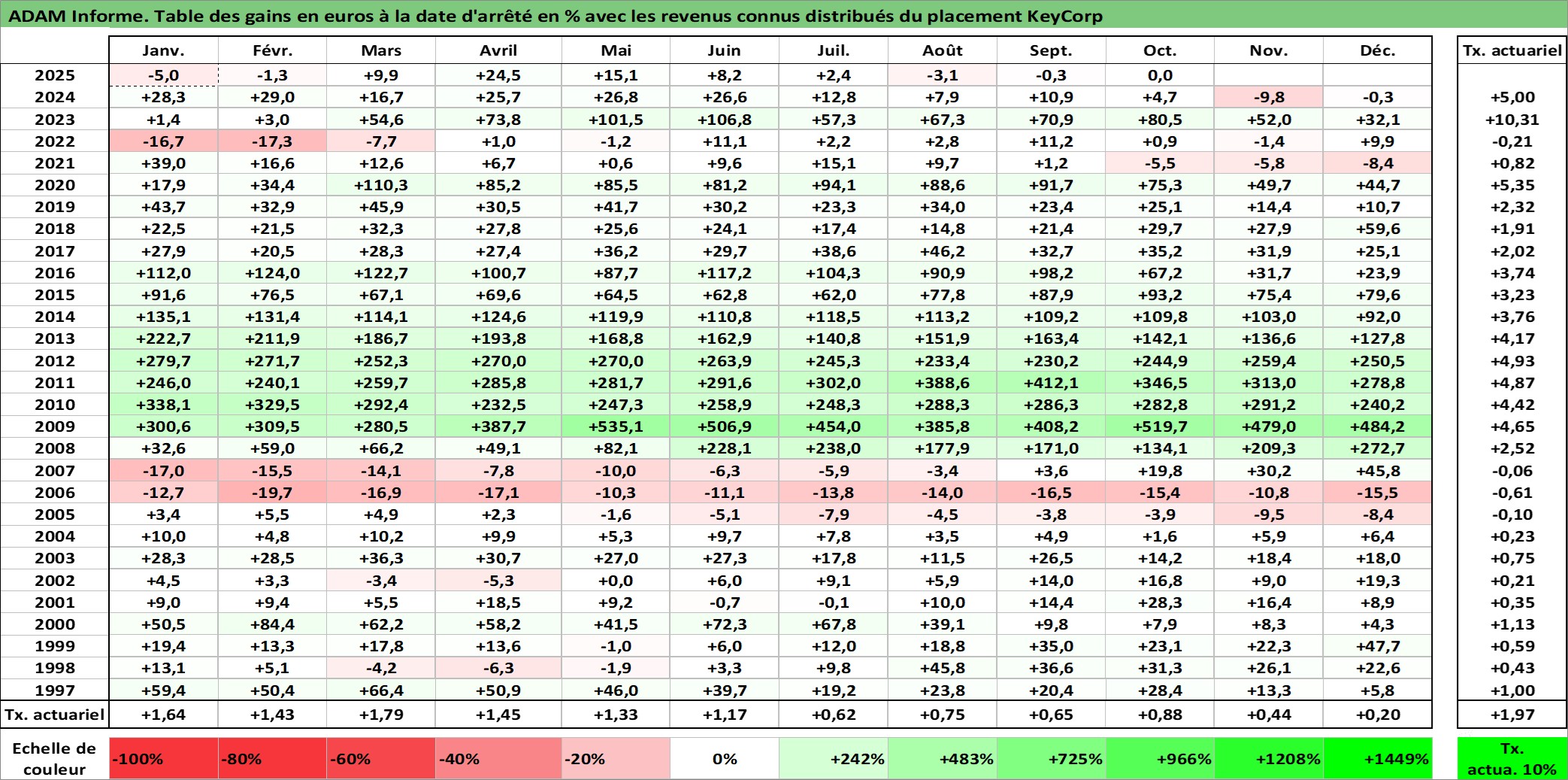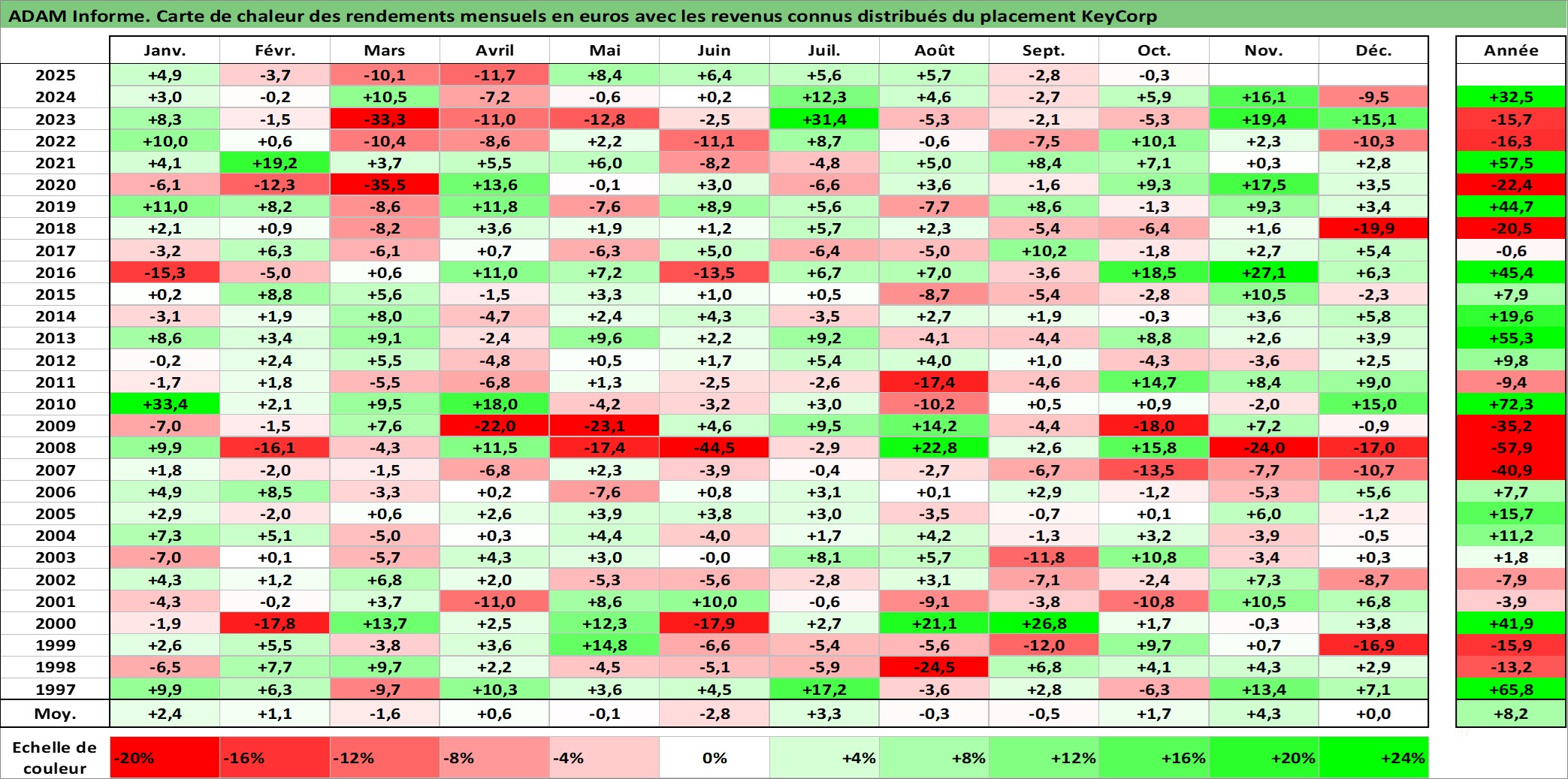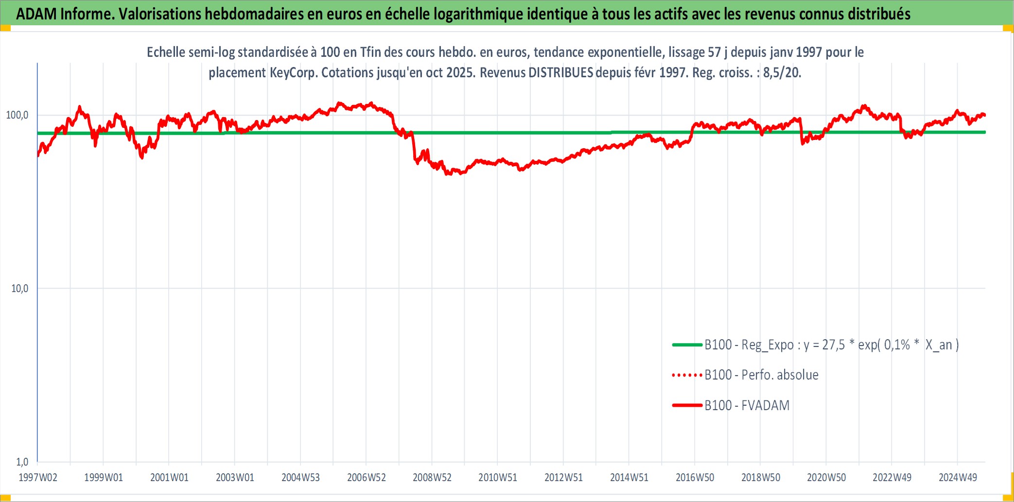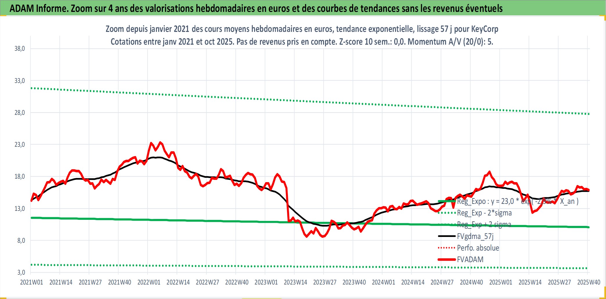 Site dédié aux investisseursPage dédiée sur site financeAnalyse des valorisations hebdomadaires de l'action KeyCorp. Cet actif est cote en USD. Les valorisations sont en contrevaleur EURO et couvrent les semaines 1997W01 a 2025W40. Les revenus de cet actif financier sont pris en compte depuis la semaine 1997W09. La note globale ESG de cet actif est estimee a 9.0 (apres rebasage entre 0 et 20).