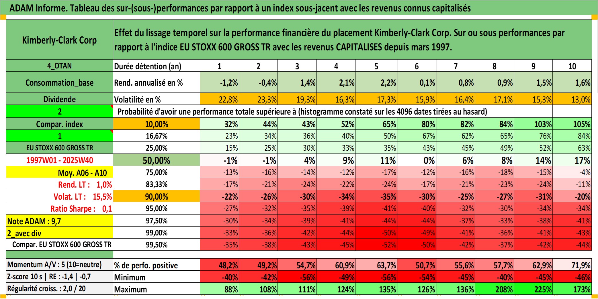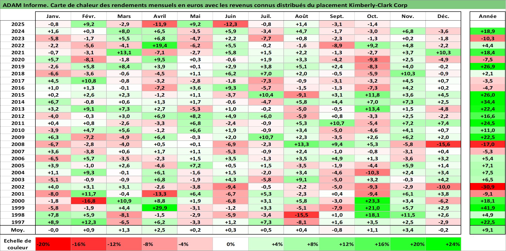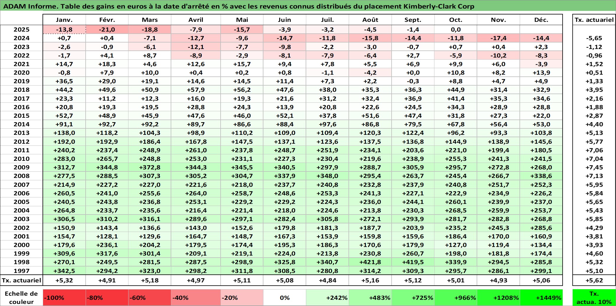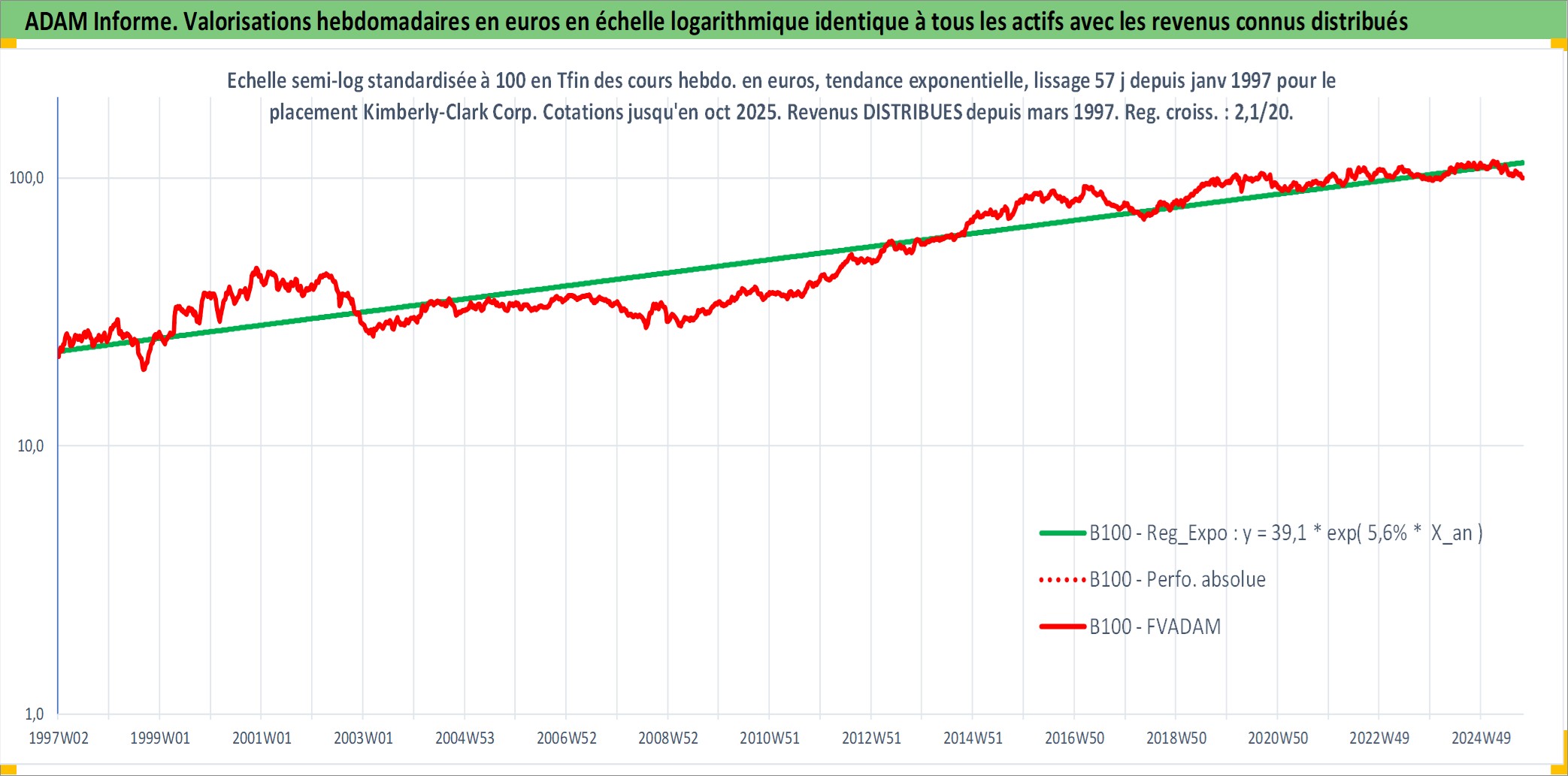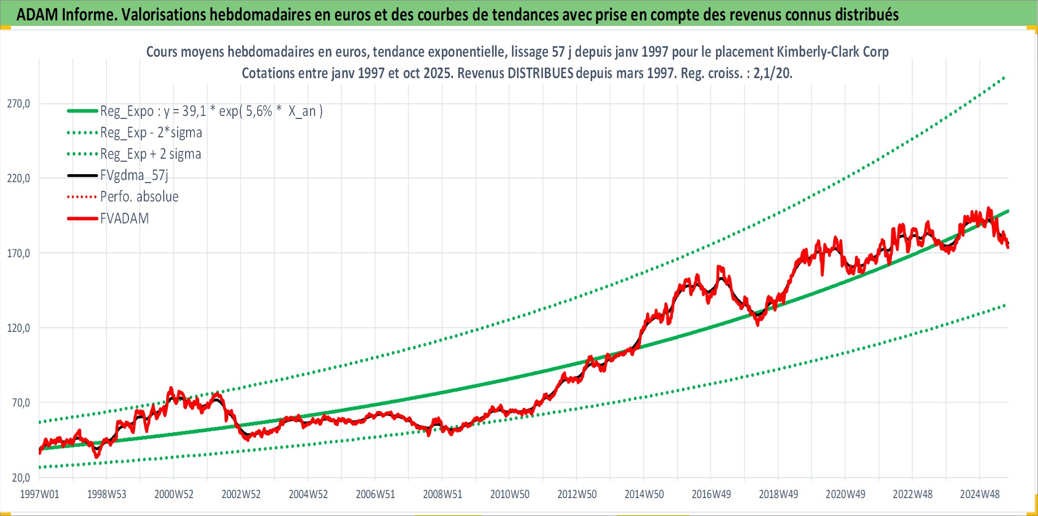 Site dédié aux investisseursPage dédiée sur site financeAnalyse des valorisations hebdomadaires de l'action Kimberly-Clark Corp. Cet actif est cote en USD. Les valorisations sont en contrevaleur EURO et couvrent les semaines 1997W01 a 2025W40. Les revenus de cet actif financier sont pris en compte depuis la semaine 1997W10. La note globale ESG de cet actif est estimee a 9.0 (apres rebasage entre 0 et 20).