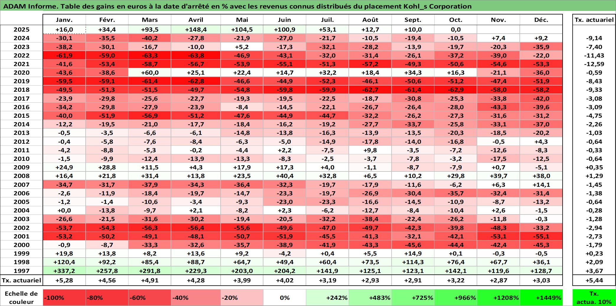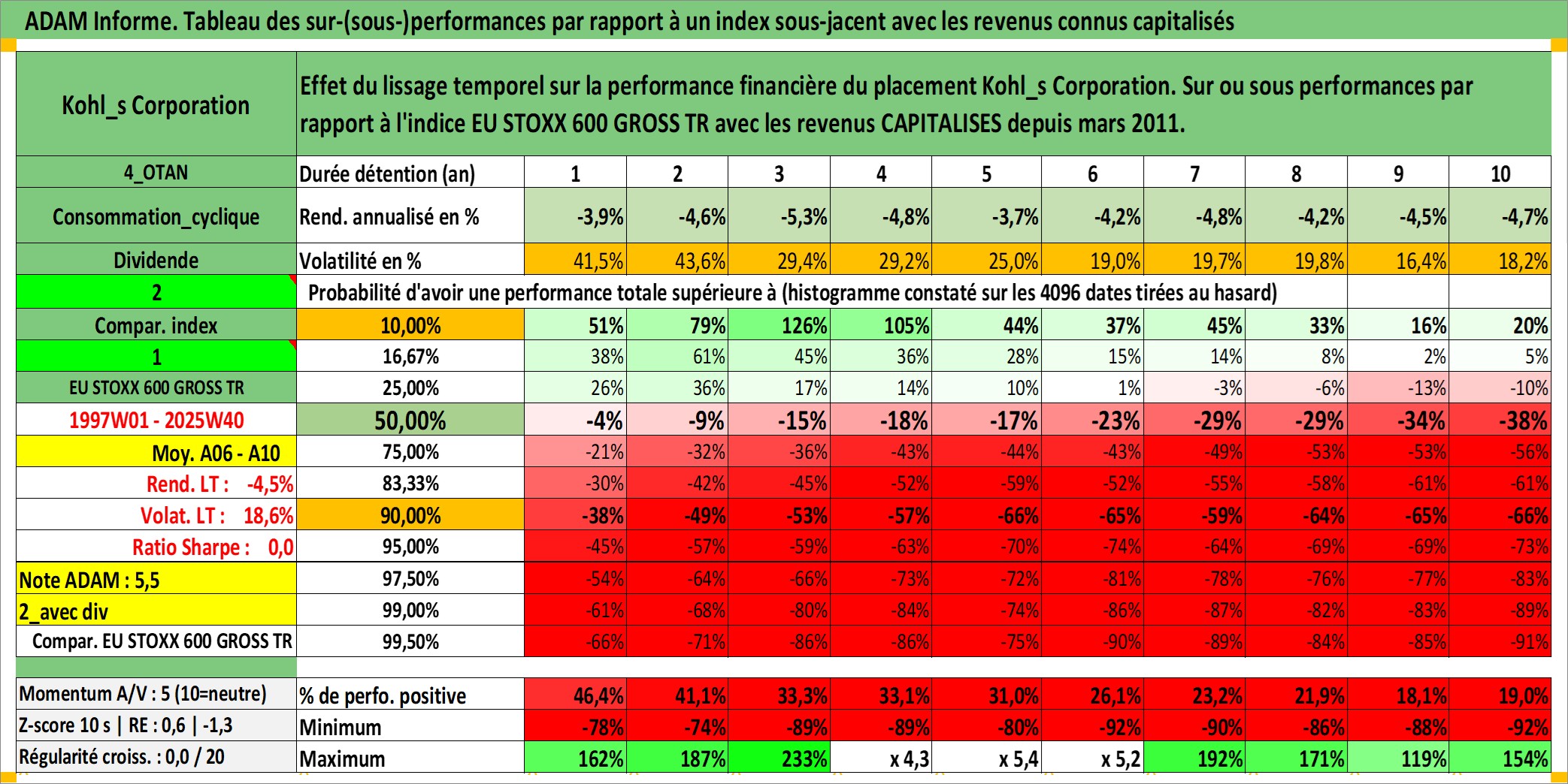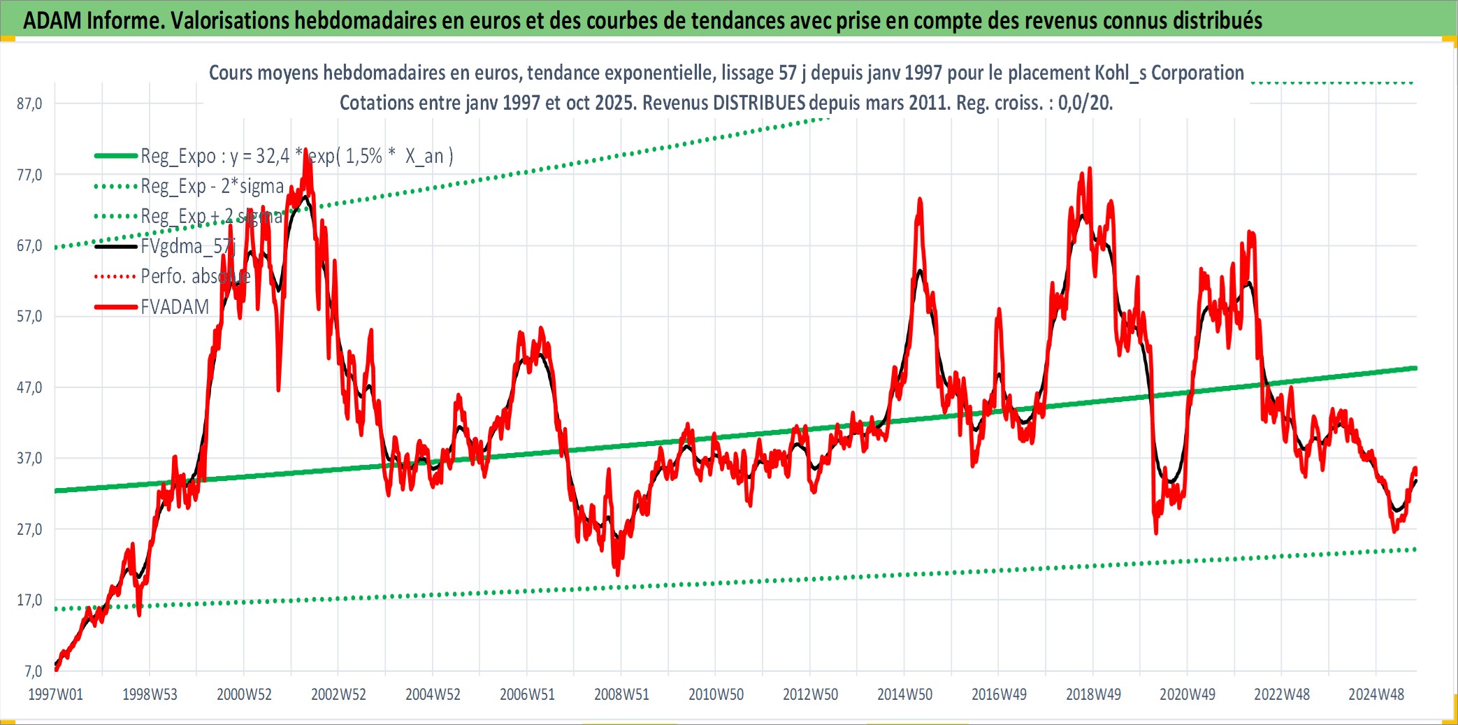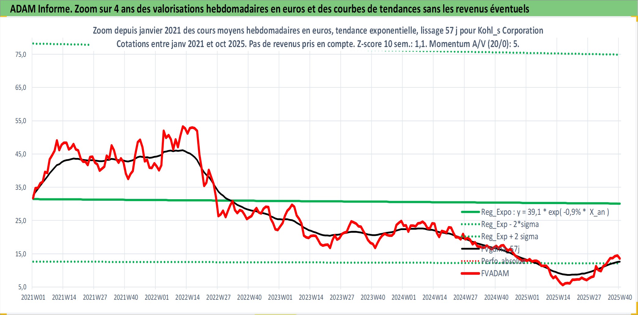 Site dédié aux investisseursPage dédiée sur site financeAnalyse des valorisations hebdomadaires de l'action Kohl_s Corporation. Cet actif est cote en USD. Les valorisations sont en contrevaleur EURO et couvrent les semaines 1997W01 a 2025W40. Les revenus de cet actif financier sont pris en compte depuis la semaine 2011W10. La note globale ESG de cet actif est estimee a 15.0 (apres rebasage entre 0 et 20).