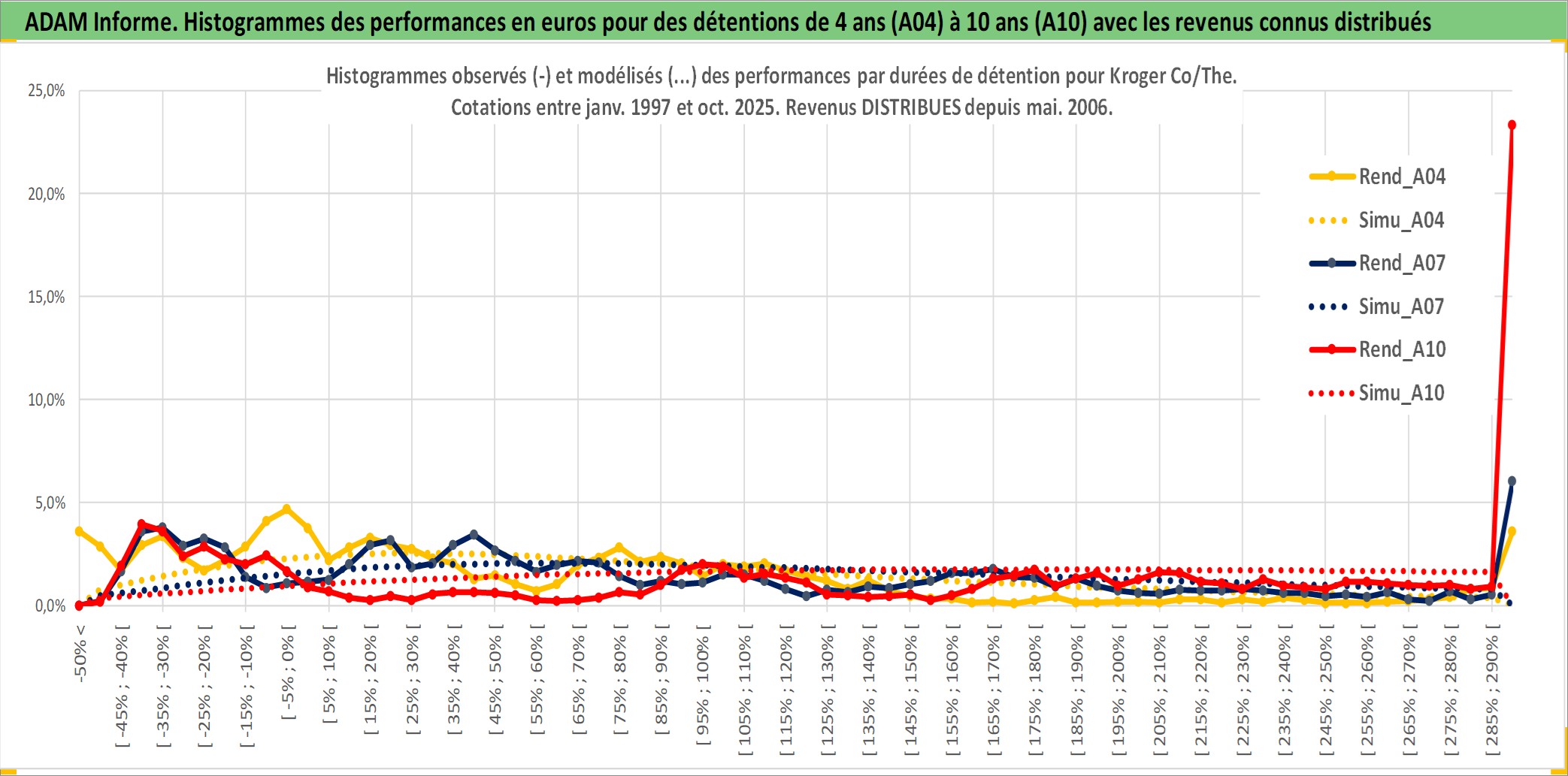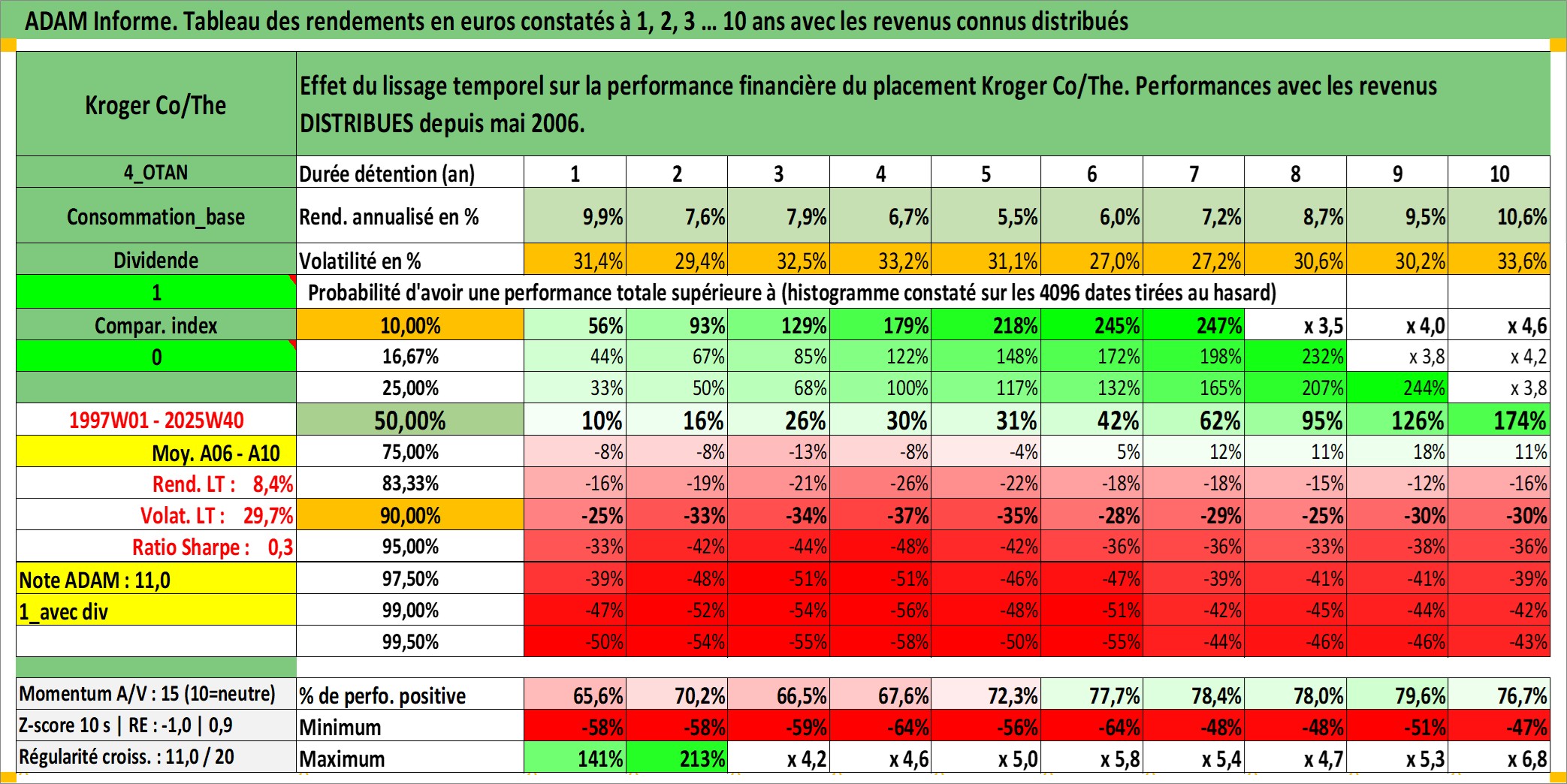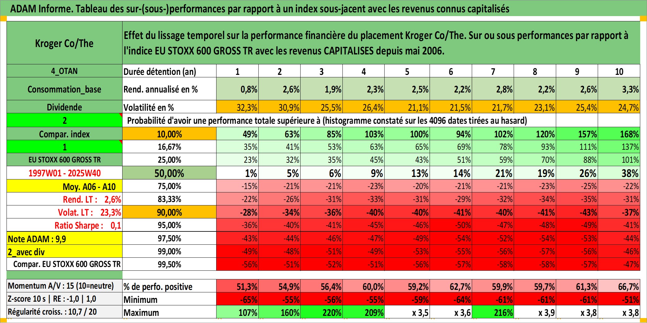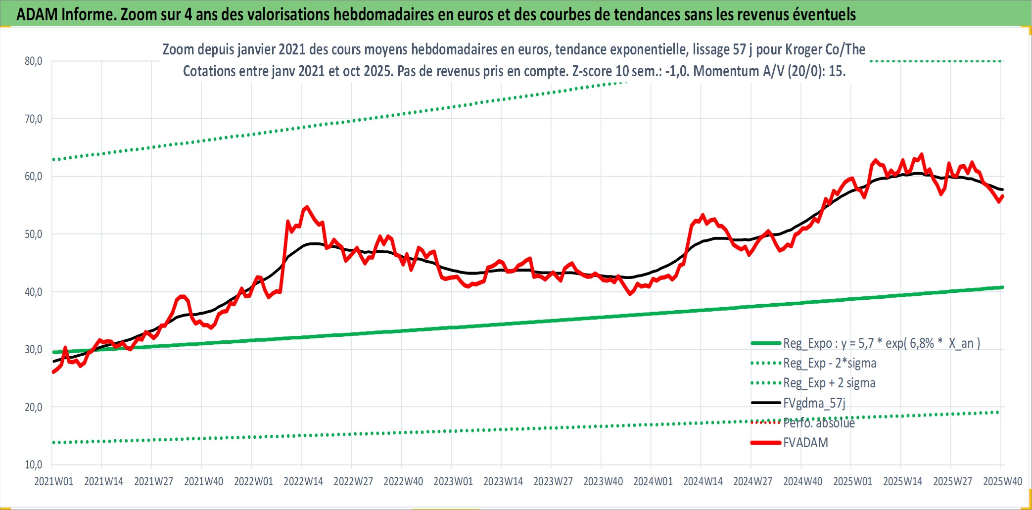 Site dédié aux investisseursPage dédiée sur site financeAnalyse des valorisations hebdomadaires de l'action Kroger Co/The. Cet actif est cote en USD. Les valorisations sont en contrevaleur EURO et couvrent les semaines 1997W01 a 2025W40. Les revenus de cet actif financier sont pris en compte depuis la semaine 2006W19. La note globale ESG de cet actif est estimee a 10.0 (apres rebasage entre 0 et 20).