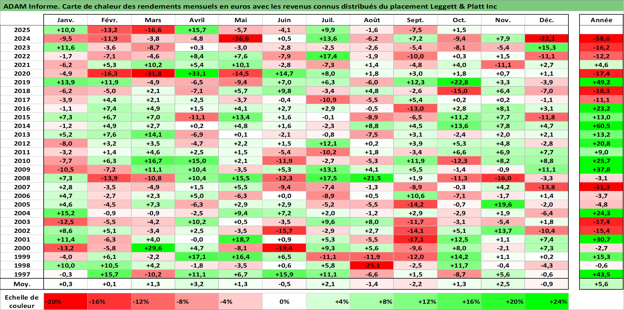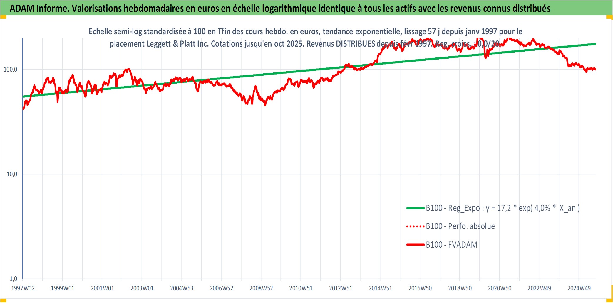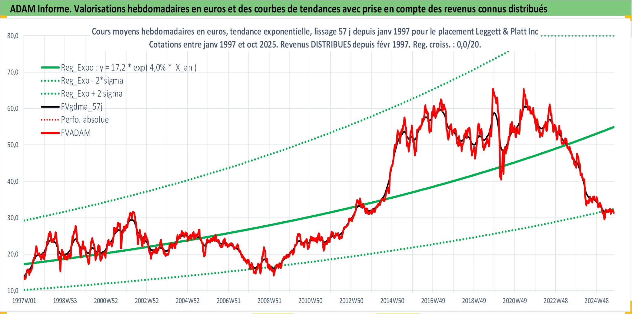 Site dédié aux investisseursPage dédiée sur site financeAnalyse des valorisations hebdomadaires de l'action Leggett & Platt Inc. Cet actif est cote en USD. Les valorisations sont en contrevaleur EURO et couvrent les semaines 1997W01 a 2025W40. Les revenus de cet actif financier sont pris en compte depuis la semaine 1997W08. La note globale ESG de cet actif est estimee a 14.0 (apres rebasage entre 0 et 20).