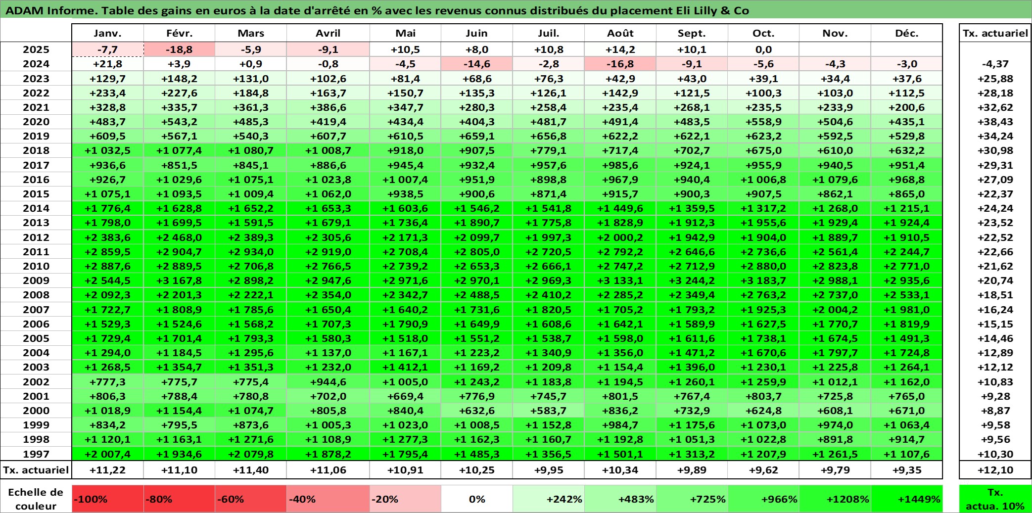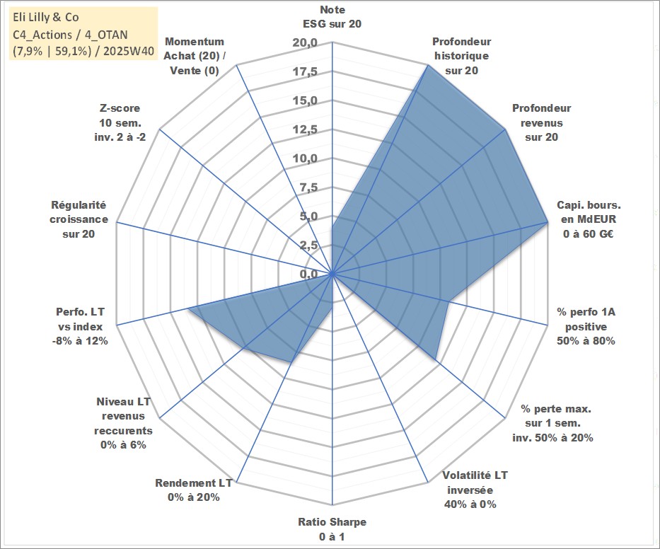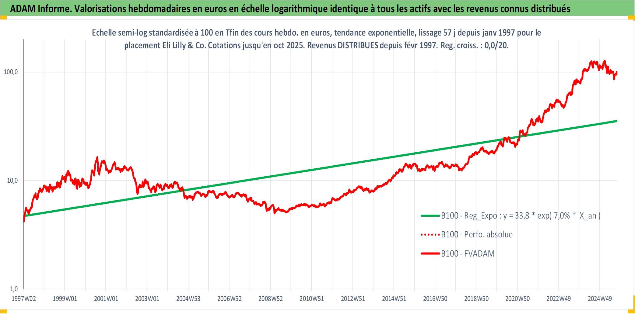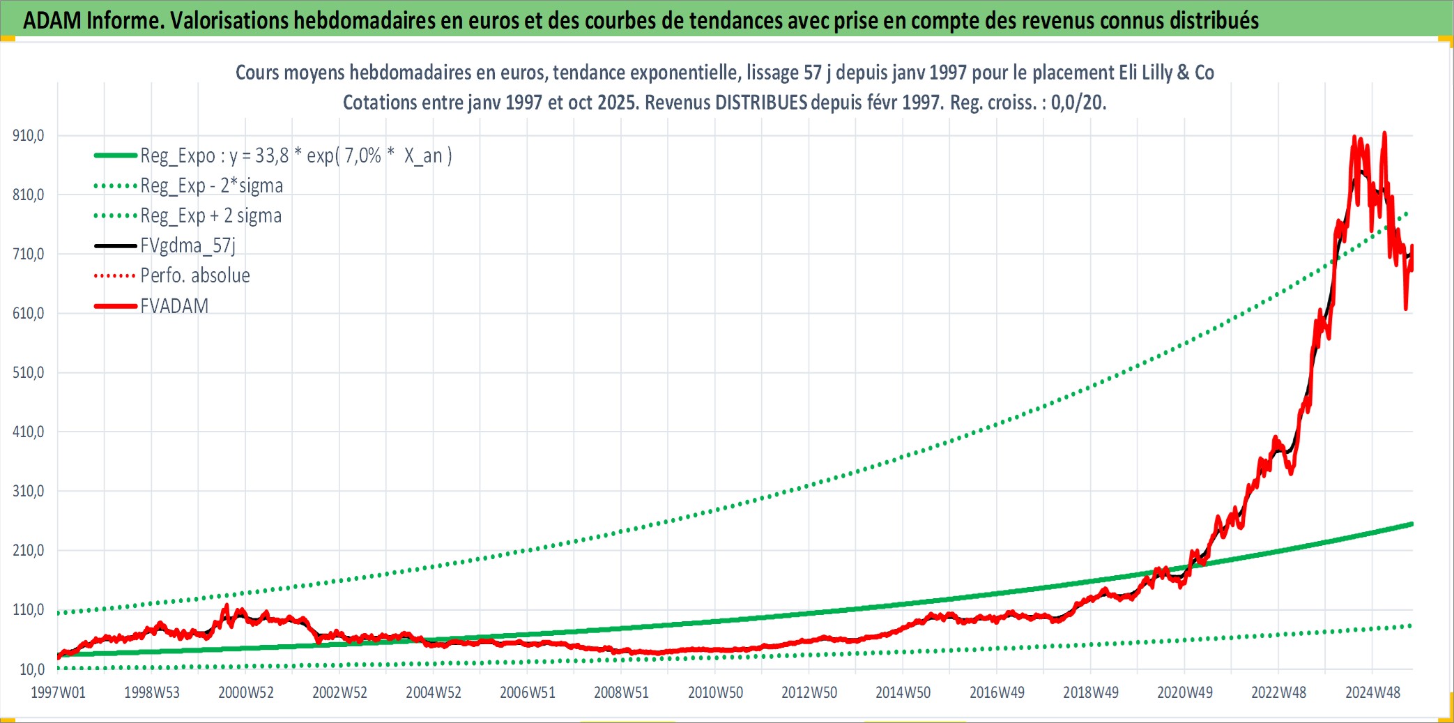 Site dédié aux investisseursPage dédiée sur site financeAnalyse des valorisations hebdomadaires de l'action Eli Lilly & Co. Cet actif est cote en USD. Les valorisations sont en contrevaleur EURO et couvrent les semaines 1997W01 a 2025W40. Les revenus de cet actif financier sont pris en compte depuis la semaine 1997W07. La note globale ESG de cet actif est estimee a 4.0 (apres rebasage entre 0 et 20).