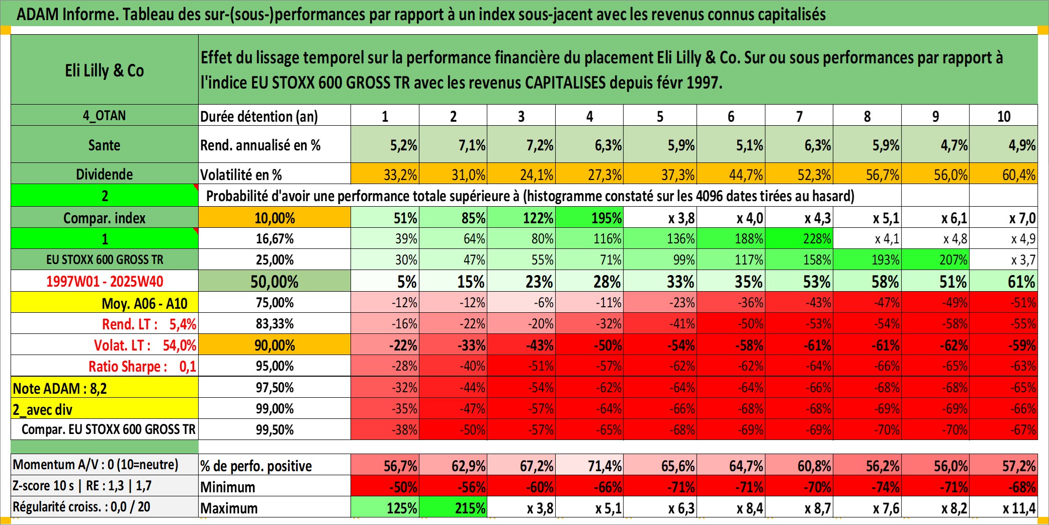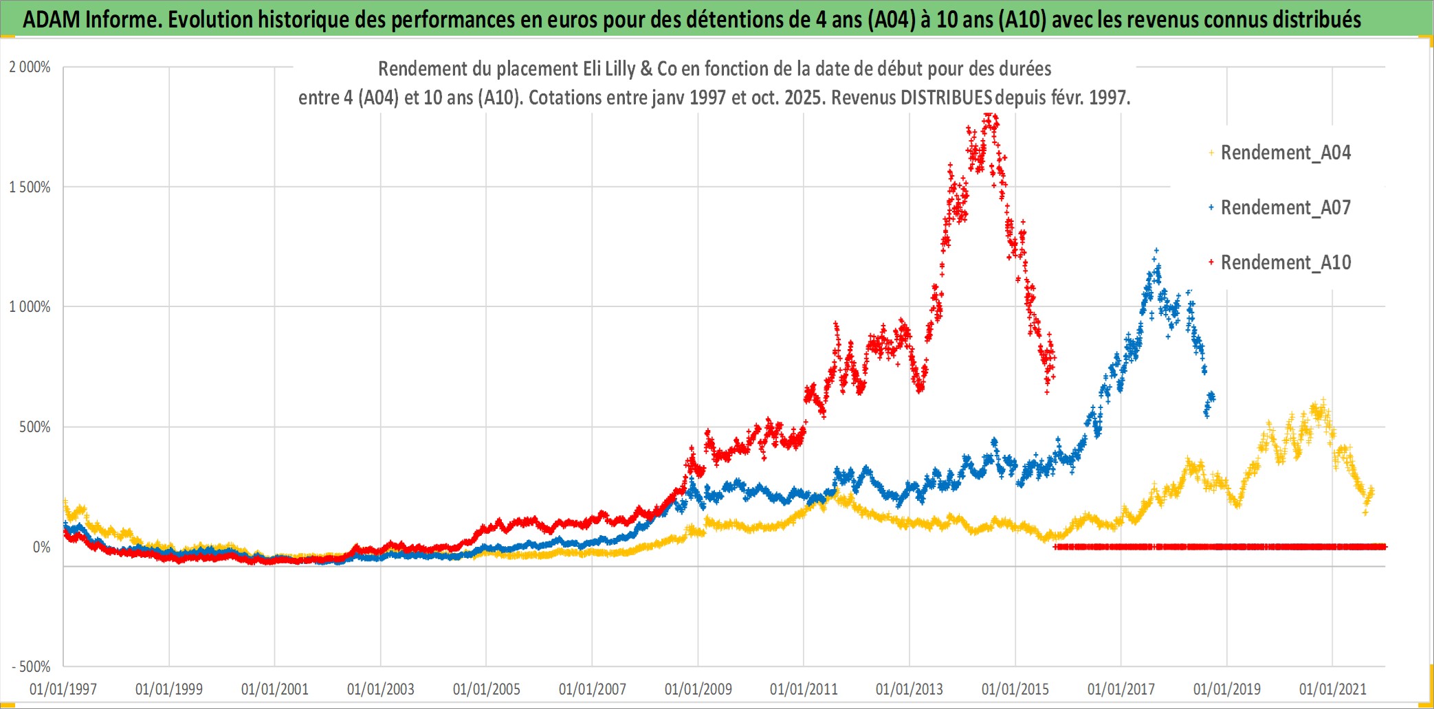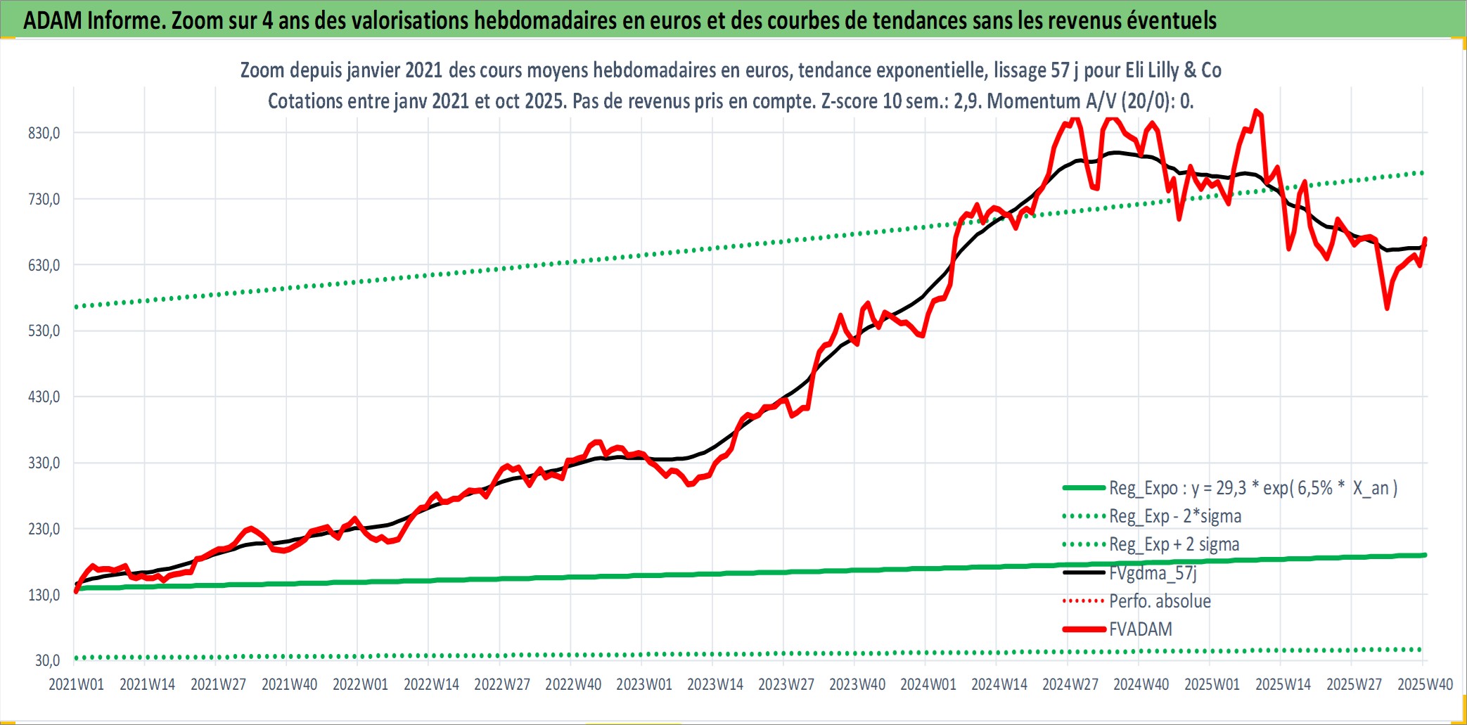 Site dédié aux investisseursPage dédiée sur site financeAnalyse des valorisations hebdomadaires de l'action Eli Lilly & Co. Cet actif est cote en USD. Les valorisations sont en contrevaleur EURO et couvrent les semaines 1997W01 a 2025W40. Les revenus de cet actif financier sont pris en compte depuis la semaine 1997W07. La note globale ESG de cet actif est estimee a 4.0 (apres rebasage entre 0 et 20).