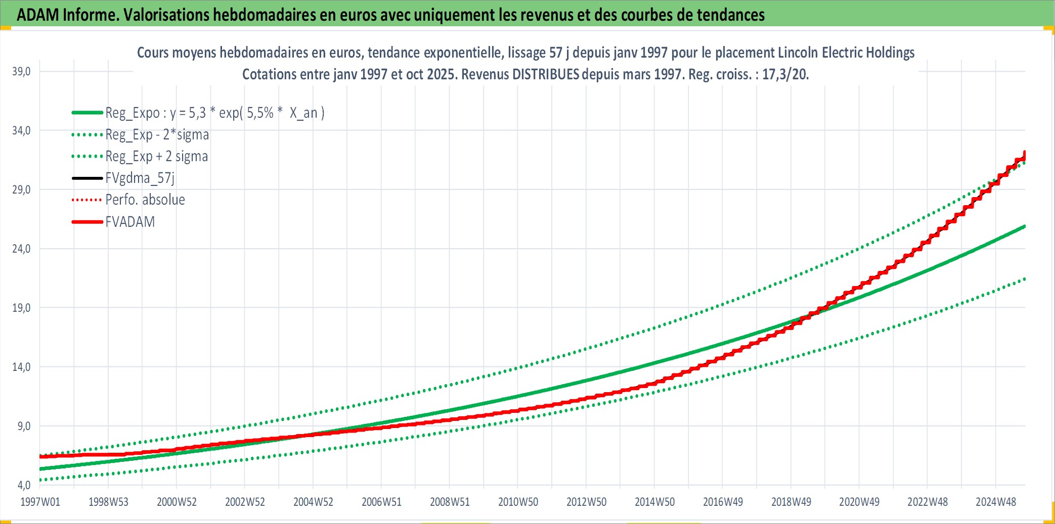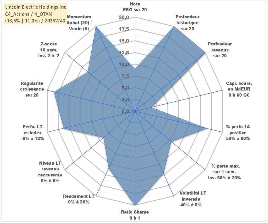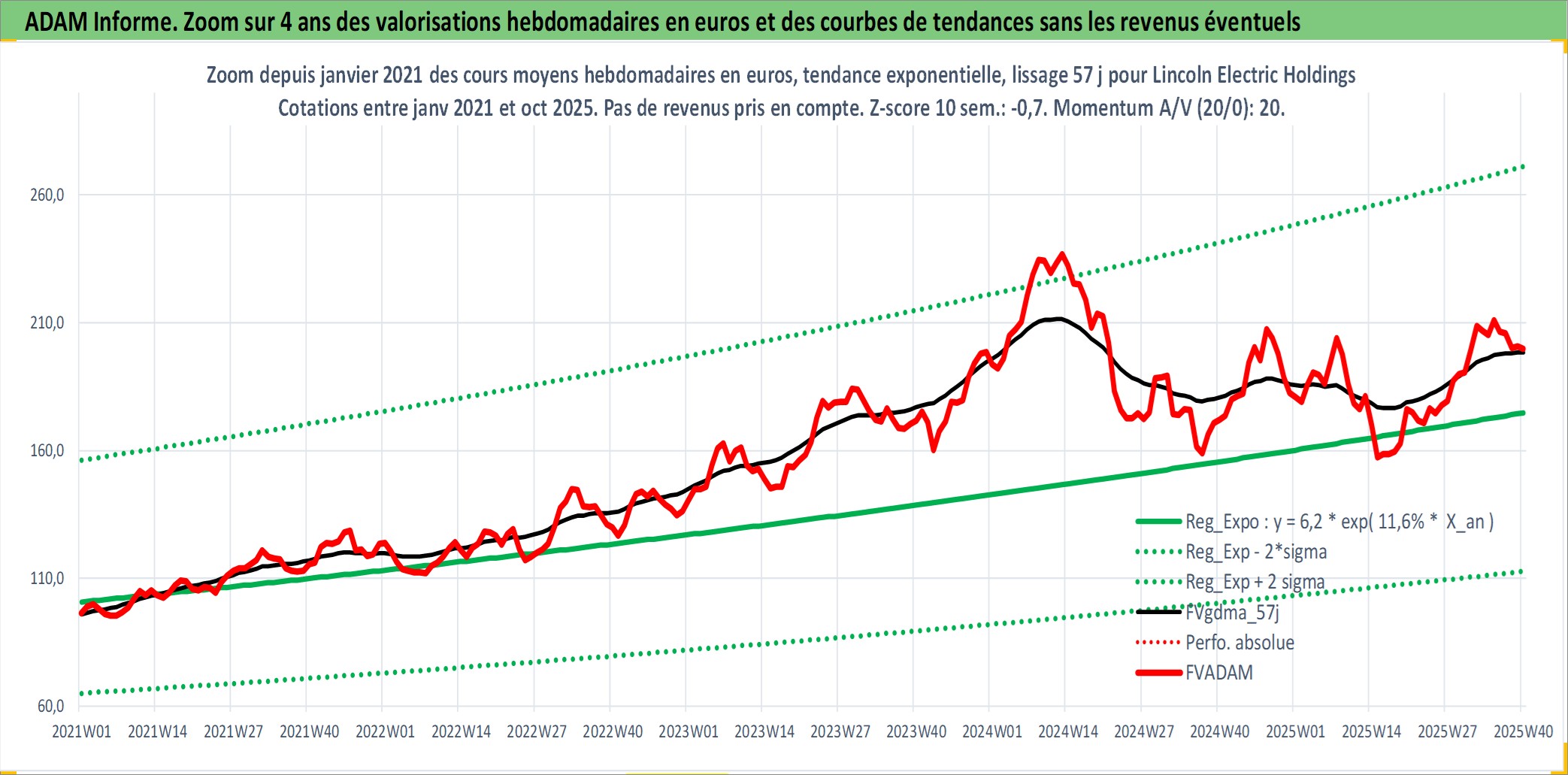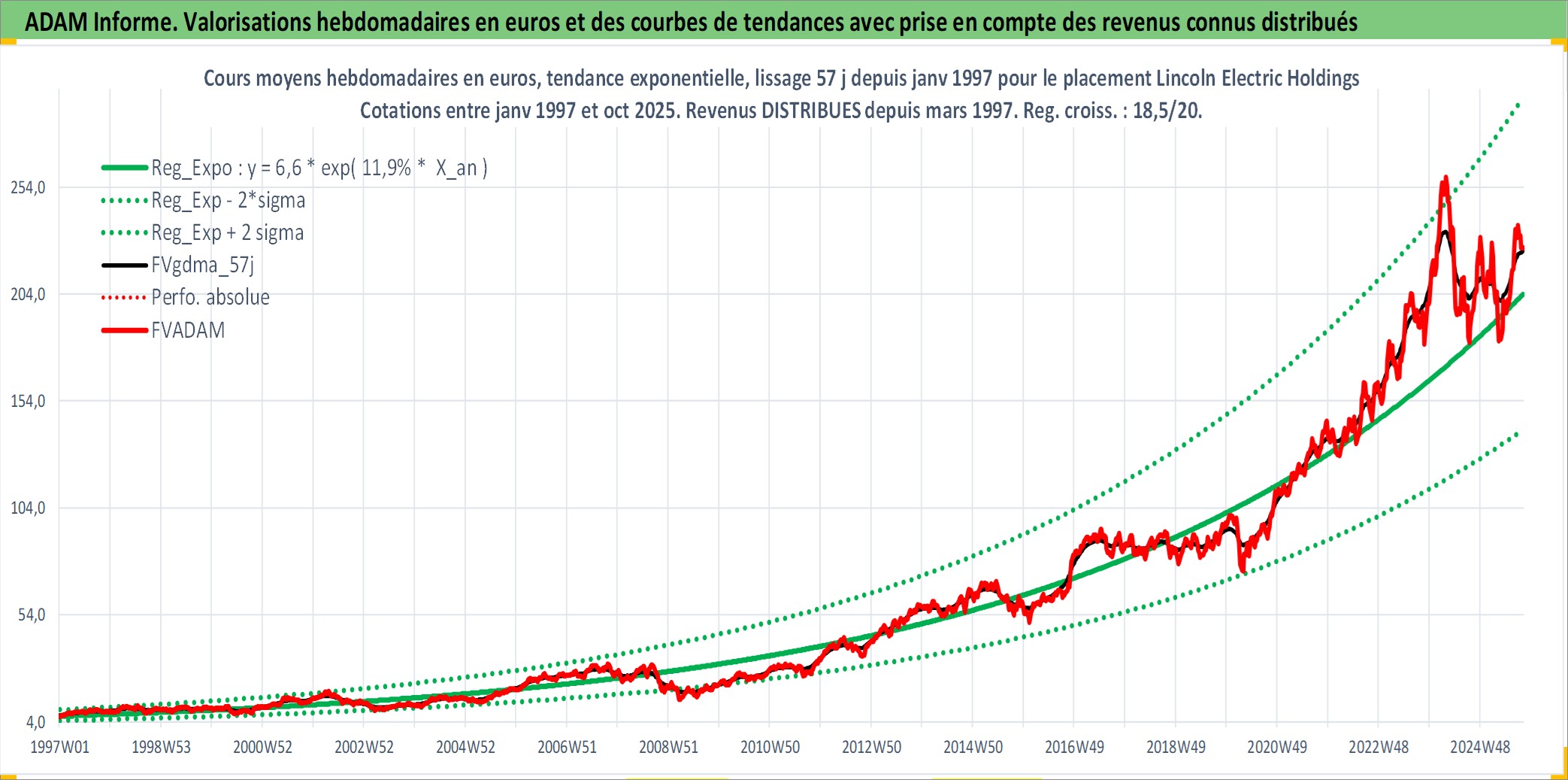 Site dédié aux investisseursPage dédiée sur site financeAnalyse des valorisations hebdomadaires de l'action Lincoln Electric Holdings Inc. Cet actif est cote en USD. Les valorisations sont en contrevaleur EURO et couvrent les semaines 1997W01 a 2025W40. Les revenus de cet actif financier sont pris en compte depuis la semaine 1997W13. La note globale ESG de cet actif est estimee a 9.0 (apres rebasage entre 0 et 20).