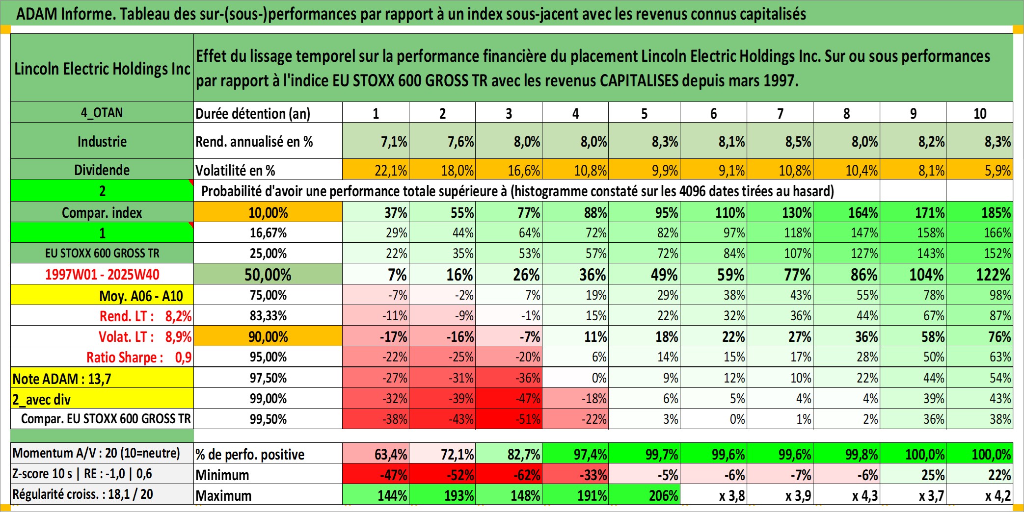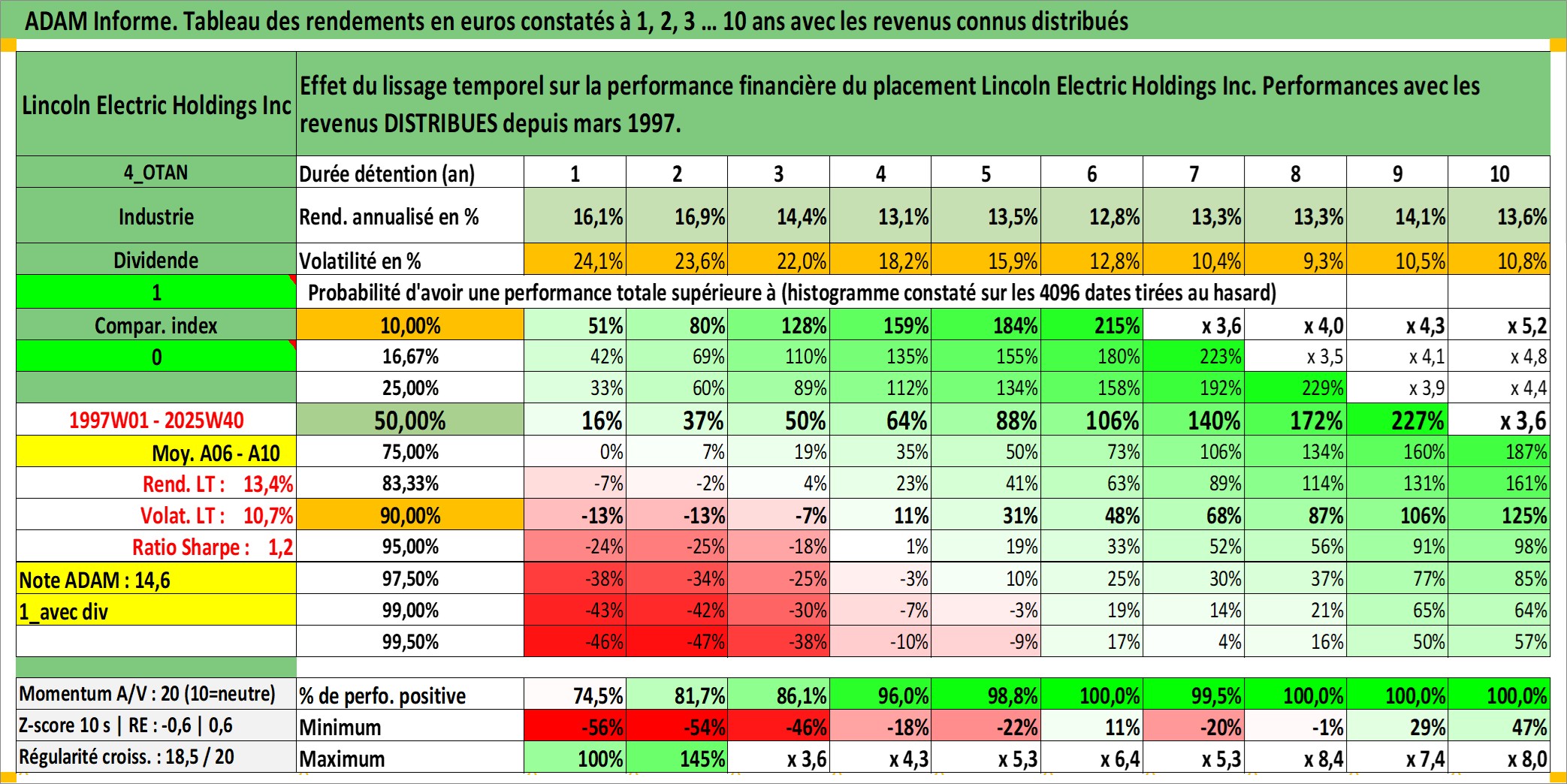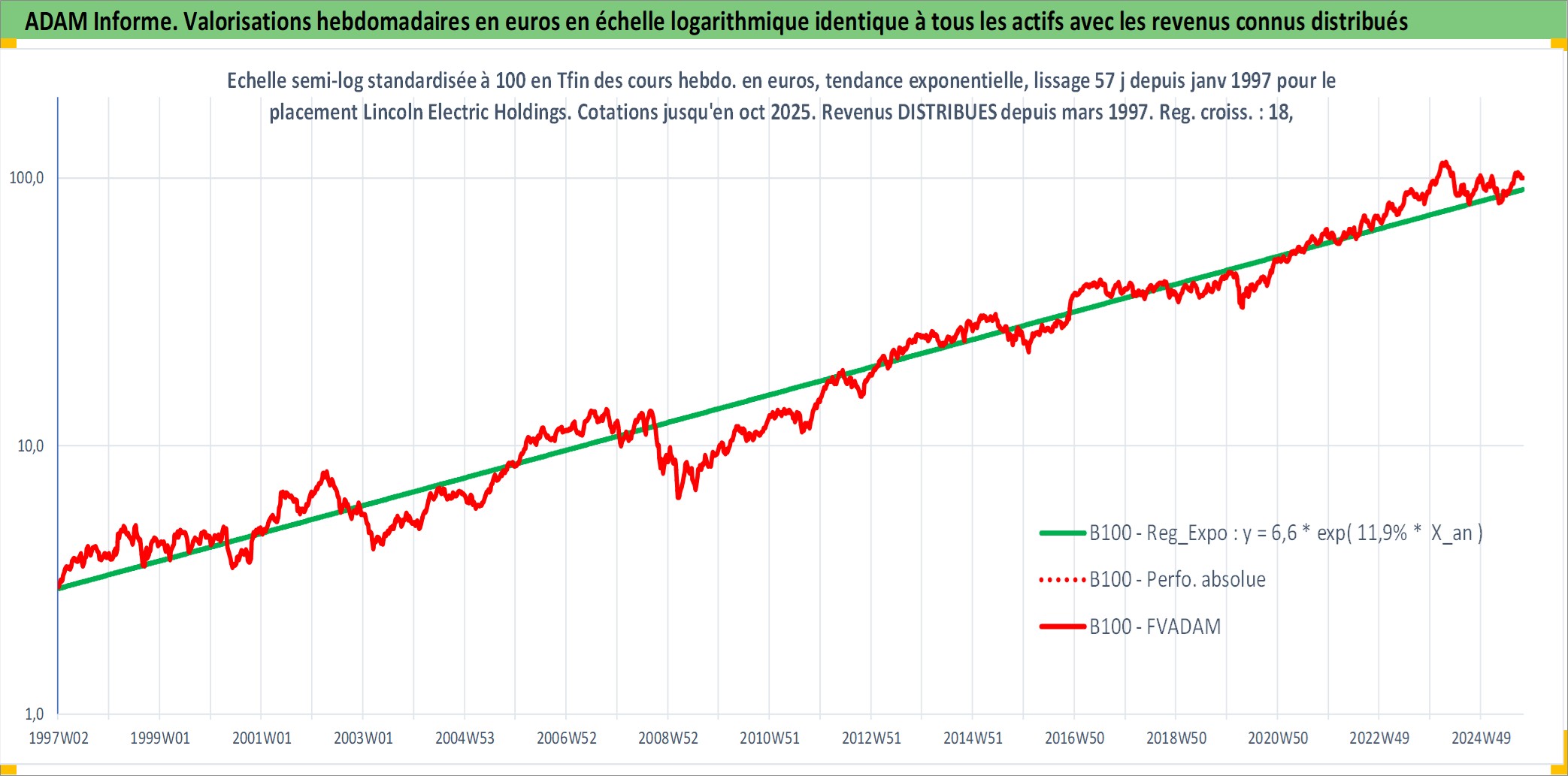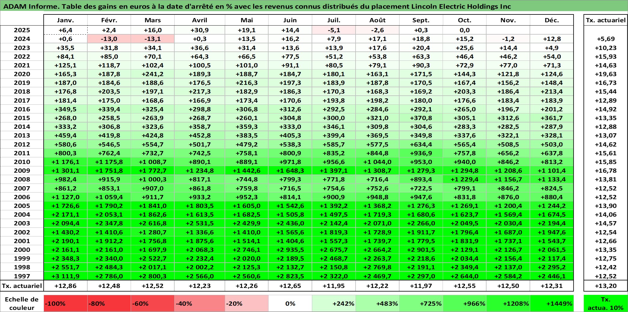 Site dédié aux investisseursPage dédiée sur site financeAnalyse des valorisations hebdomadaires de l'action Lincoln Electric Holdings Inc. Cet actif est cote en USD. Les valorisations sont en contrevaleur EURO et couvrent les semaines 1997W01 a 2025W40. Les revenus de cet actif financier sont pris en compte depuis la semaine 1997W13. La note globale ESG de cet actif est estimee a 9.0 (apres rebasage entre 0 et 20).