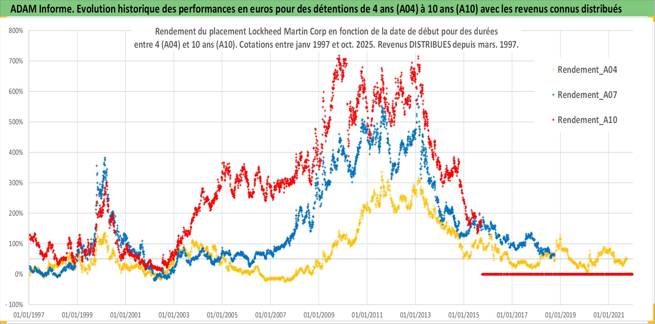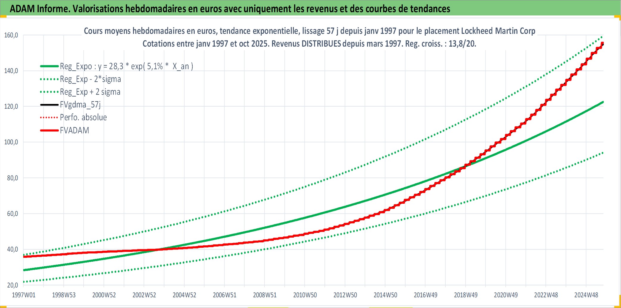 Site dédié aux investisseursPage dédiée sur site financeAnalyse des valorisations hebdomadaires de l'action Lockheed Martin Corp. Cet actif est cote en USD. Les valorisations sont en contrevaleur EURO et couvrent les semaines 1997W01 a 2025W40. Les revenus de cet actif financier sont pris en compte depuis la semaine 1997W10. La note globale ESG de cet actif est estimee a 6.0 (apres rebasage entre 0 et 20).