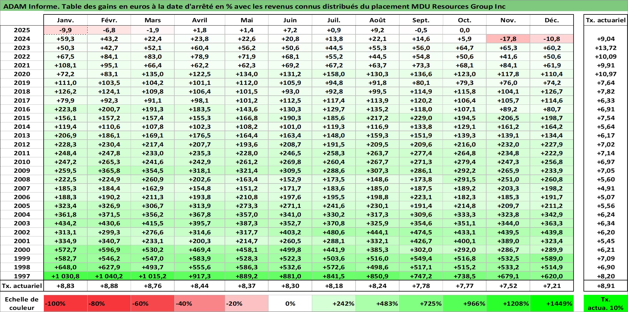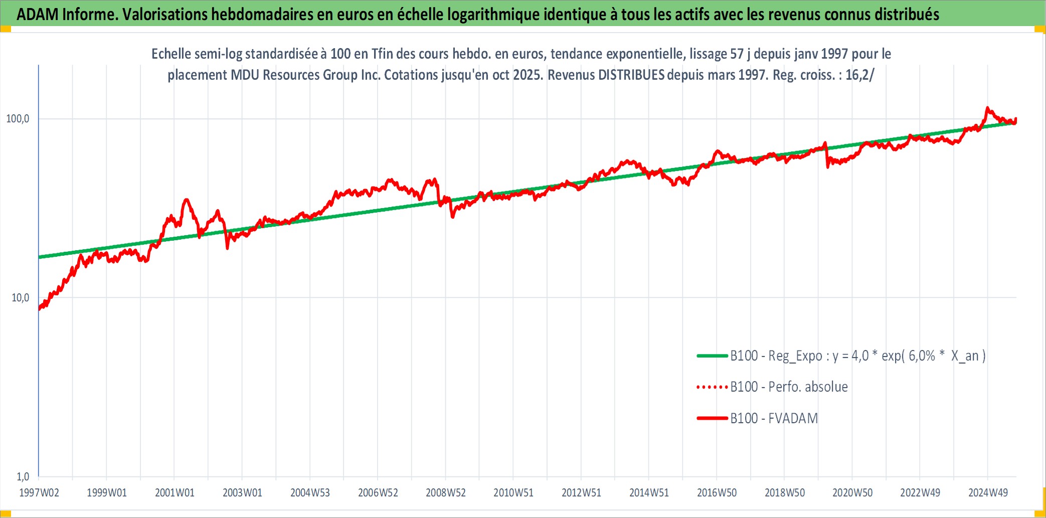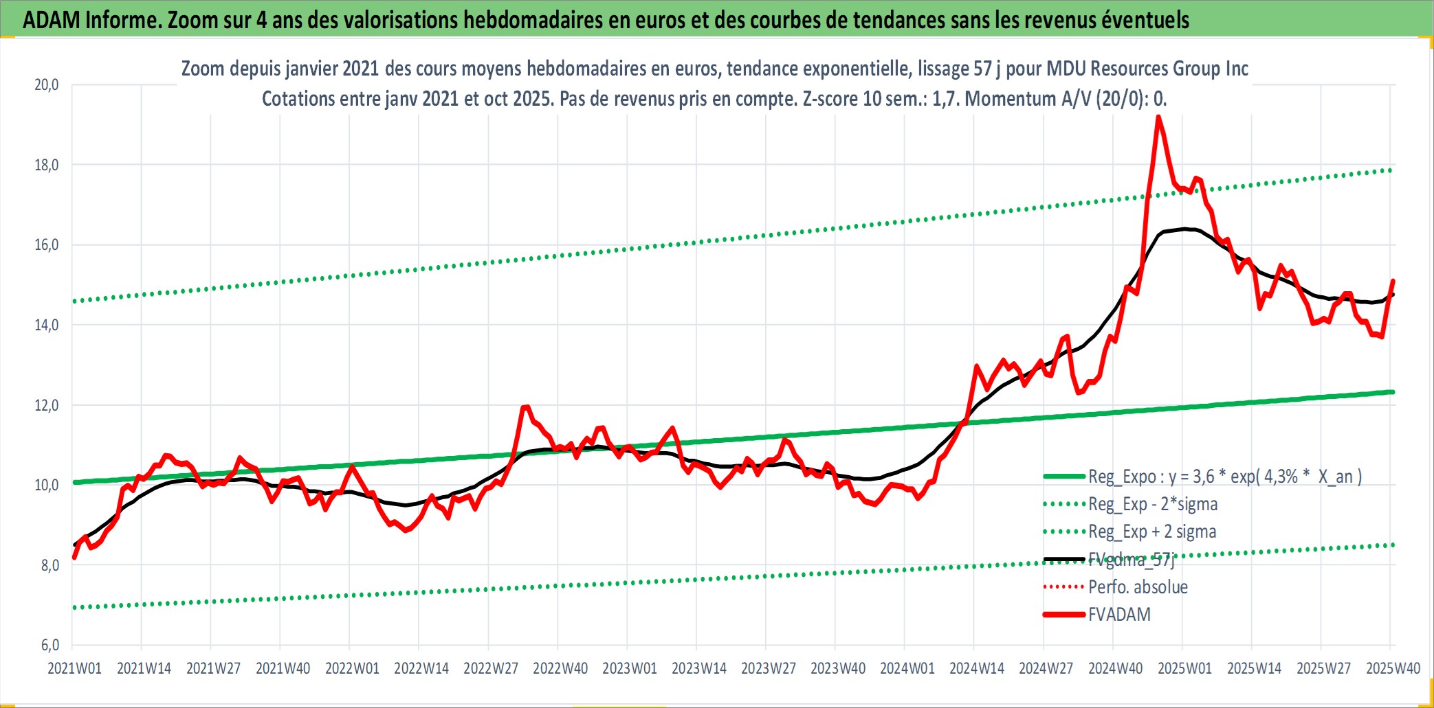 Site dédié aux investisseursPage dédiée sur site financeAnalyse des valorisations hebdomadaires de l'action MDU Resources Group Inc. Cet actif est cote en USD. Les valorisations sont en contrevaleur EURO et couvrent les semaines 1997W01 a 2025W40. Les revenus de cet actif financier sont pris en compte depuis la semaine 1997W11. La note globale ESG de cet actif est estimee a 3.0 (apres rebasage entre 0 et 20).
