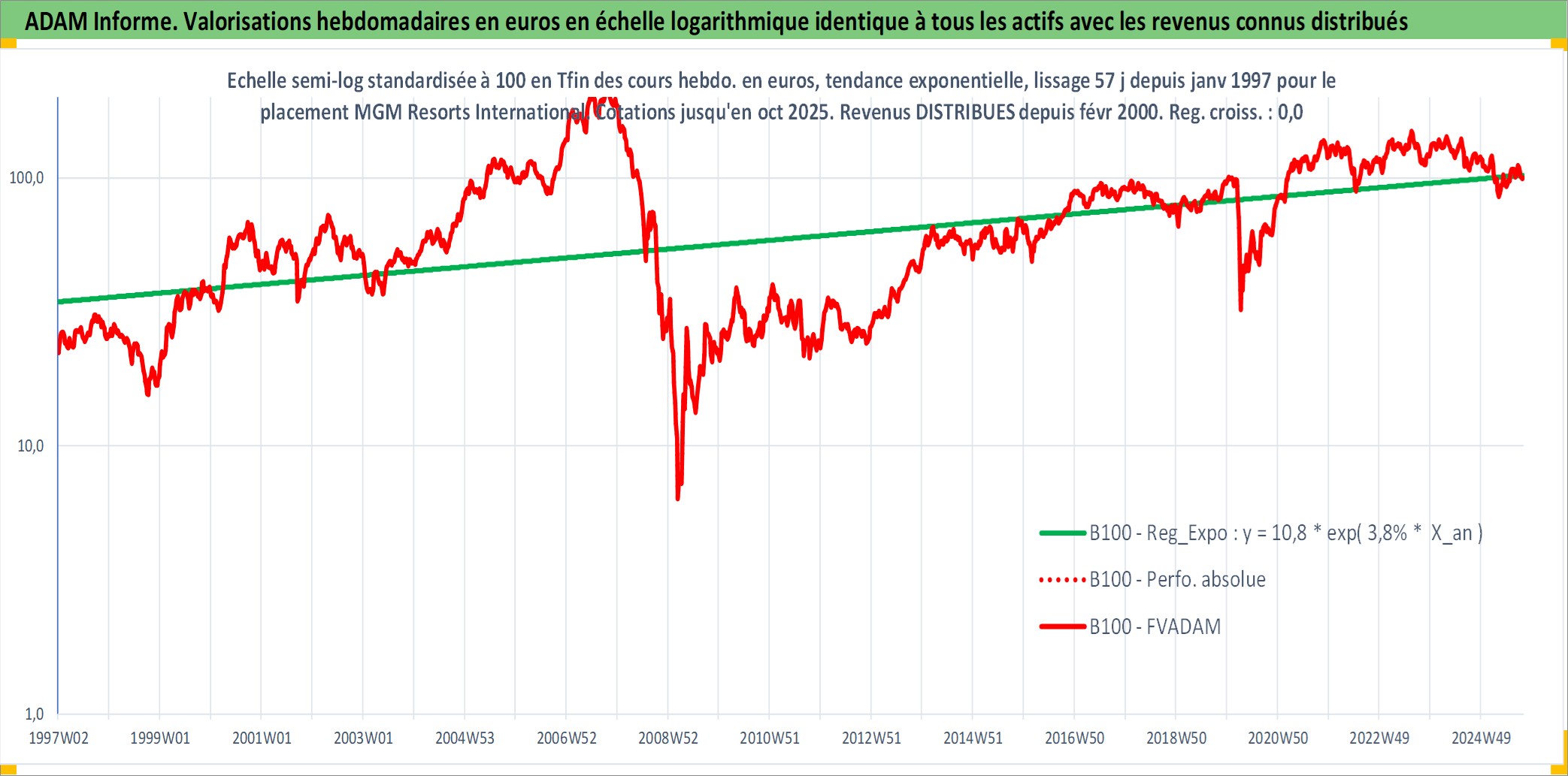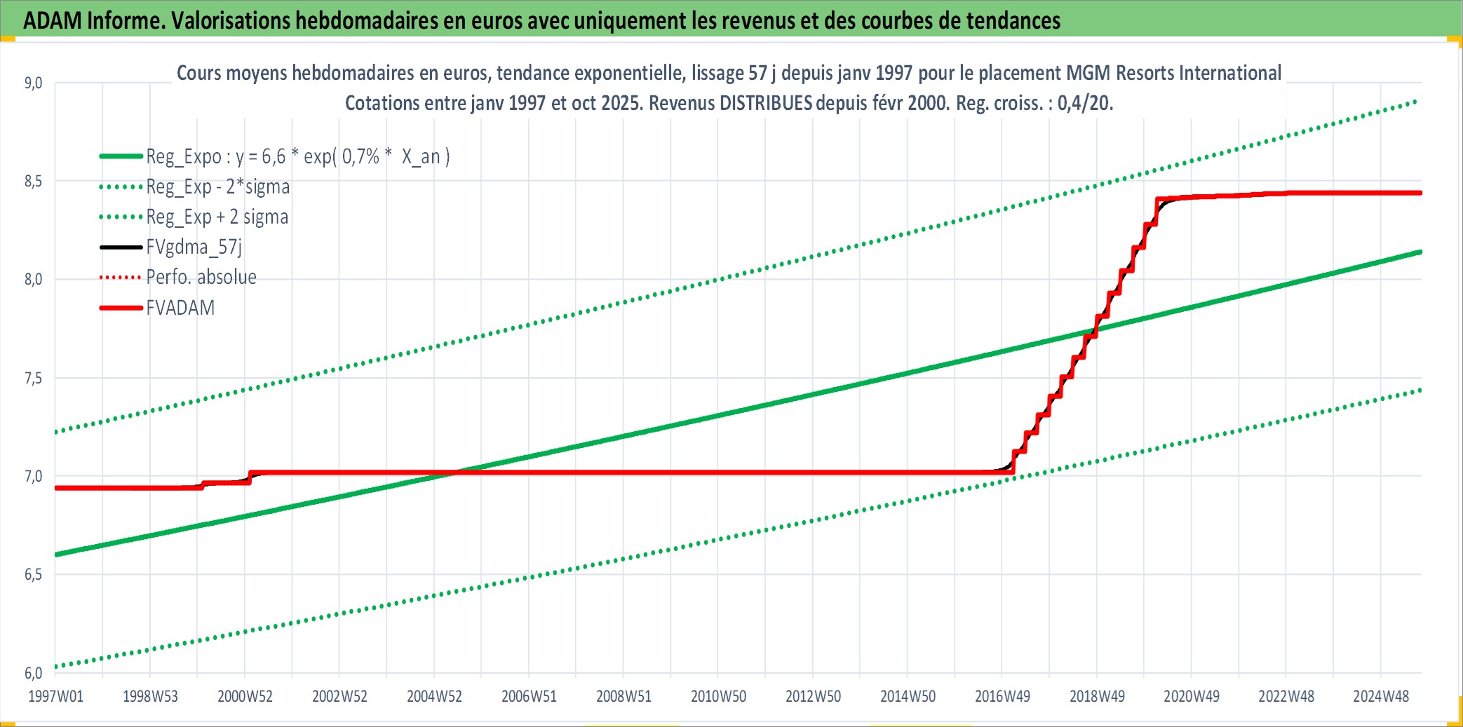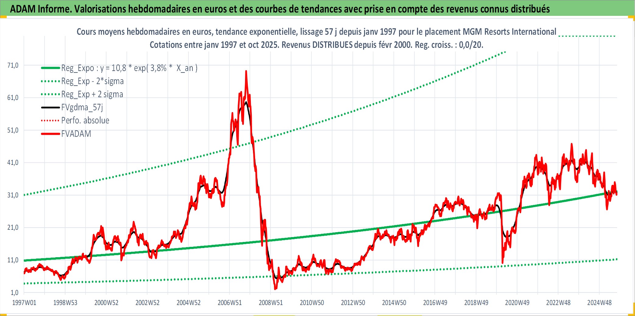 Site dédié aux investisseursPage dédiée sur site financeAnalyse des valorisations hebdomadaires de l'action MGM Resorts International. Cet actif est cote en USD. Les valorisations sont en contrevaleur EURO et couvrent les semaines 1997W01 a 2025W40. Les revenus de cet actif financier sont pris en compte depuis la semaine 2000W06. La note globale ESG de cet actif est estimee a 7.0 (apres rebasage entre 0 et 20).