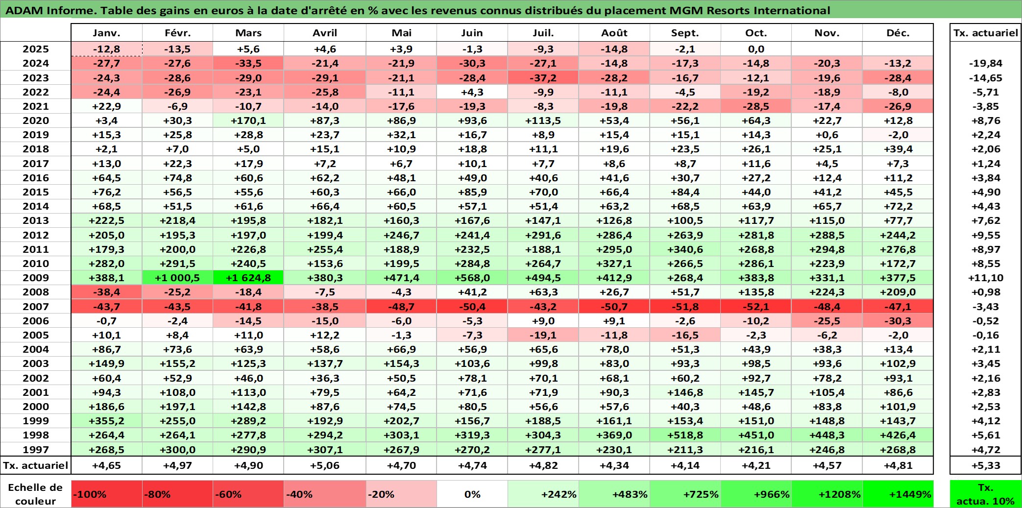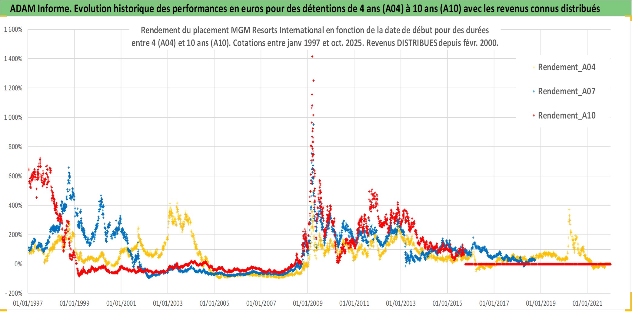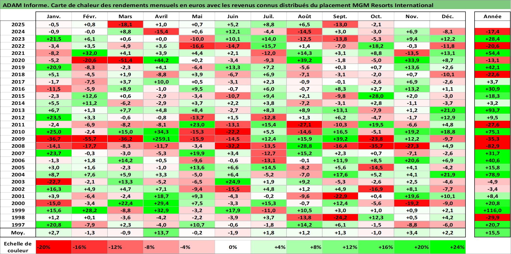 Site dédié aux investisseursPage dédiée sur site financeAnalyse des valorisations hebdomadaires de l'action MGM Resorts International. Cet actif est cote en USD. Les valorisations sont en contrevaleur EURO et couvrent les semaines 1997W01 a 2025W40. Les revenus de cet actif financier sont pris en compte depuis la semaine 2000W06. La note globale ESG de cet actif est estimee a 7.0 (apres rebasage entre 0 et 20).
