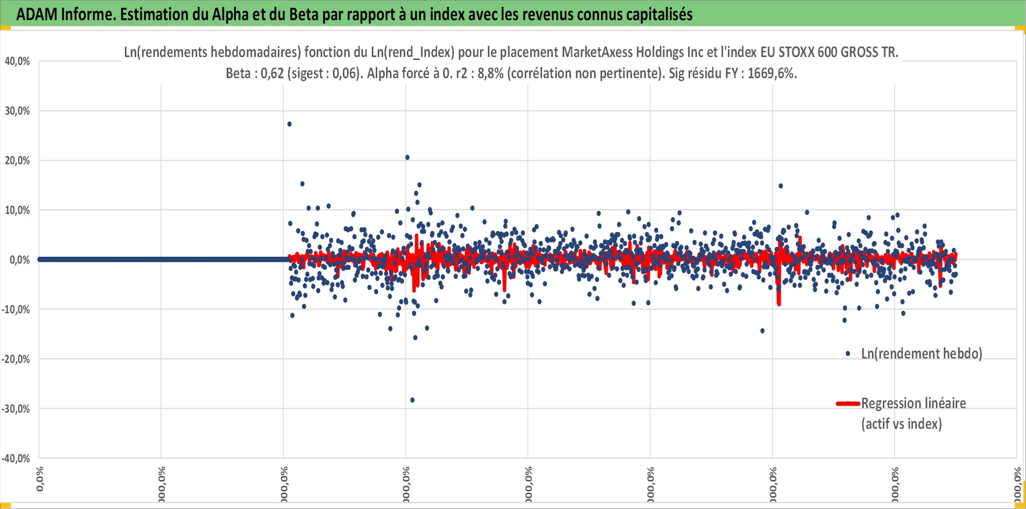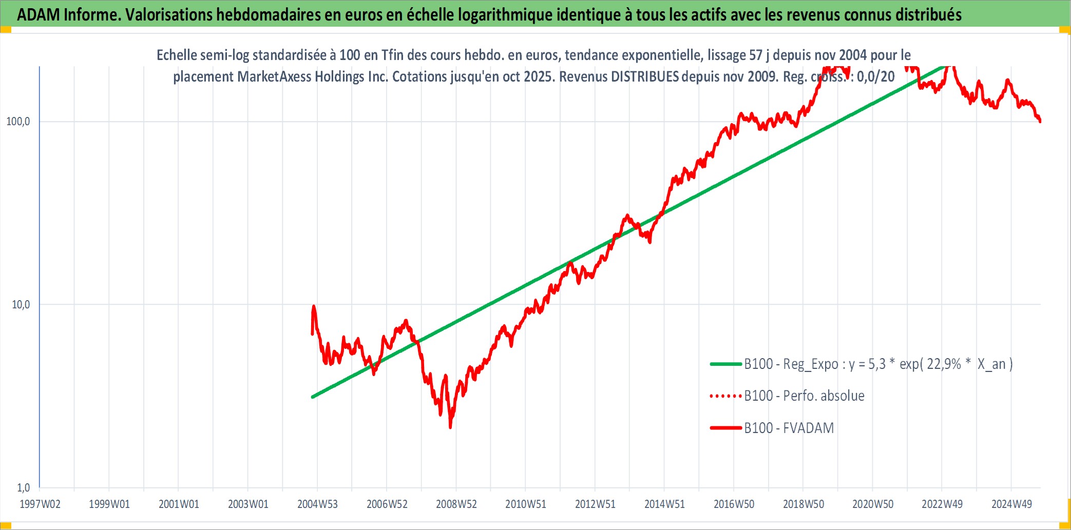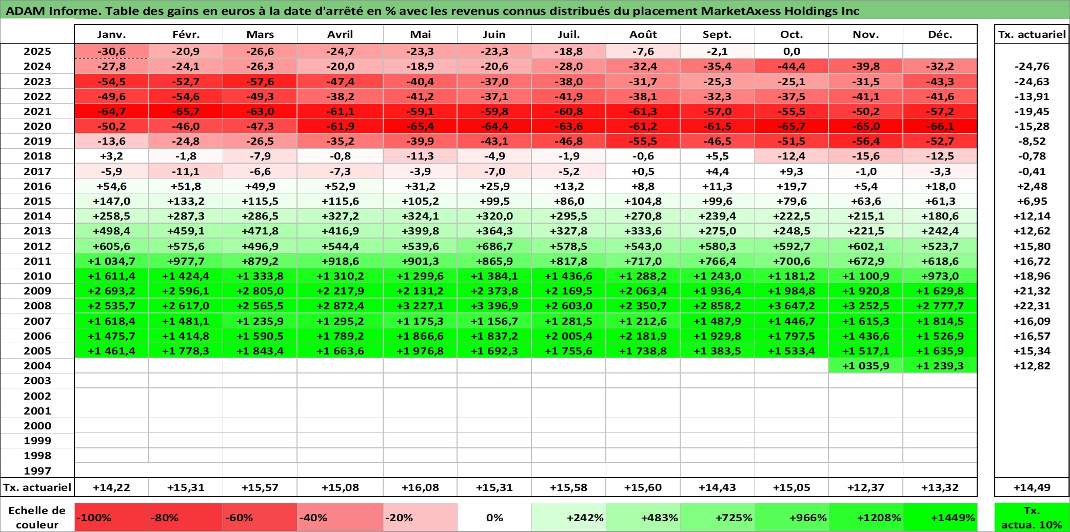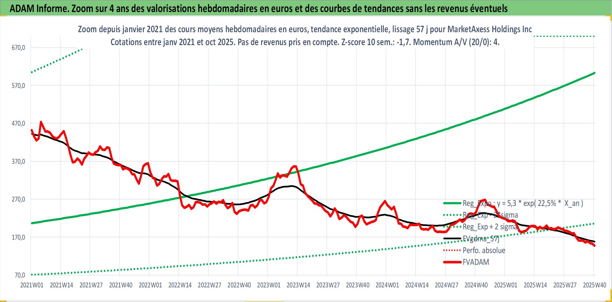 Site dédié aux investisseursPage dédiée sur site financeAnalyse des valorisations hebdomadaires de l'action MarketAxess Holdings Inc. Cet actif est cote en USD. Les valorisations sont en contrevaleur EURO et couvrent les semaines 2004W45 a 2025W40. Les revenus de cet actif financier sont pris en compte depuis la semaine 2009W45. La note ESG de cet actif n'est pas connue.