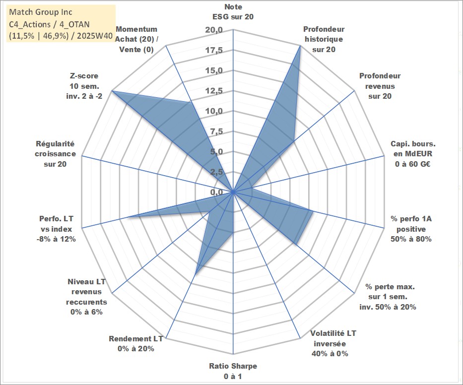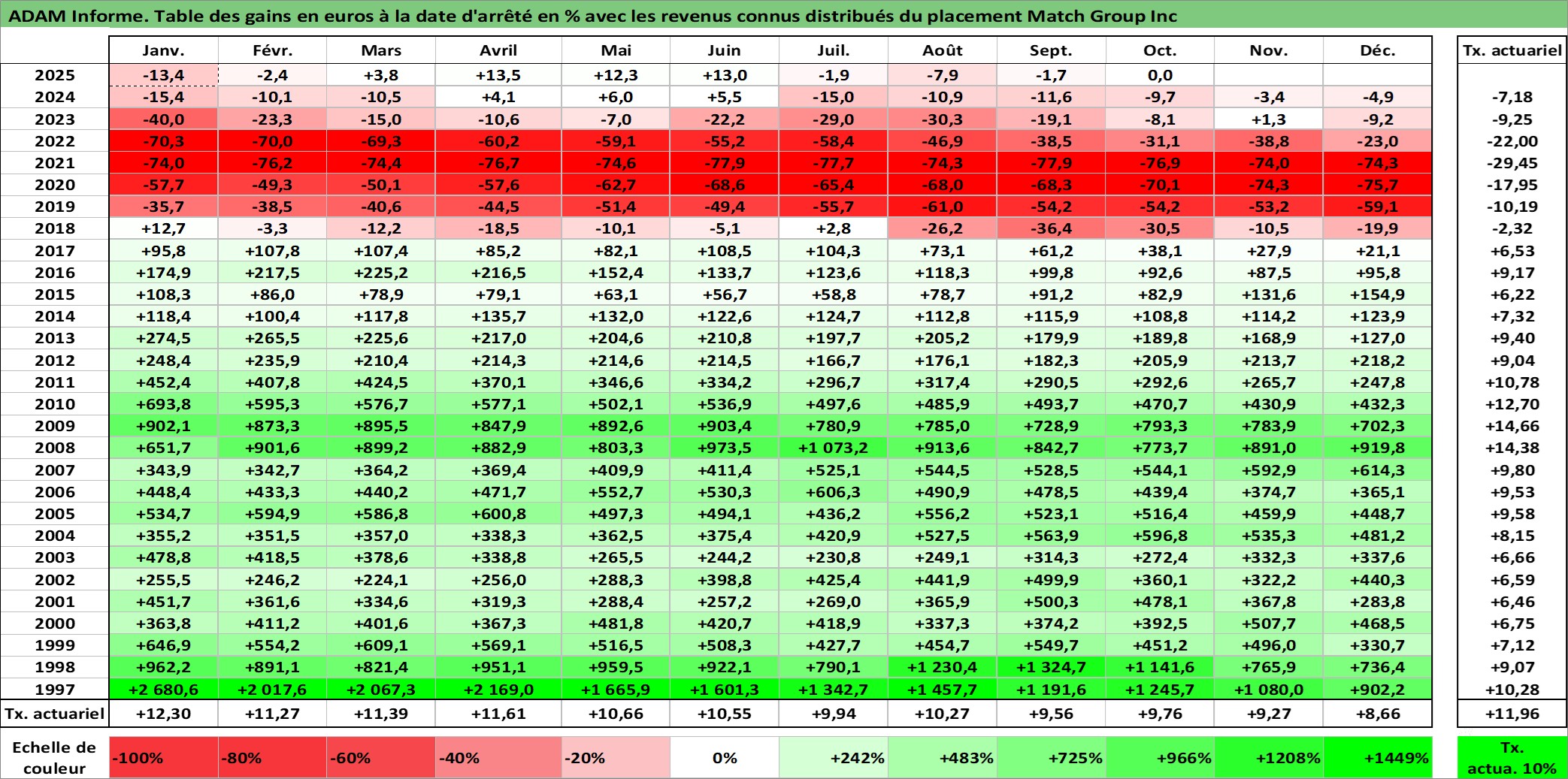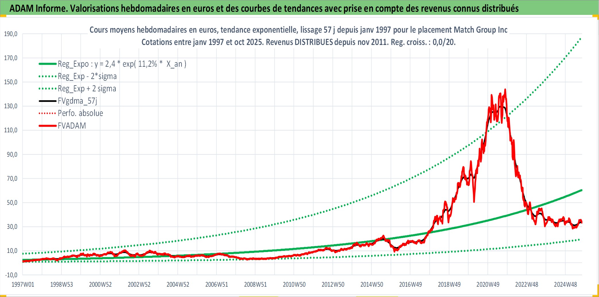 Site dédié aux investisseursPage dédiée sur site financeAnalyse des valorisations hebdomadaires de l'action Match Group Inc. Cet actif est cote en USD. Les valorisations sont en contrevaleur EURO et couvrent les semaines 1997W01 a 2025W40. Les revenus de cet actif financier sont pris en compte depuis la semaine 2011W45. La note ESG de cet actif n'est pas connue.