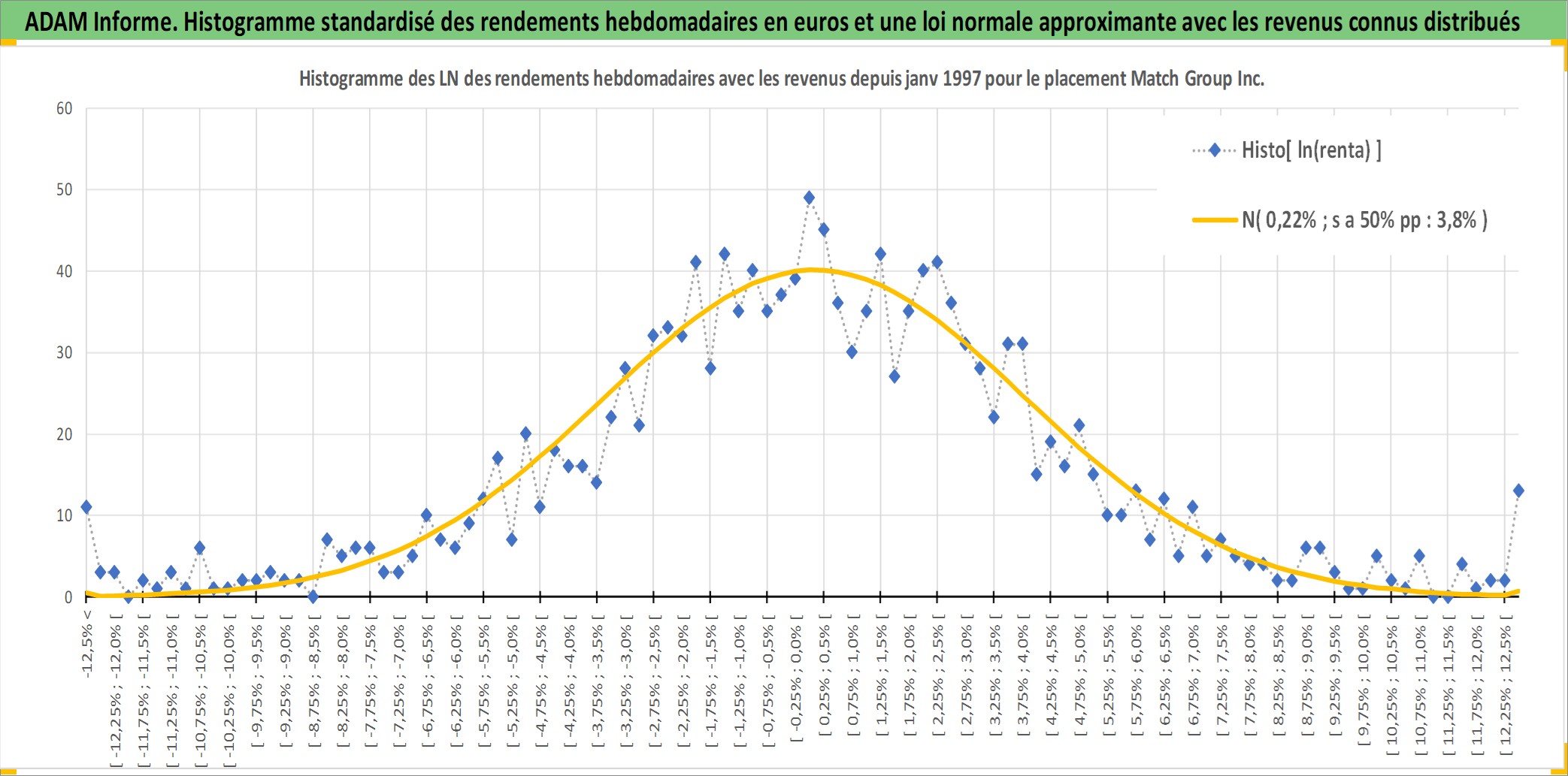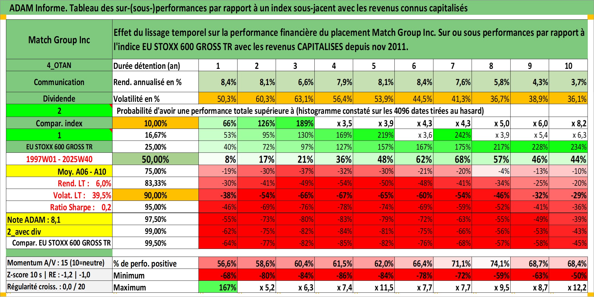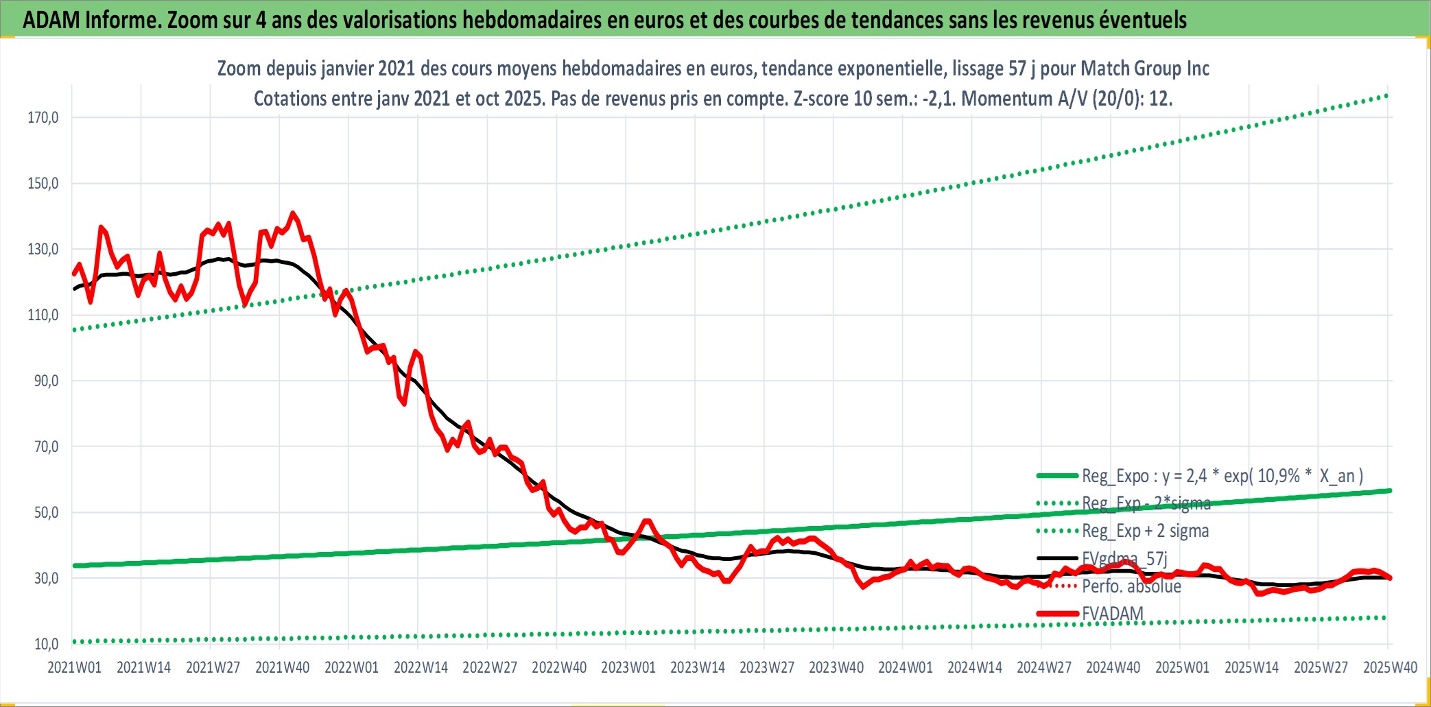 Site dédié aux investisseursPage dédiée sur site financeAnalyse des valorisations hebdomadaires de l'action Match Group Inc. Cet actif est cote en USD. Les valorisations sont en contrevaleur EURO et couvrent les semaines 1997W01 a 2025W40. Les revenus de cet actif financier sont pris en compte depuis la semaine 2011W45. La note ESG de cet actif n'est pas connue.