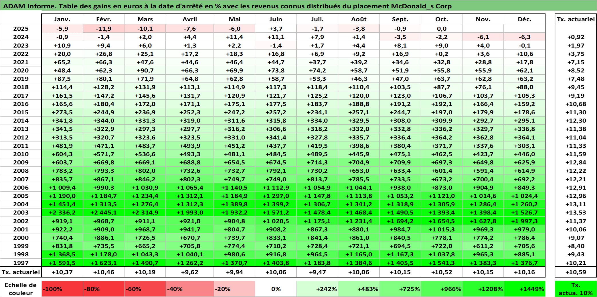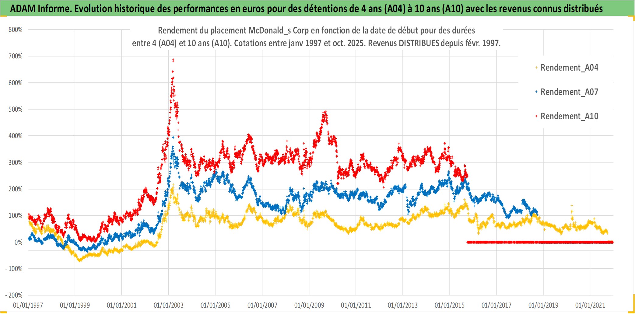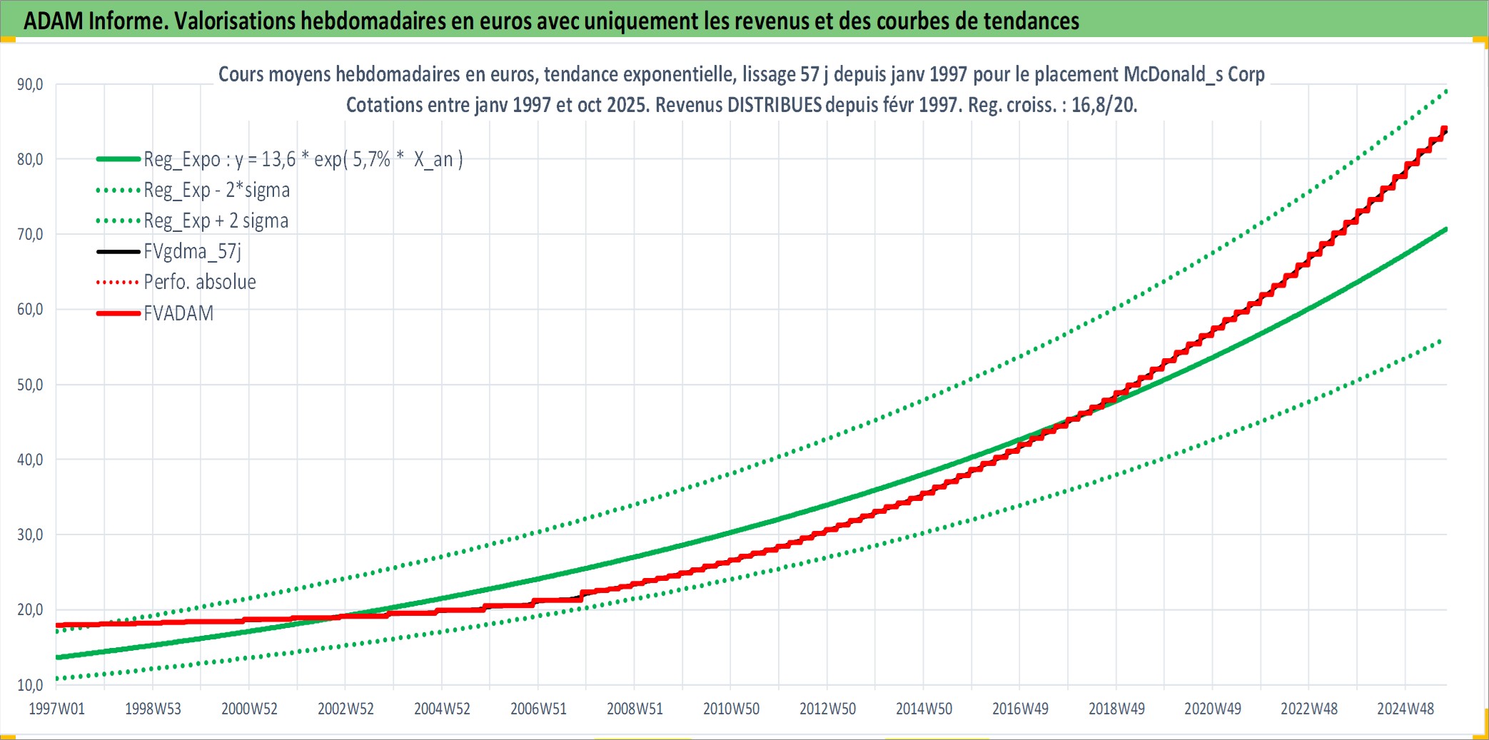 Site dédié aux investisseursPage dédiée sur site financeAnalyse des valorisations hebdomadaires de l'action McDonald_s Corp. Cet actif est cote en USD. Les valorisations sont en contrevaleur EURO et couvrent les semaines 1997W01 a 2025W40. Les revenus de cet actif financier sont pris en compte depuis la semaine 1997W09. La note globale ESG de cet actif est estimee a 7.0 (apres rebasage entre 0 et 20).