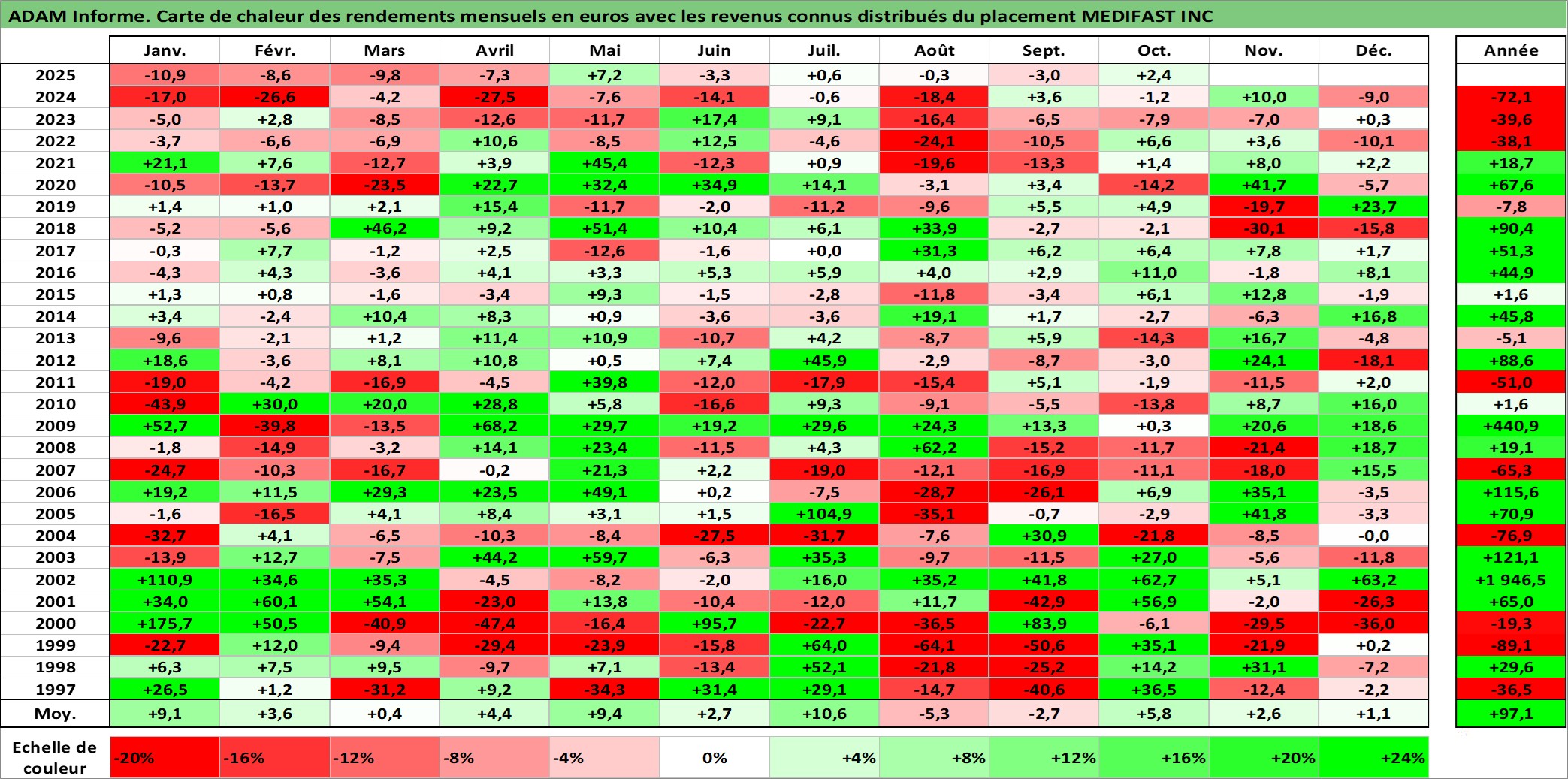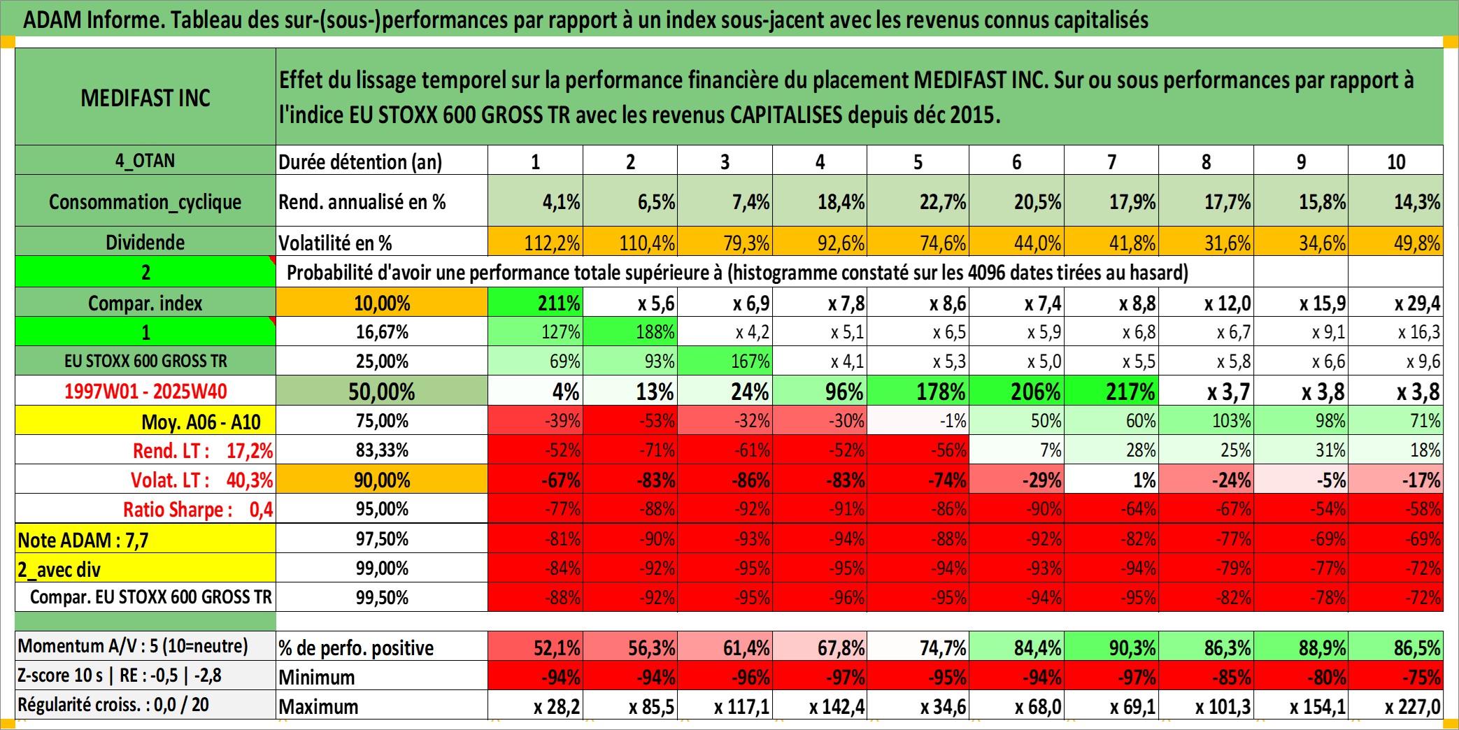 Site dédié aux investisseursPage dédiée sur site financeAnalyse des valorisations hebdomadaires de l'action MEDIFAST INC. Cet actif est cote en USD. Les valorisations sont en contrevaleur EURO et couvrent les semaines 1997W01 a 2025W40. Les revenus de cet actif financier sont pris en compte depuis la semaine 2015W52. La note ESG de cet actif n'est pas connue.