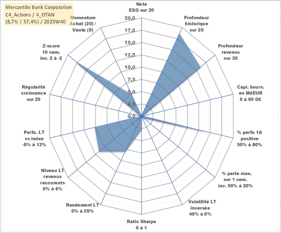 Site dédié aux investisseursPage dédiée sur site financeAnalyse des valorisations hebdomadaires de l'action Mercantile Bank Corporation. Cet actif est cote en USD. Les valorisations sont en contrevaleur EURO et couvrent les semaines 1999W29 a 2025W40. Les revenus de cet actif financier sont pris en compte depuis la semaine 2003W06. La note ESG de cet actif n'est pas connue.