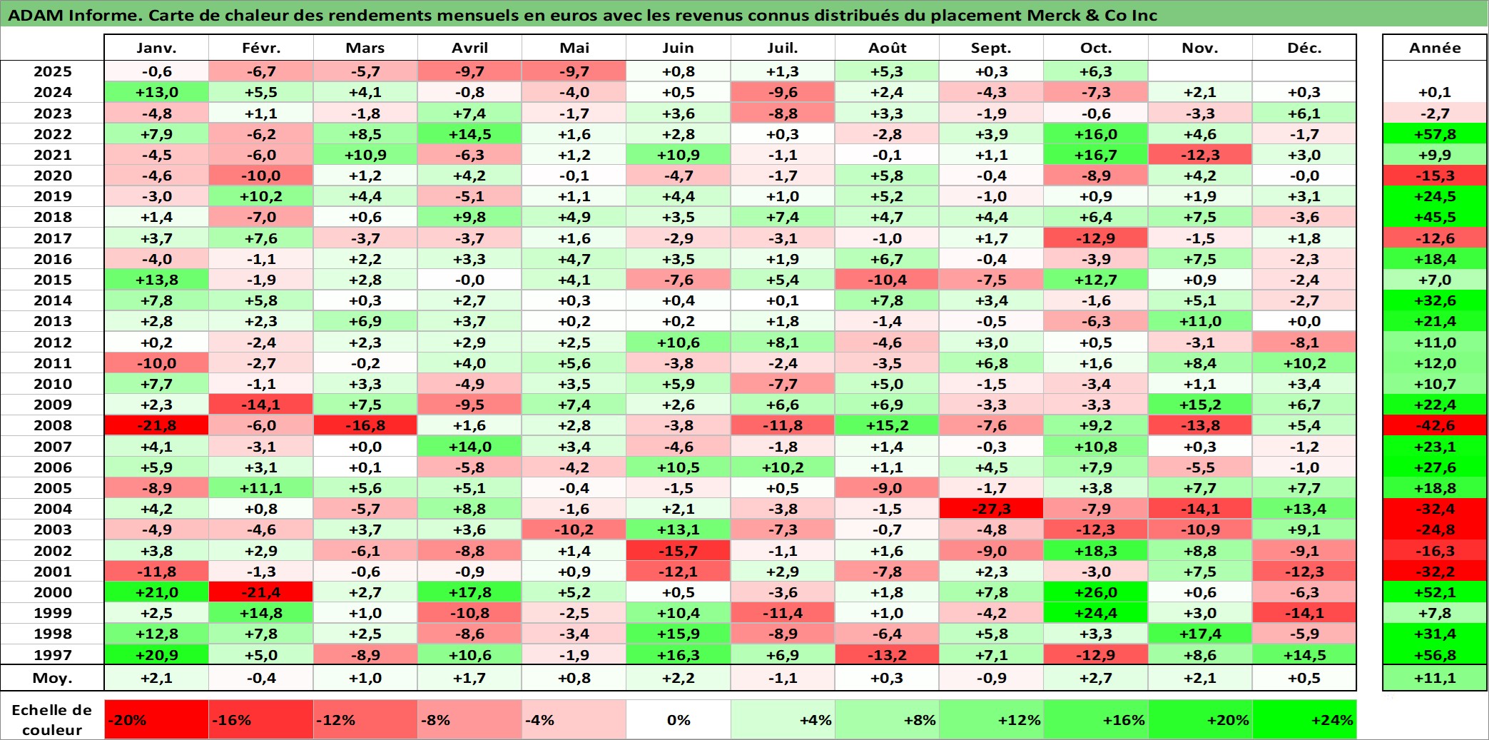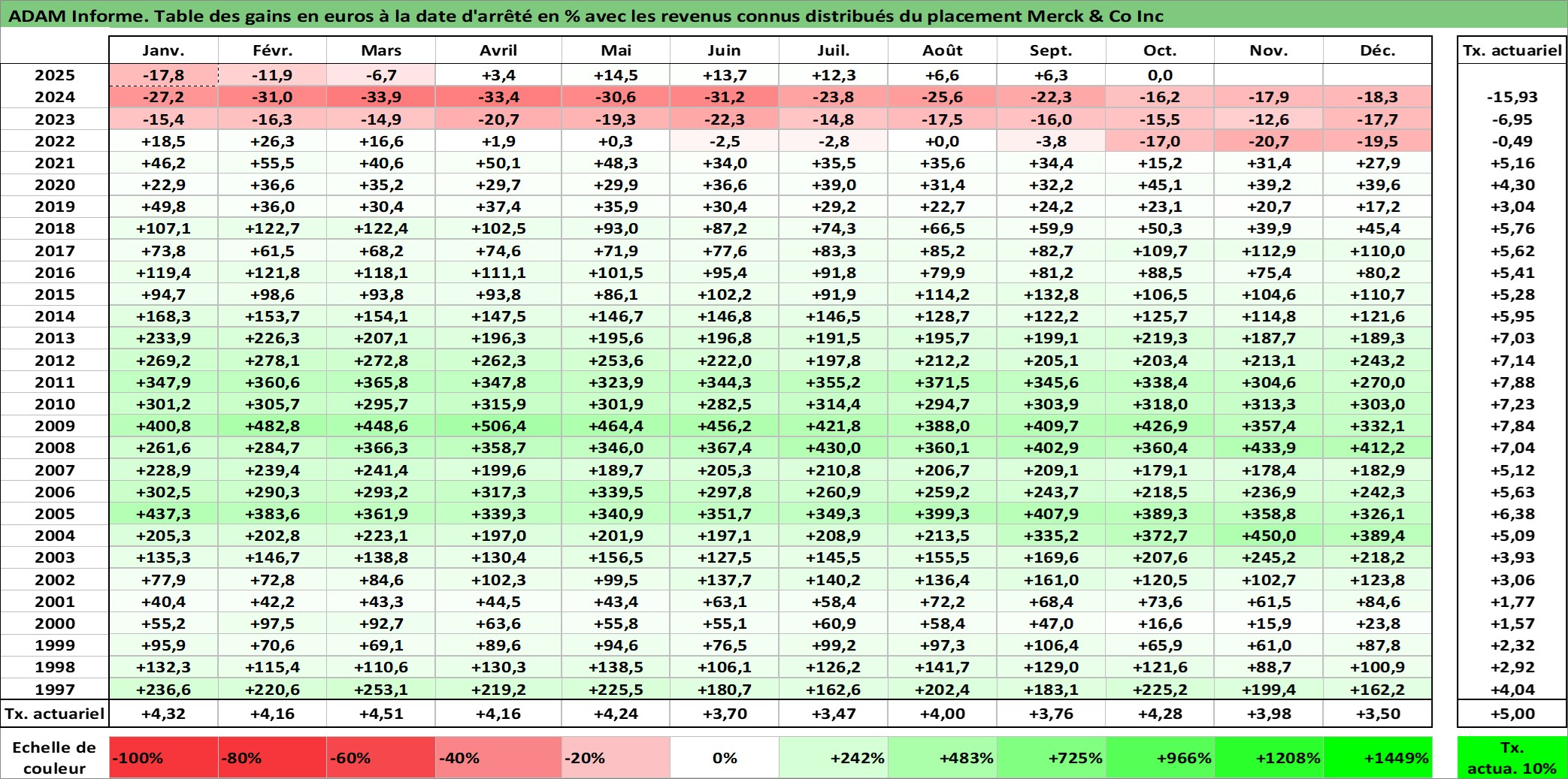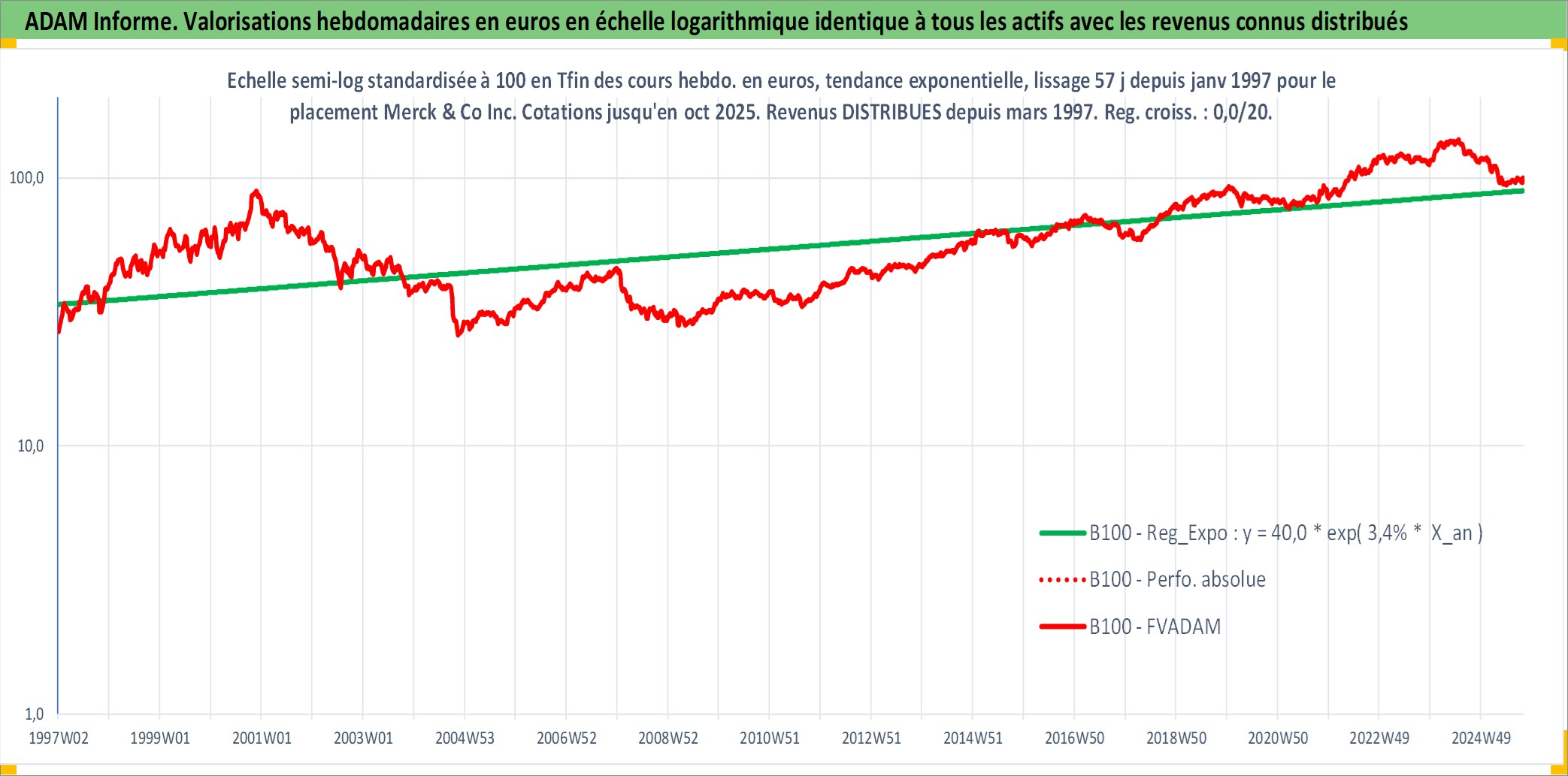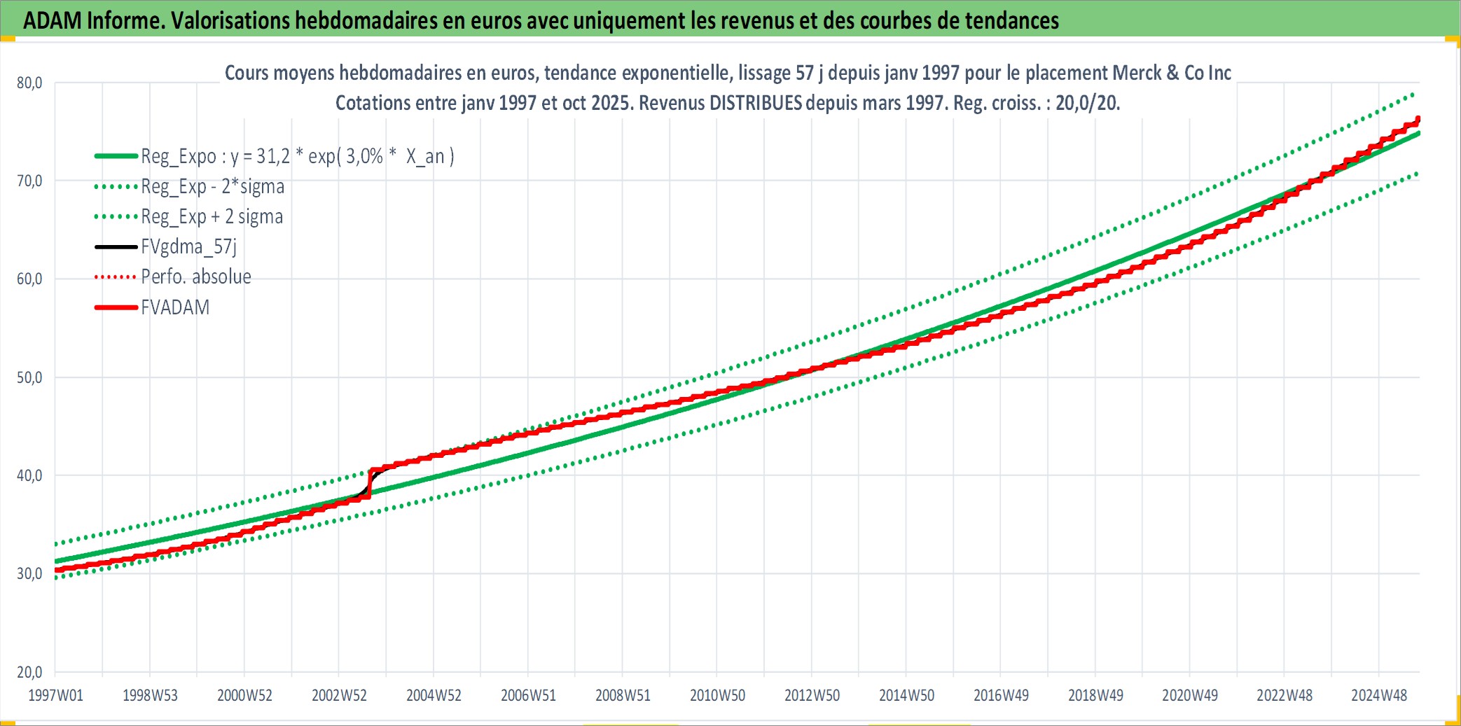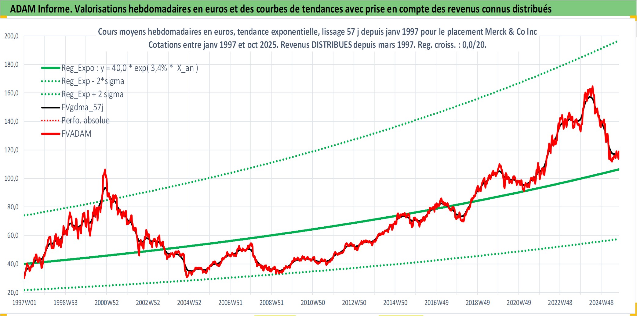Site dédié aux investisseursPage dédiée sur site financeAnalyse des valorisations hebdomadaires de l'action Merck & Co Inc. Cet actif est cote en USD. Les valorisations sont en contrevaleur EURO et couvrent les semaines 1997W01 a 2025W40. Les revenus de cet actif financier sont pris en compte depuis la semaine 1997W10. La note globale ESG de cet actif est estimee a 9.0 (apres rebasage entre 0 et 20).