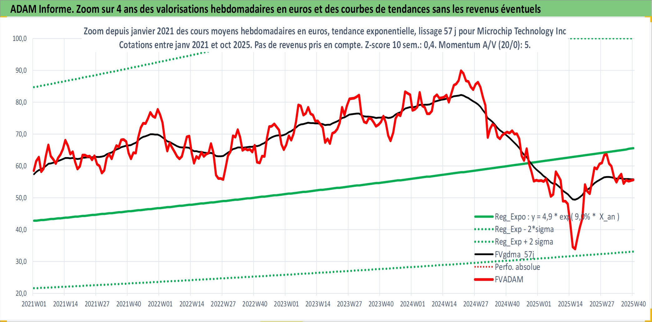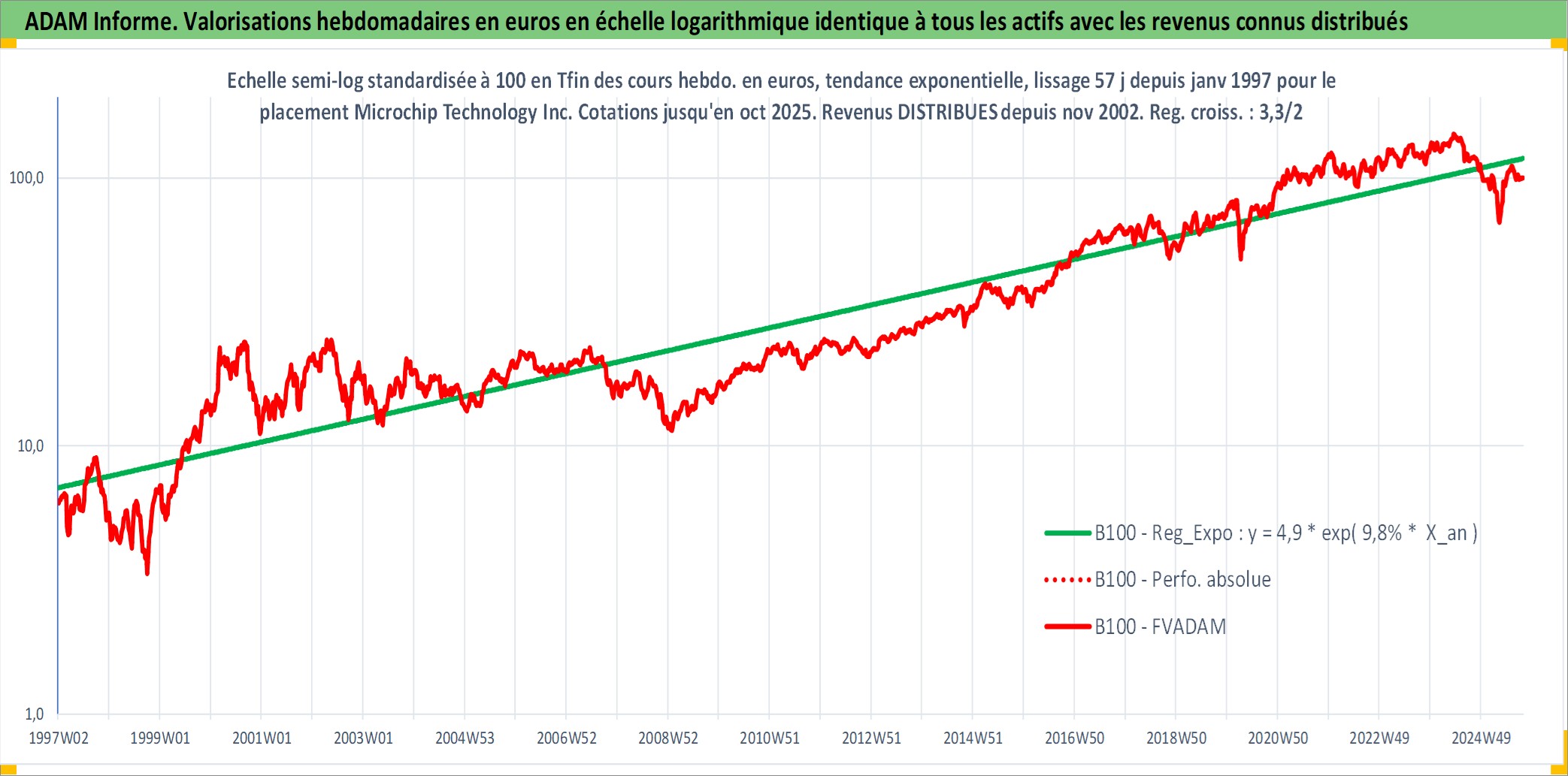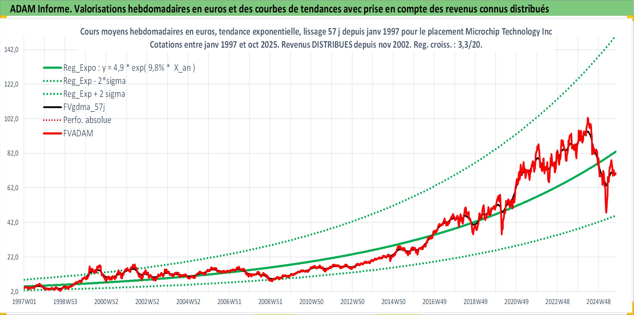 Site dédié aux investisseursPage dédiée sur site financeAnalyse des valorisations hebdomadaires de l'action Microchip Technology Inc. Cet actif est cote en USD. Les valorisations sont en contrevaleur EURO et couvrent les semaines 1997W01 a 2025W40. Les revenus de cet actif financier sont pris en compte depuis la semaine 2002W45. La note globale ESG de cet actif est estimee a 5.0 (apres rebasage entre 0 et 20).