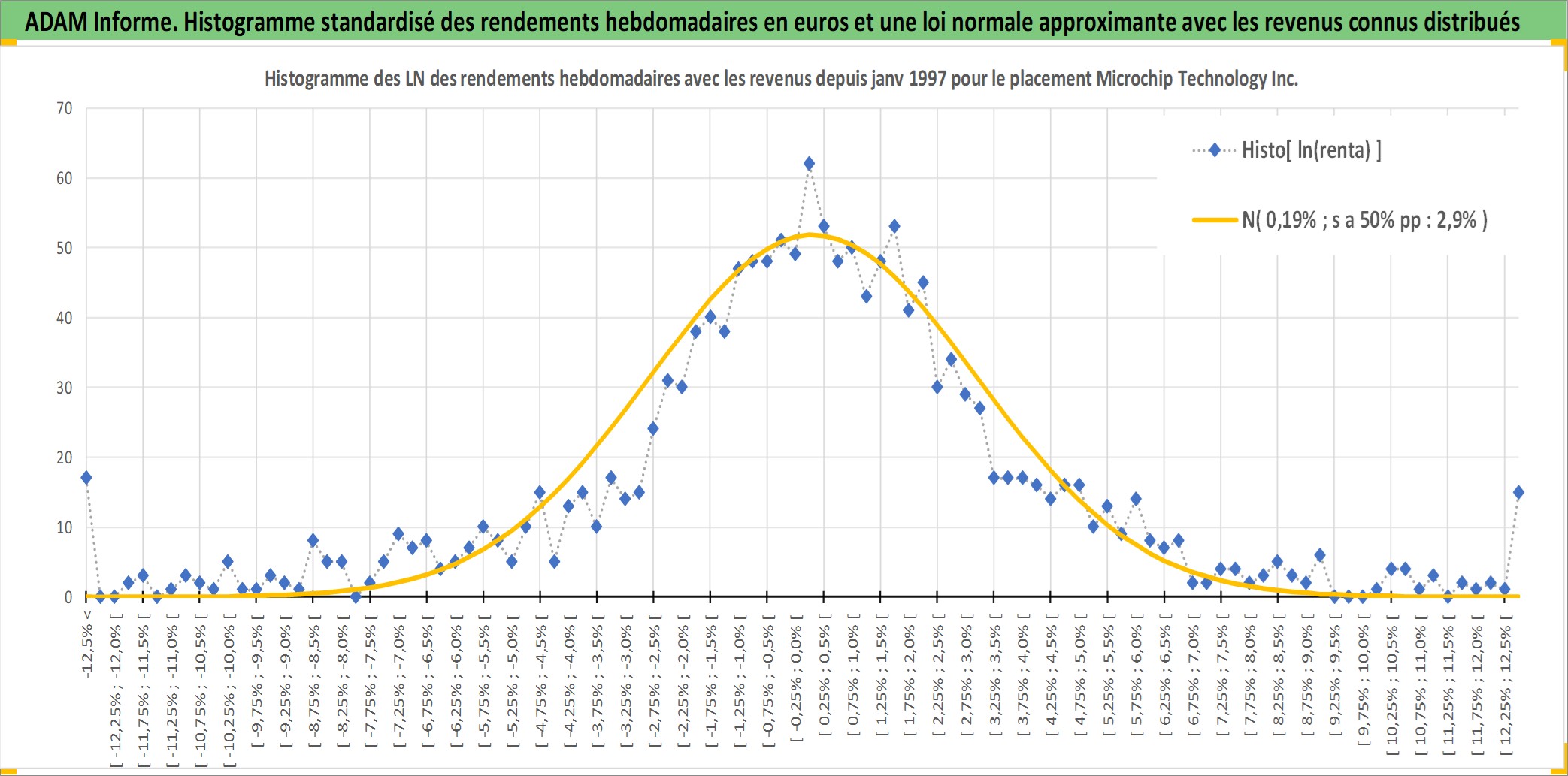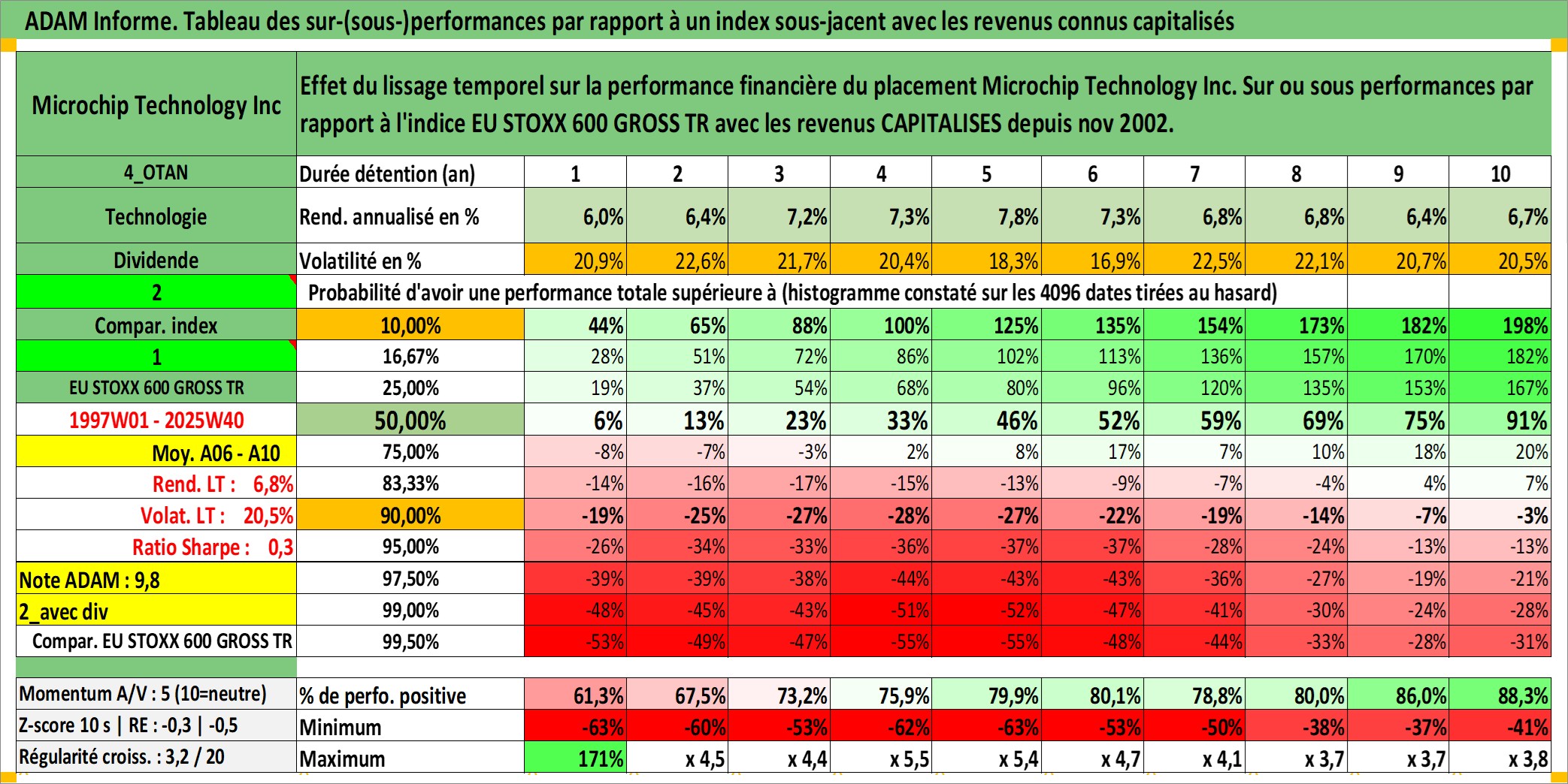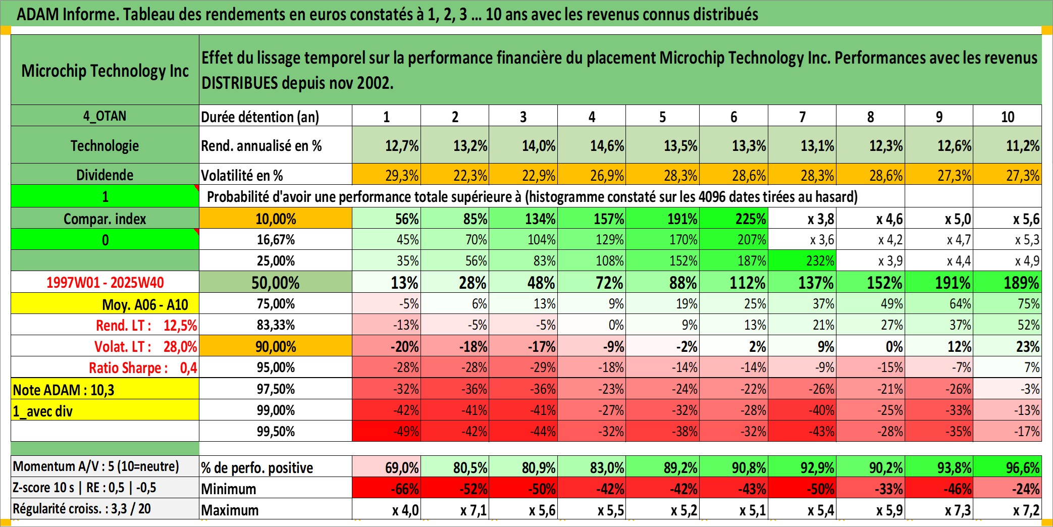 Site dédié aux investisseursPage dédiée sur site financeAnalyse des valorisations hebdomadaires de l'action Microchip Technology Inc. Cet actif est cote en USD. Les valorisations sont en contrevaleur EURO et couvrent les semaines 1997W01 a 2025W40. Les revenus de cet actif financier sont pris en compte depuis la semaine 2002W45. La note globale ESG de cet actif est estimee a 5.0 (apres rebasage entre 0 et 20).