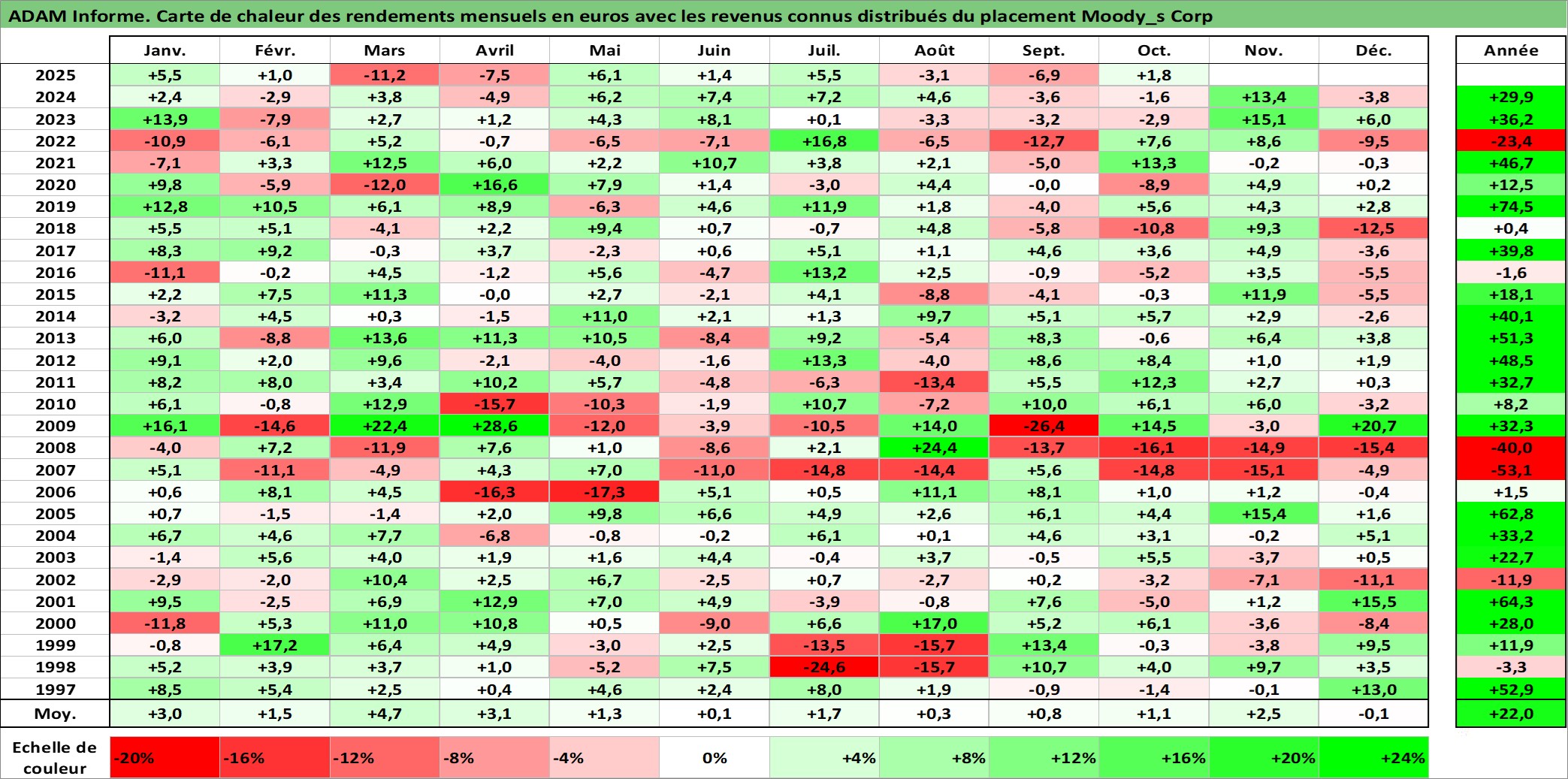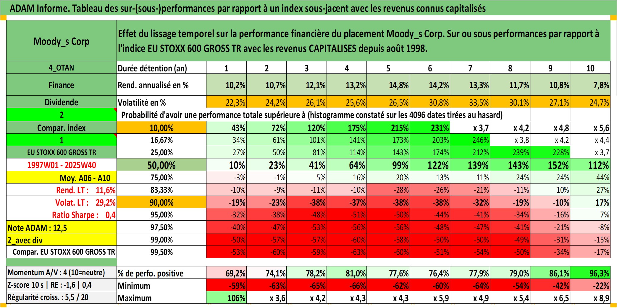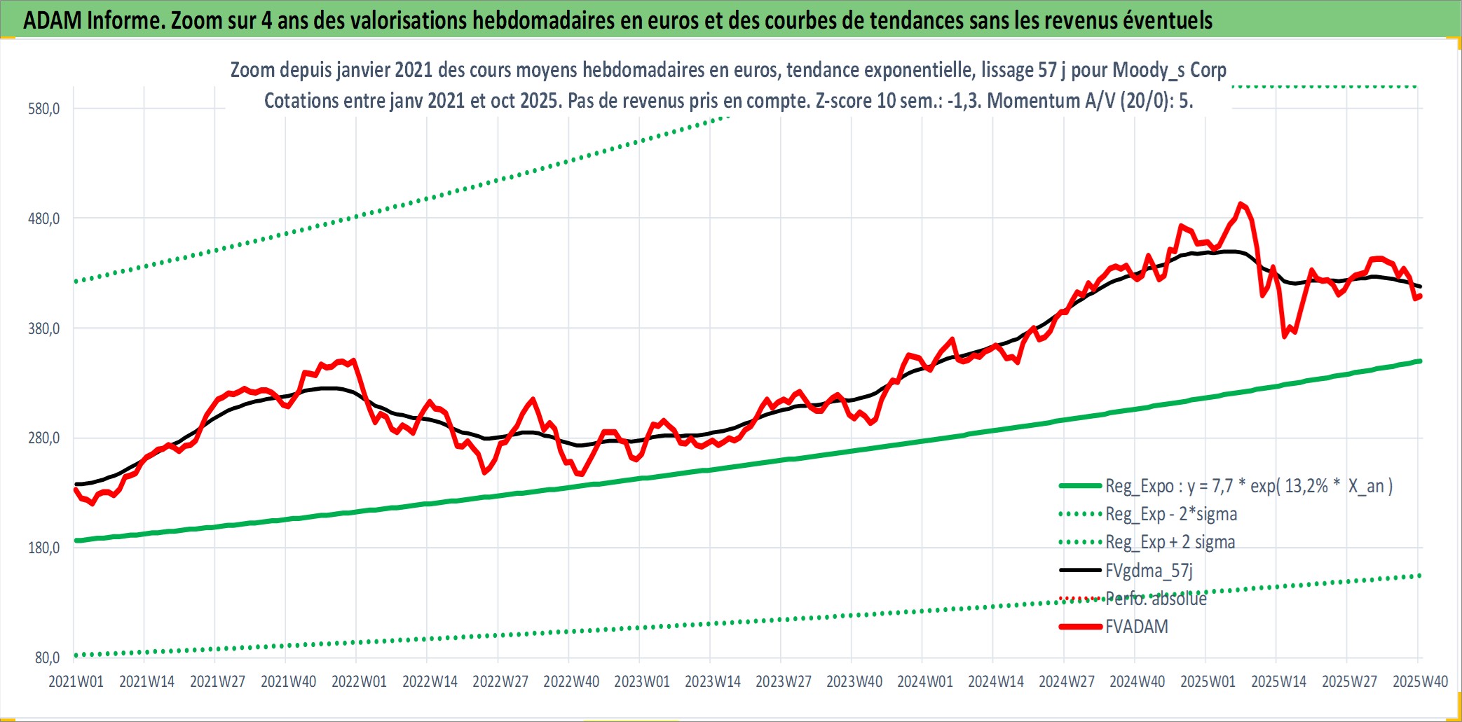 Site dédié aux investisseursPage dédiée sur site financeAnalyse des valorisations hebdomadaires de l'action Moody_s Corp. Cet actif est cote en USD. Les valorisations sont en contrevaleur EURO et couvrent les semaines 1997W01 a 2025W40. Les revenus de cet actif financier sont pris en compte depuis la semaine 1998W34. La note globale ESG de cet actif est estimee a 17.0 (apres rebasage entre 0 et 20).