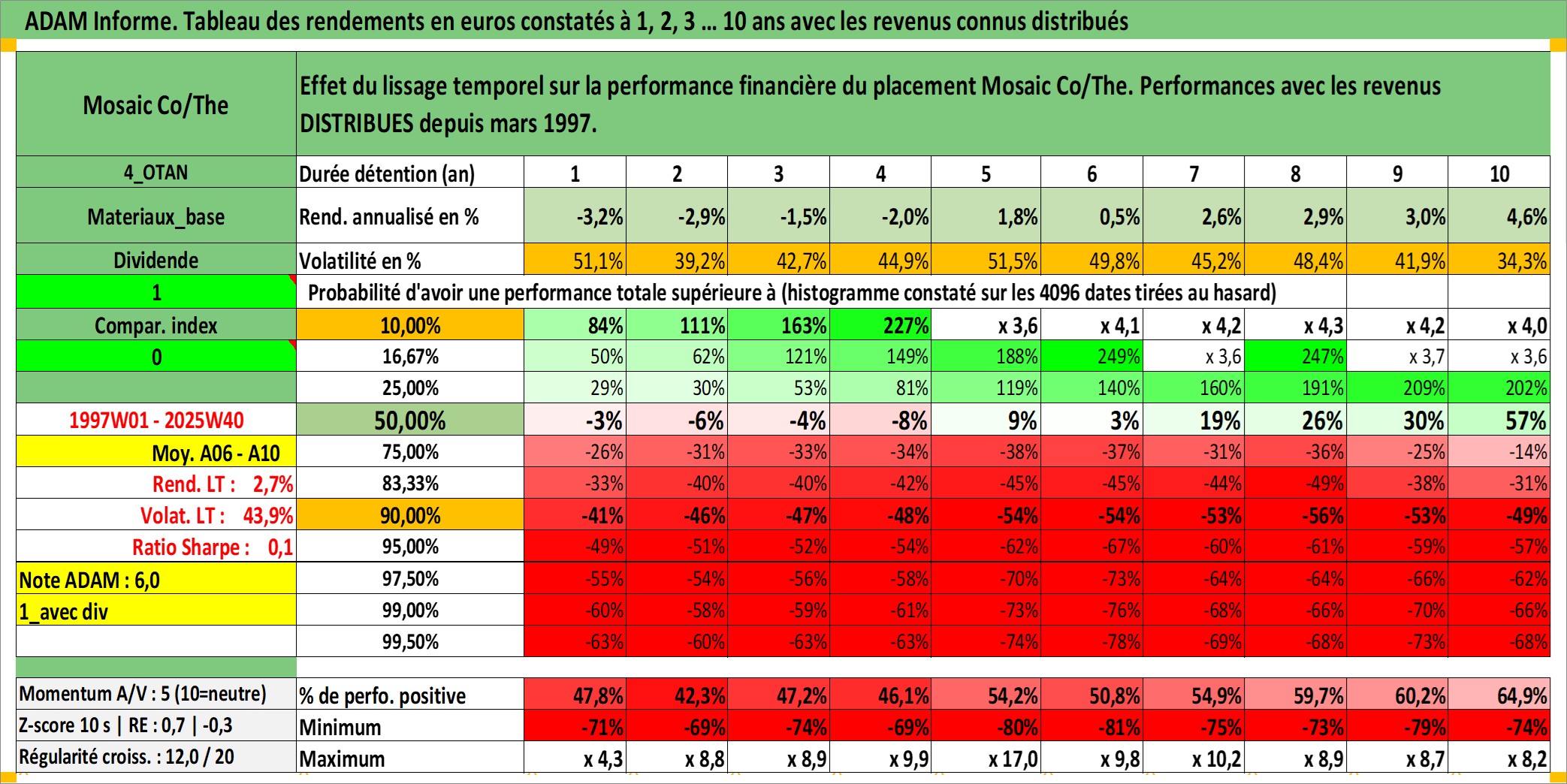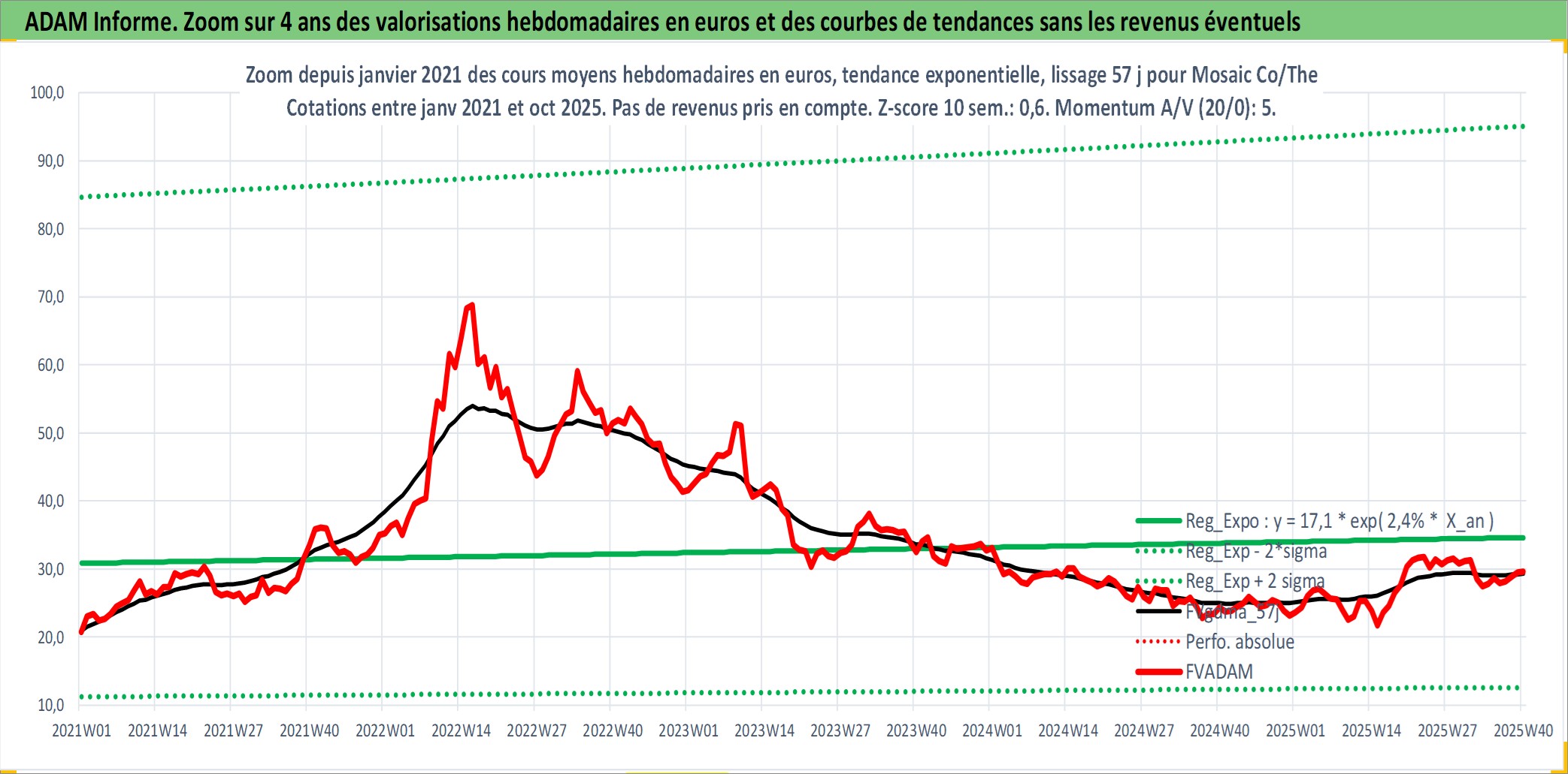 Site dédié aux investisseursPage dédiée sur site financeAnalyse des valorisations hebdomadaires de l'action Mosaic Co/The. Cet actif est cote en USD. Les valorisations sont en contrevaleur EURO et couvrent les semaines 1997W01 a 2025W40. Les revenus de cet actif financier sont pris en compte depuis la semaine 1997W11. La note globale ESG de cet actif est estimee a 4.0 (apres rebasage entre 0 et 20).