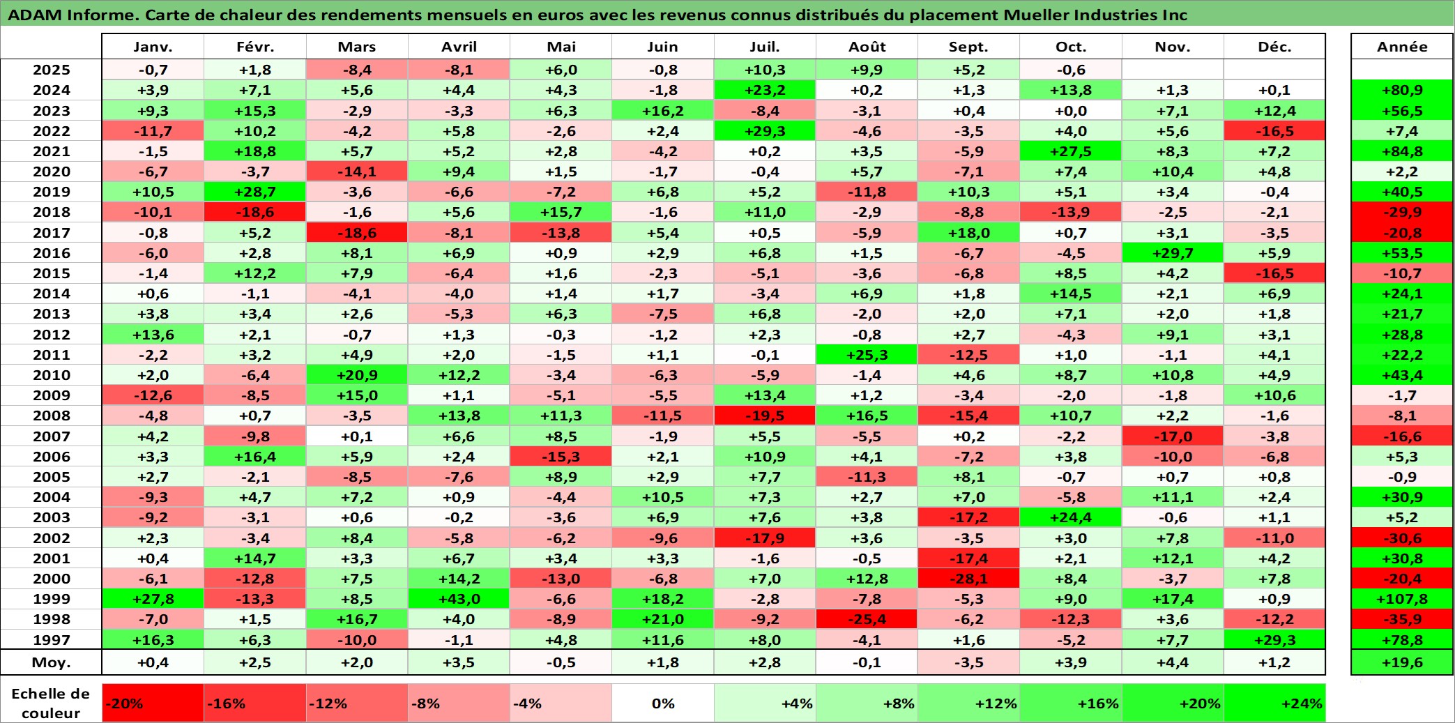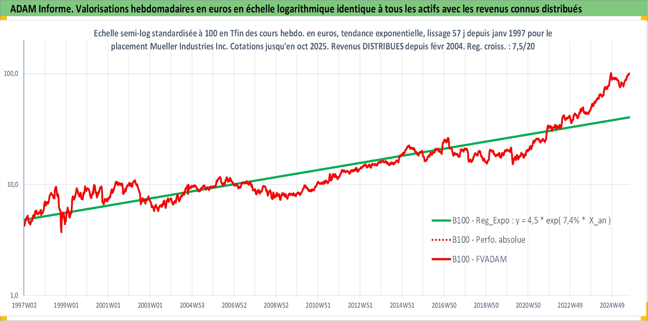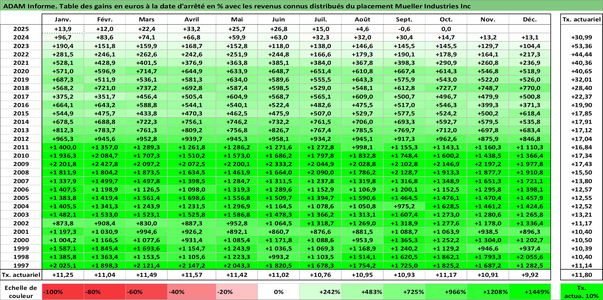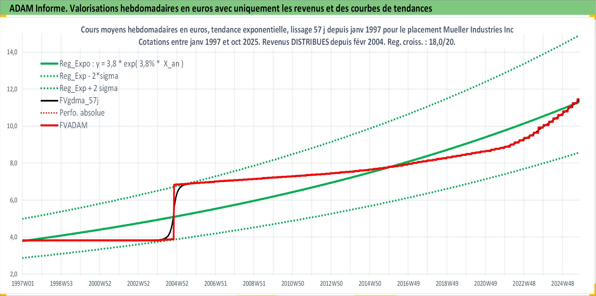 Site dédié aux investisseursPage dédiée sur site financeAnalyse des valorisations hebdomadaires de l'action Mueller Industries Inc. Cet actif est cote en USD. Les valorisations sont en contrevaleur EURO et couvrent les semaines 1997W01 a 2025W40. Les revenus de cet actif financier sont pris en compte depuis la semaine 2004W09. La note ESG de cet actif n'est pas connue.