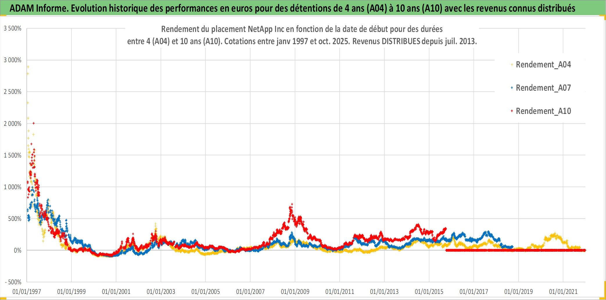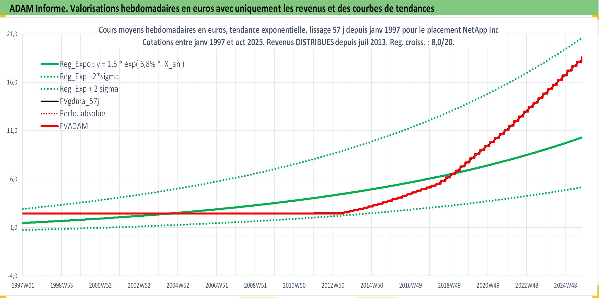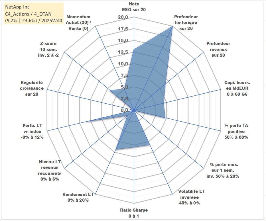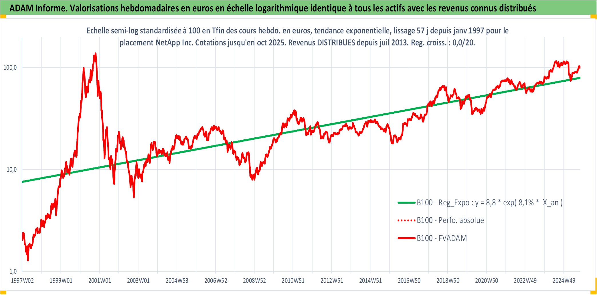 Site dédié aux investisseursPage dédiée sur site financeAnalyse des valorisations hebdomadaires de l'action NetApp Inc. Cet actif est cote en USD. Les valorisations sont en contrevaleur EURO et couvrent les semaines 1997W01 a 2025W40. Les revenus de cet actif financier sont pris en compte depuis la semaine 2013W28. La note globale ESG de cet actif est estimee a 13.0 (apres rebasage entre 0 et 20).