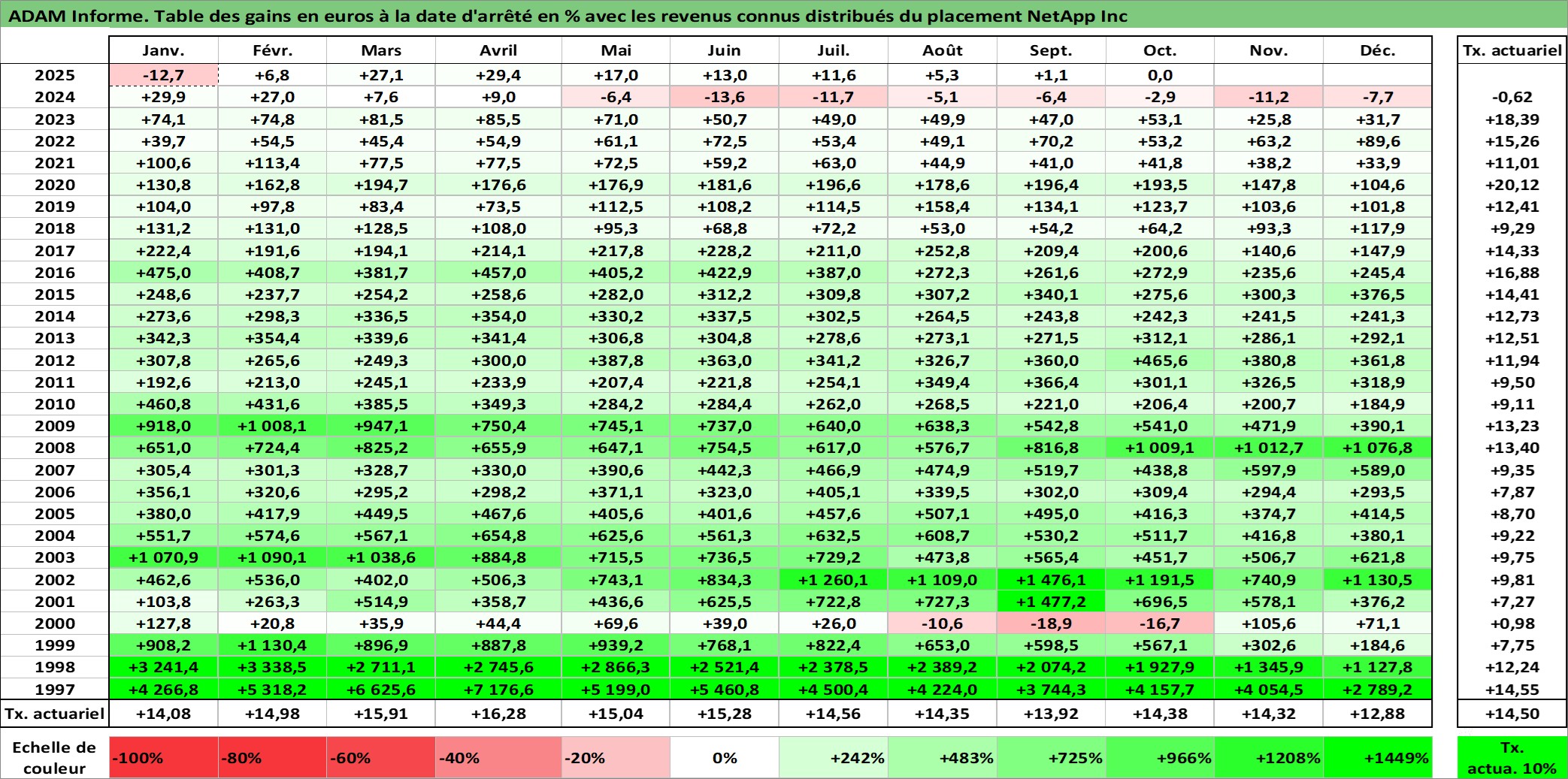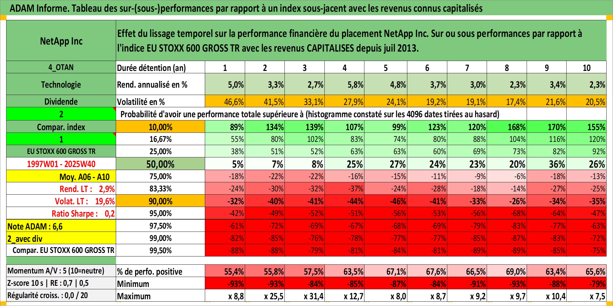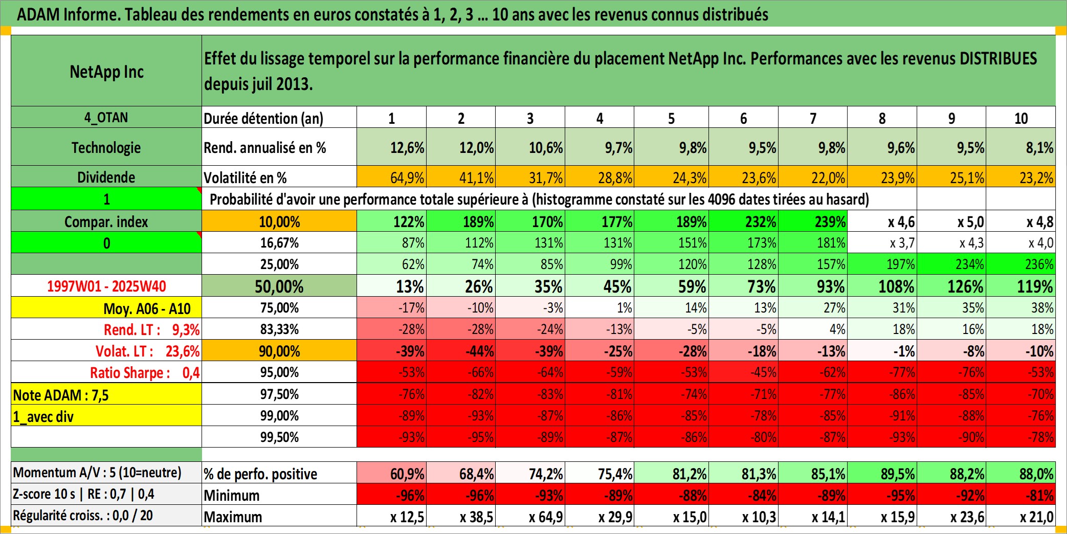 Site dédié aux investisseursPage dédiée sur site financeAnalyse des valorisations hebdomadaires de l'action NetApp Inc. Cet actif est cote en USD. Les valorisations sont en contrevaleur EURO et couvrent les semaines 1997W01 a 2025W40. Les revenus de cet actif financier sont pris en compte depuis la semaine 2013W28. La note globale ESG de cet actif est estimee a 13.0 (apres rebasage entre 0 et 20).