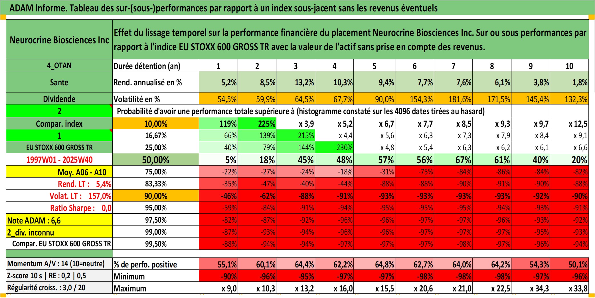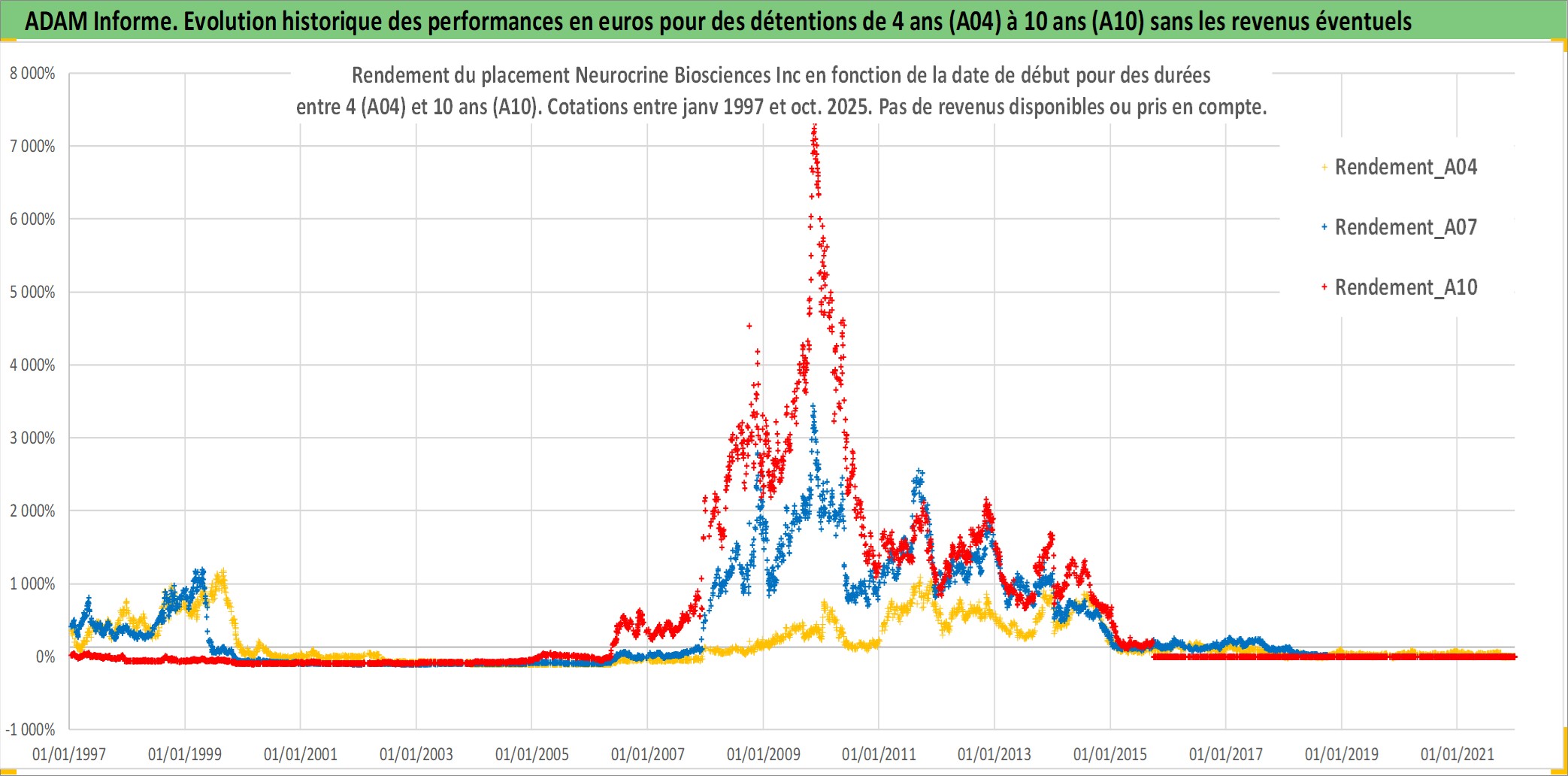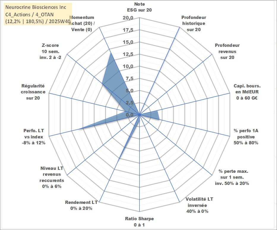 Site dédié aux investisseursPage dédiée sur site financeAnalyse des valorisations hebdomadaires de l'action Neurocrine Biosciences Inc. Cet actif est cote en USD. Les valorisations sont en contrevaleur EURO et couvrent les semaines 1997W01 a 2025W40. Les revenus de cet actif financier ne sont pas connus car non existants ou non disponibles sur le site Yahoo Finance. La note ESG de cet actif n'est pas connue.