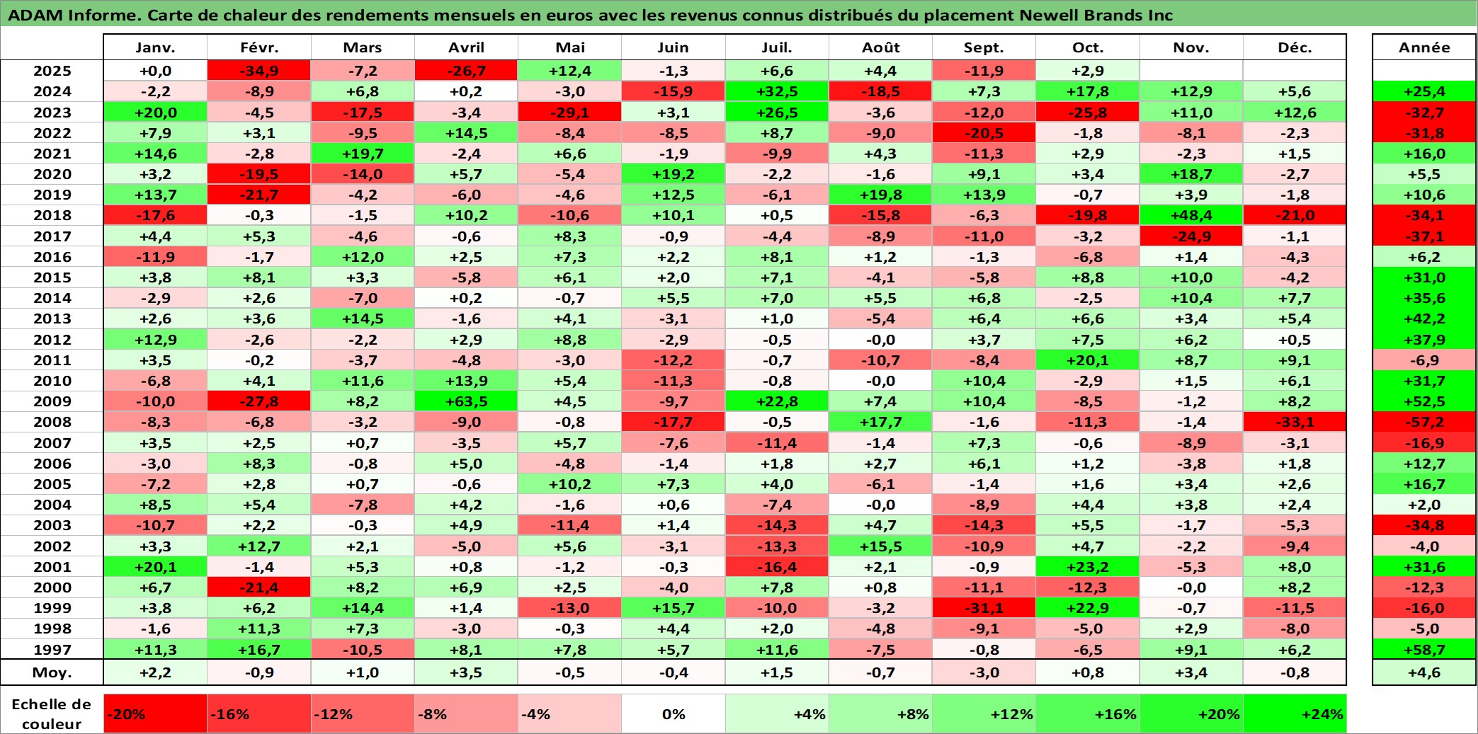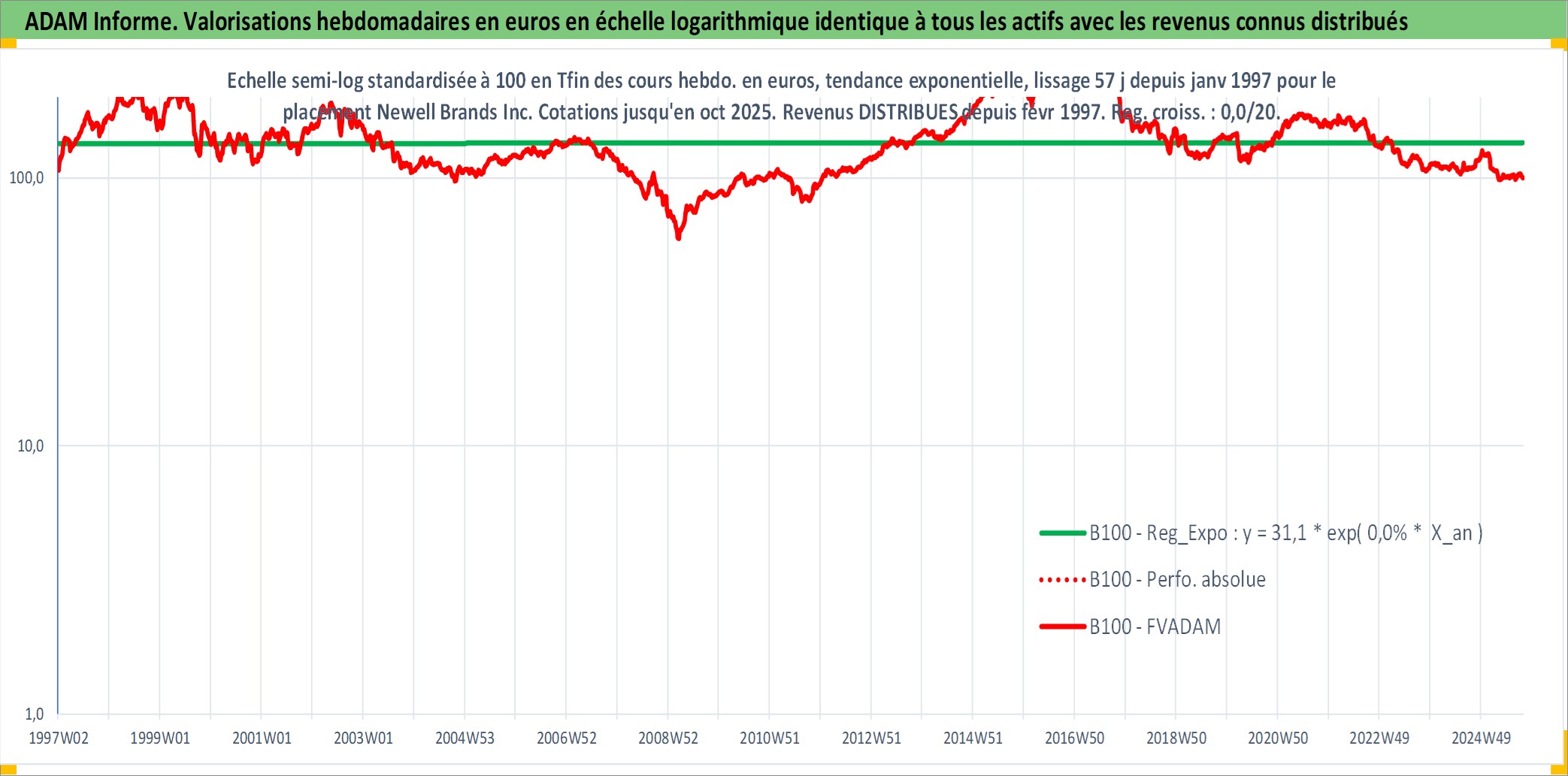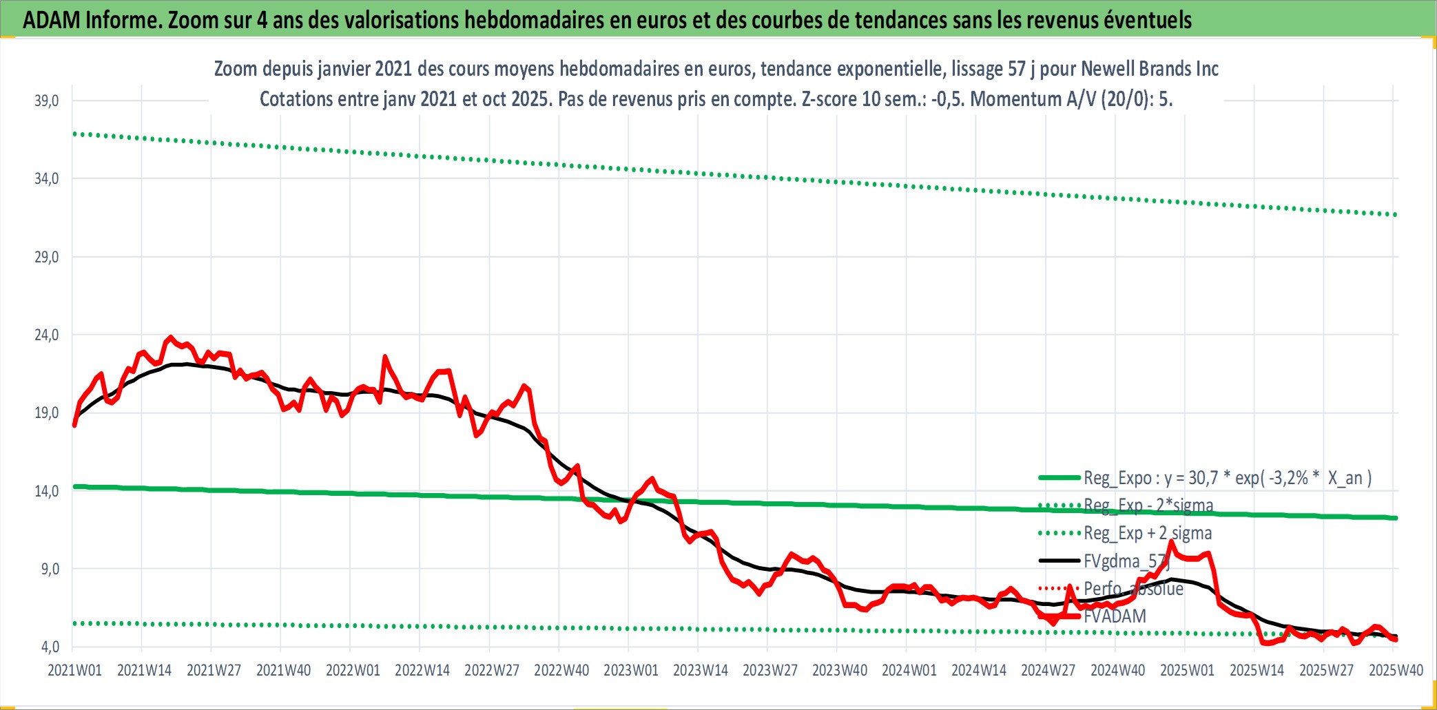 Site dédié aux investisseursPage dédiée sur site financeAnalyse des valorisations hebdomadaires de l'action Newell Brands Inc. Cet actif est cote en USD. Les valorisations sont en contrevaleur EURO et couvrent les semaines 1997W01 a 2025W40. Les revenus de cet actif financier sont pris en compte depuis la semaine 1997W08. La note globale ESG de cet actif est estimee a 14.0 (apres rebasage entre 0 et 20).