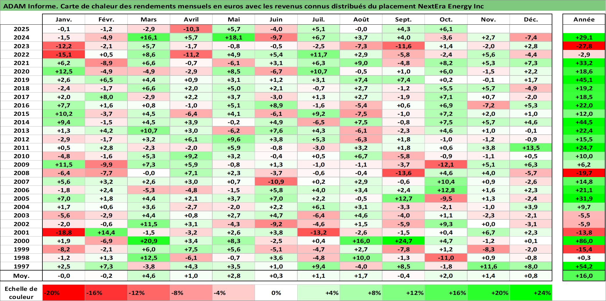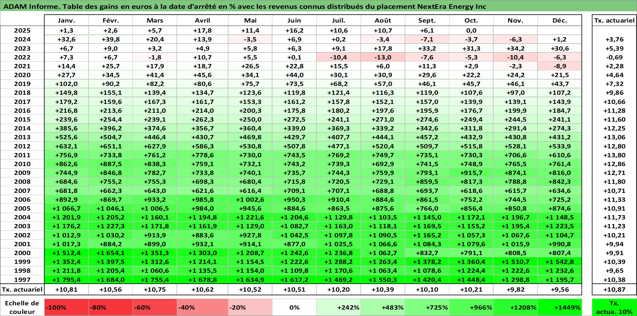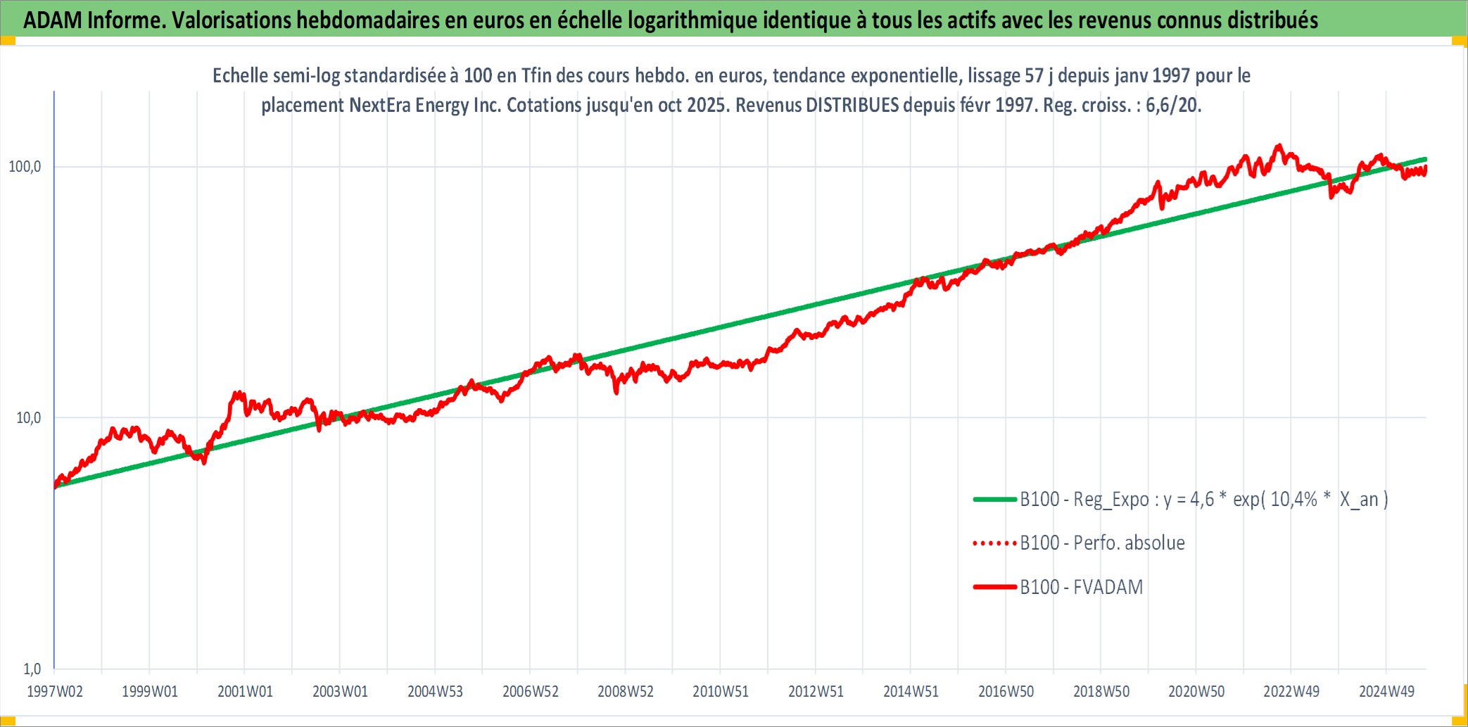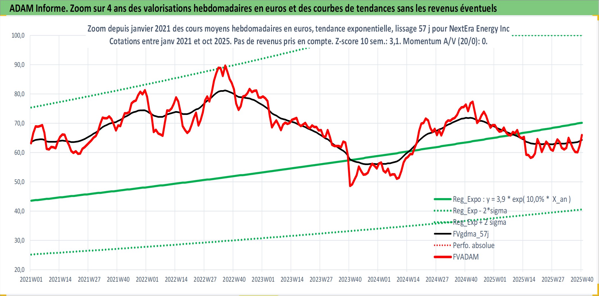 Site dédié aux investisseursPage dédiée sur site financeAnalyse des valorisations hebdomadaires de l'action NextEra Energy Inc. Cet actif est cote en USD. Les valorisations sont en contrevaleur EURO et couvrent les semaines 1997W01 a 2025W40. Les revenus de cet actif financier sont pris en compte depuis la semaine 1997W09. La note globale ESG de cet actif est estimee a 6.0 (apres rebasage entre 0 et 20).