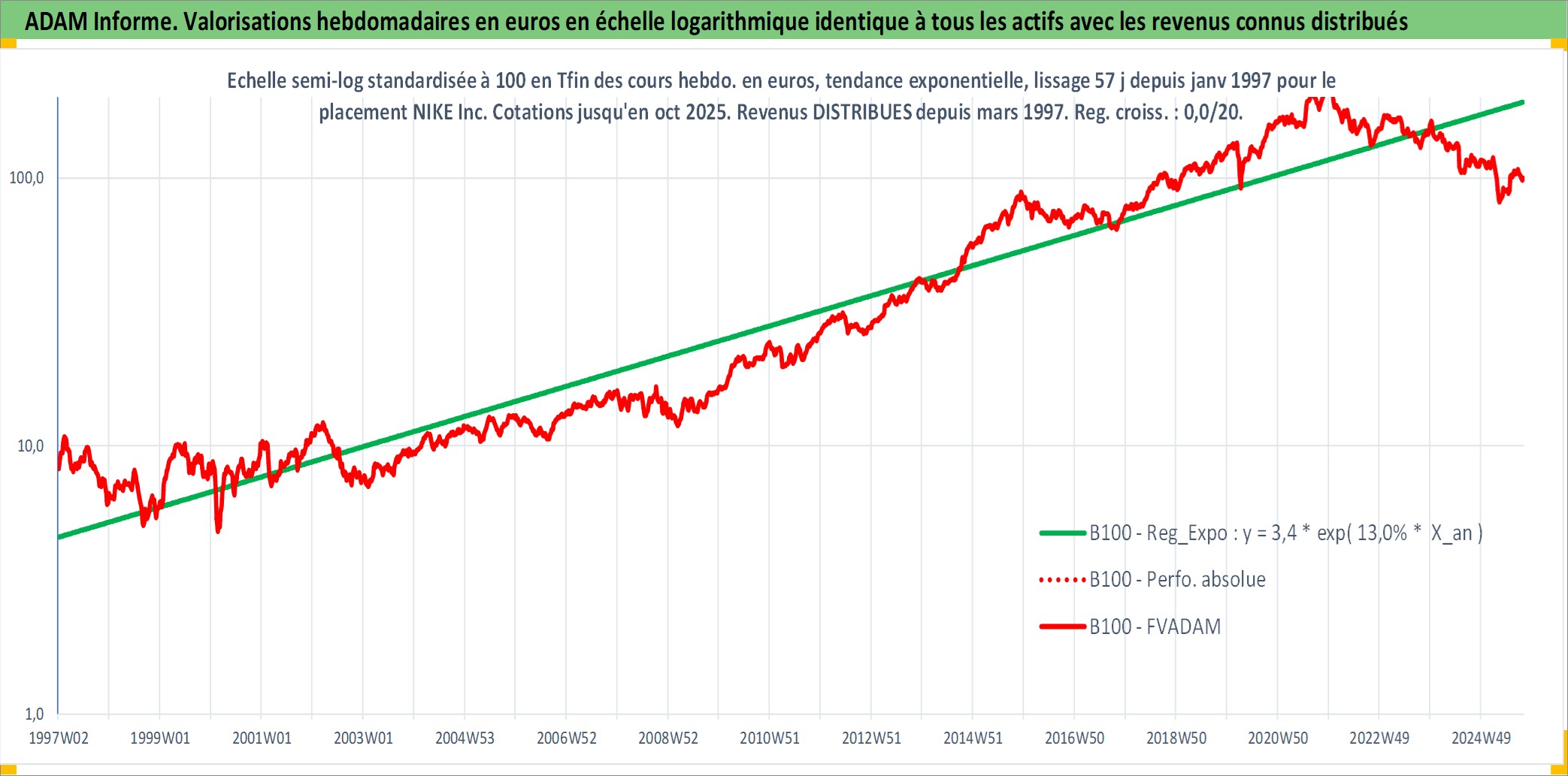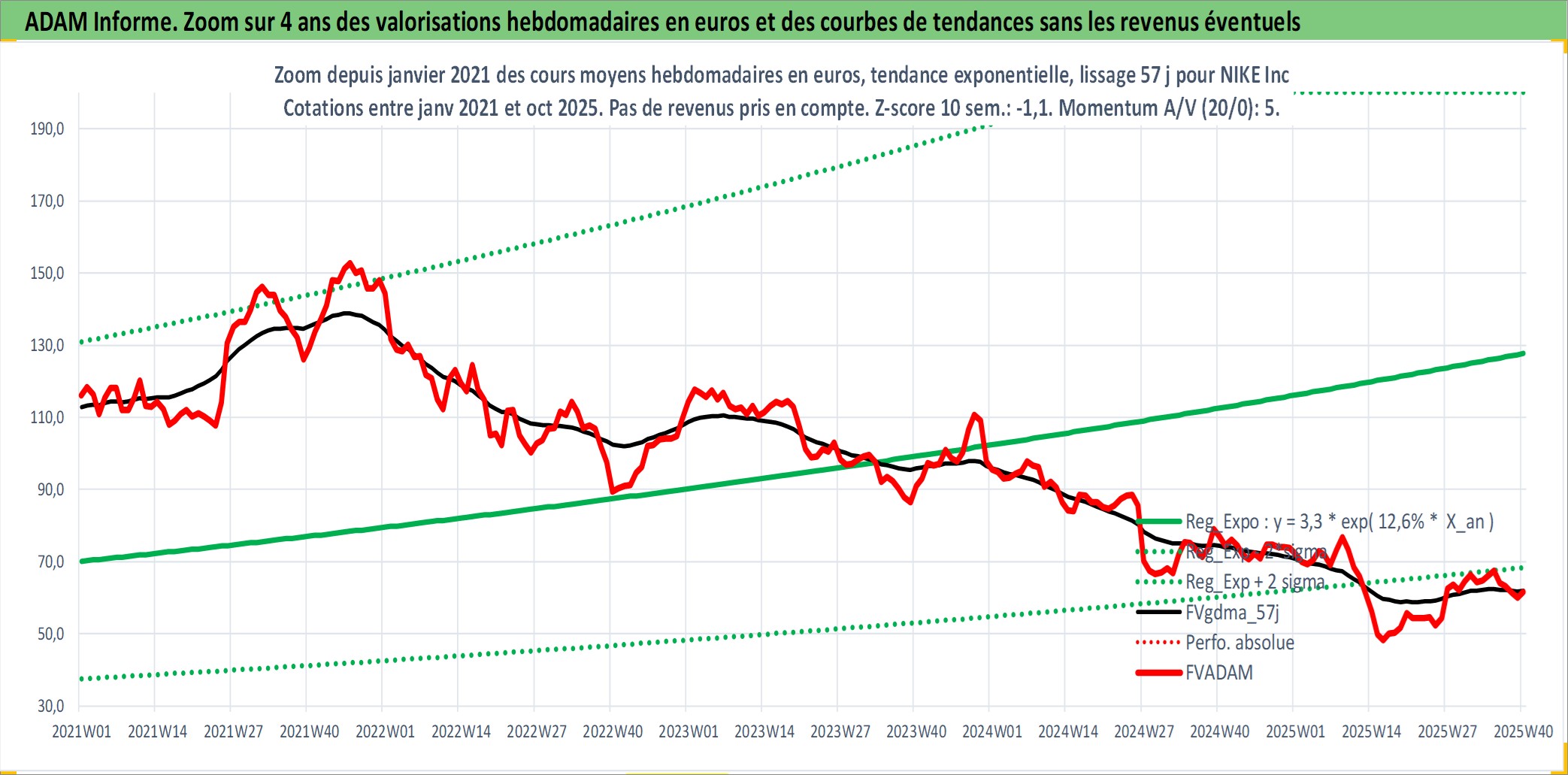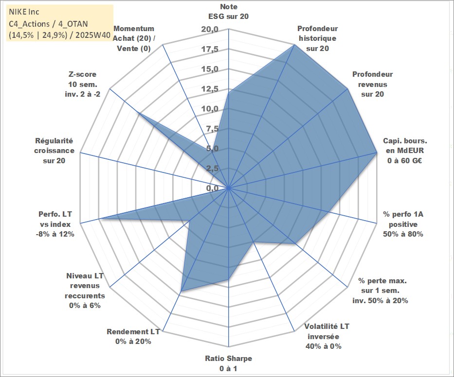 Site dédié aux investisseursPage dédiée sur site financeAnalyse des valorisations hebdomadaires de l'action NIKE Inc. Cet actif est cote en USD. Les valorisations sont en contrevaleur EURO et couvrent les semaines 1997W01 a 2025W40. Les revenus de cet actif financier sont pris en compte depuis la semaine 1997W12. La note globale ESG de cet actif est estimee a 12.0 (apres rebasage entre 0 et 20).