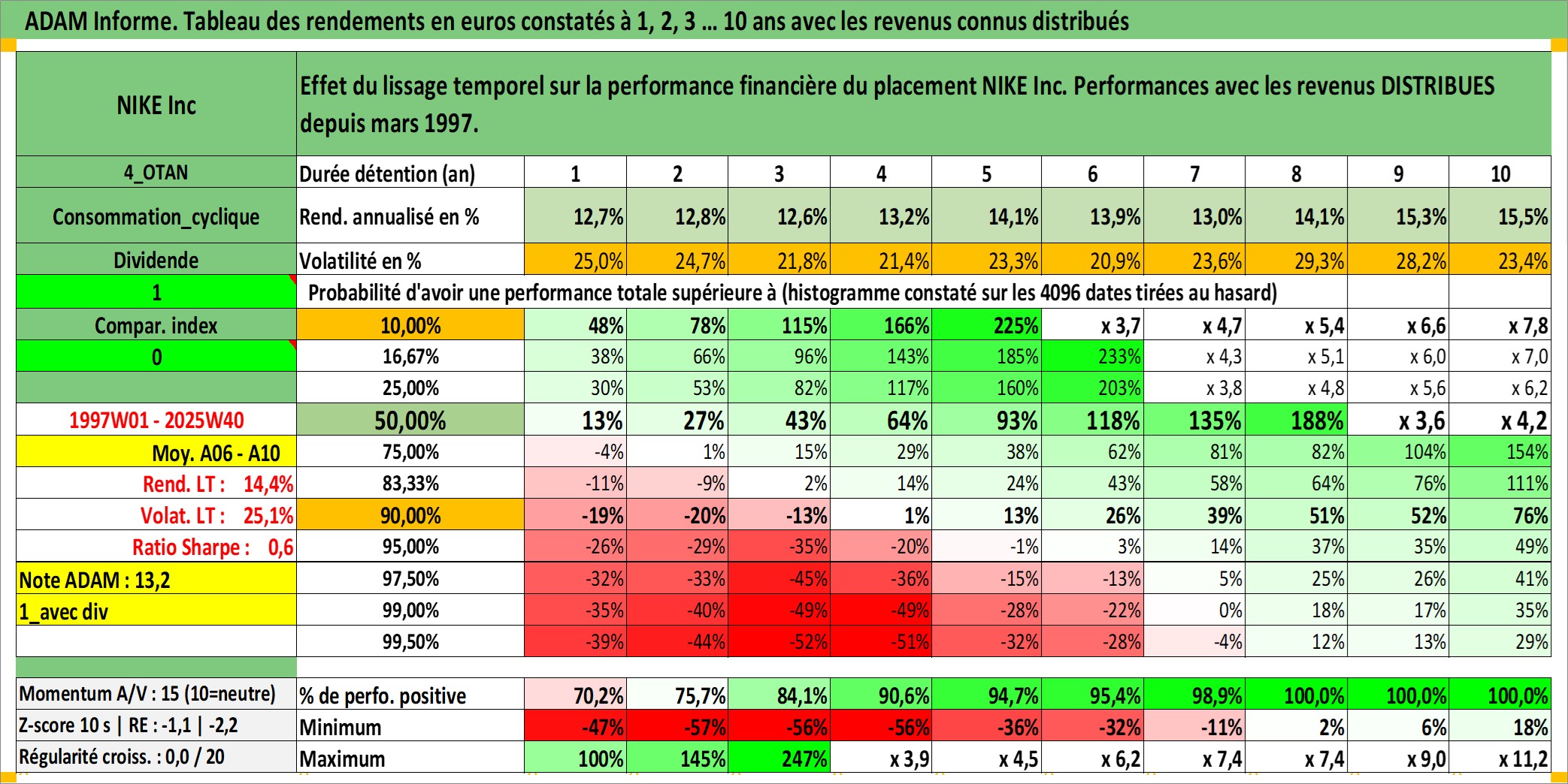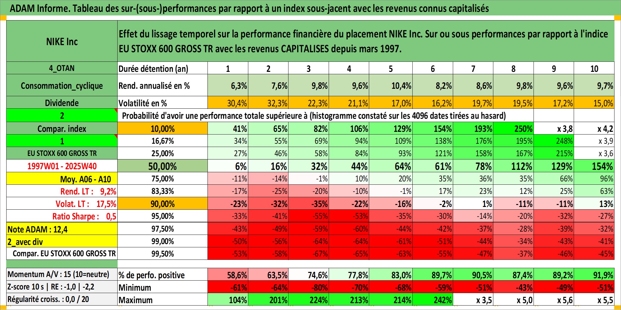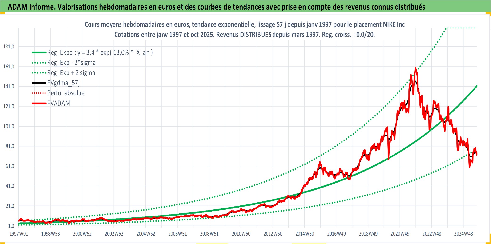 Site dédié aux investisseursPage dédiée sur site financeAnalyse des valorisations hebdomadaires de l'action NIKE Inc. Cet actif est cote en USD. Les valorisations sont en contrevaleur EURO et couvrent les semaines 1997W01 a 2025W40. Les revenus de cet actif financier sont pris en compte depuis la semaine 1997W12. La note globale ESG de cet actif est estimee a 12.0 (apres rebasage entre 0 et 20).