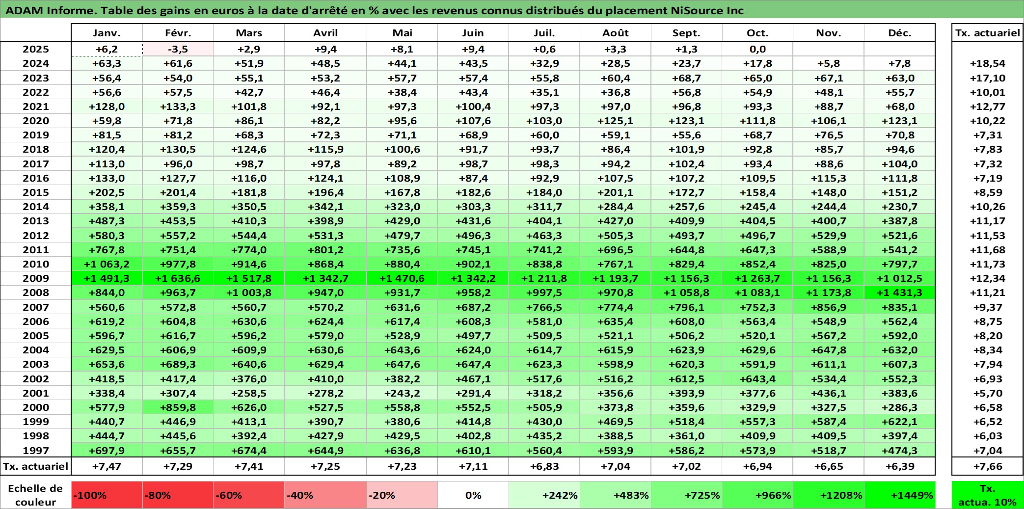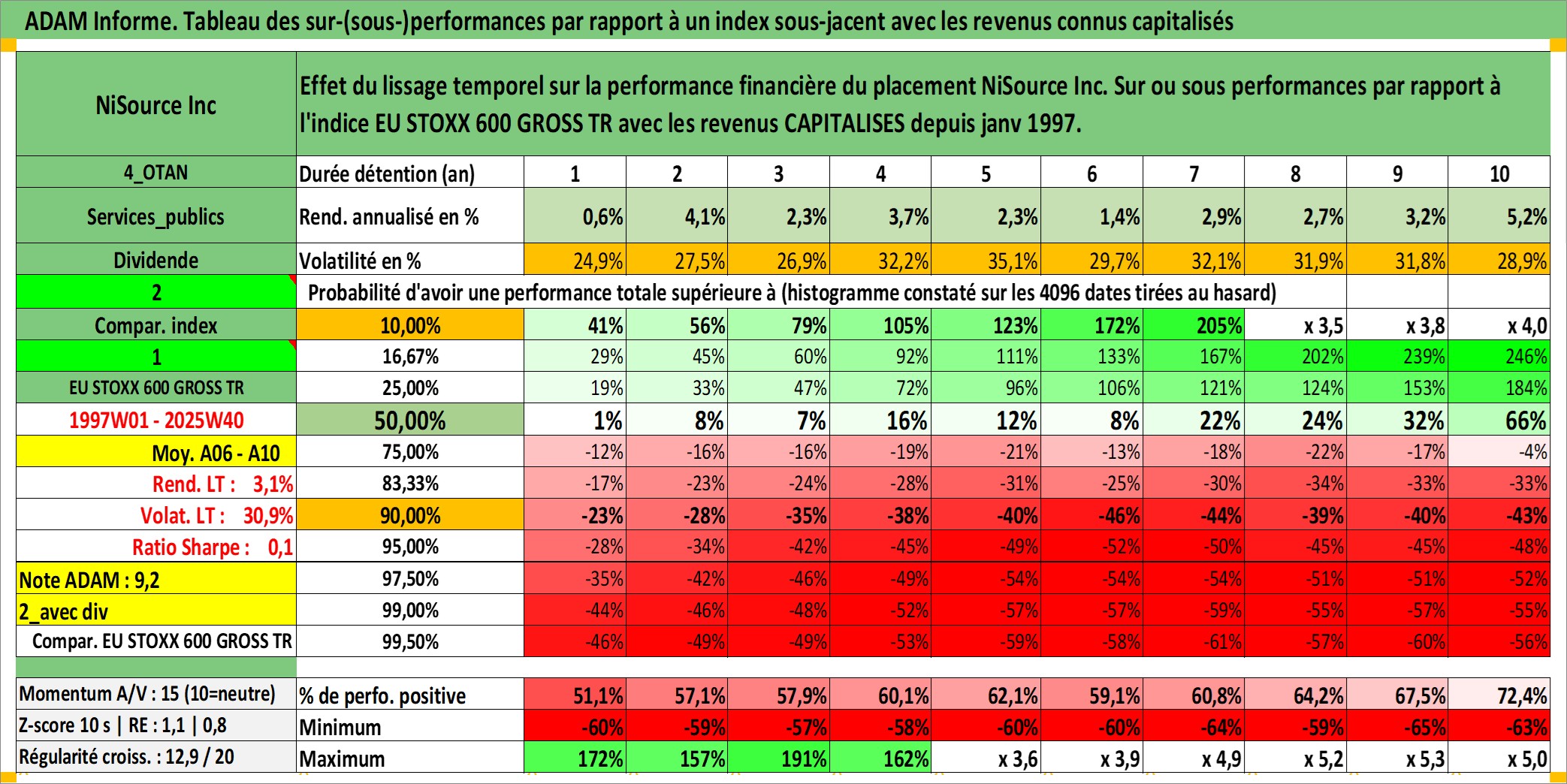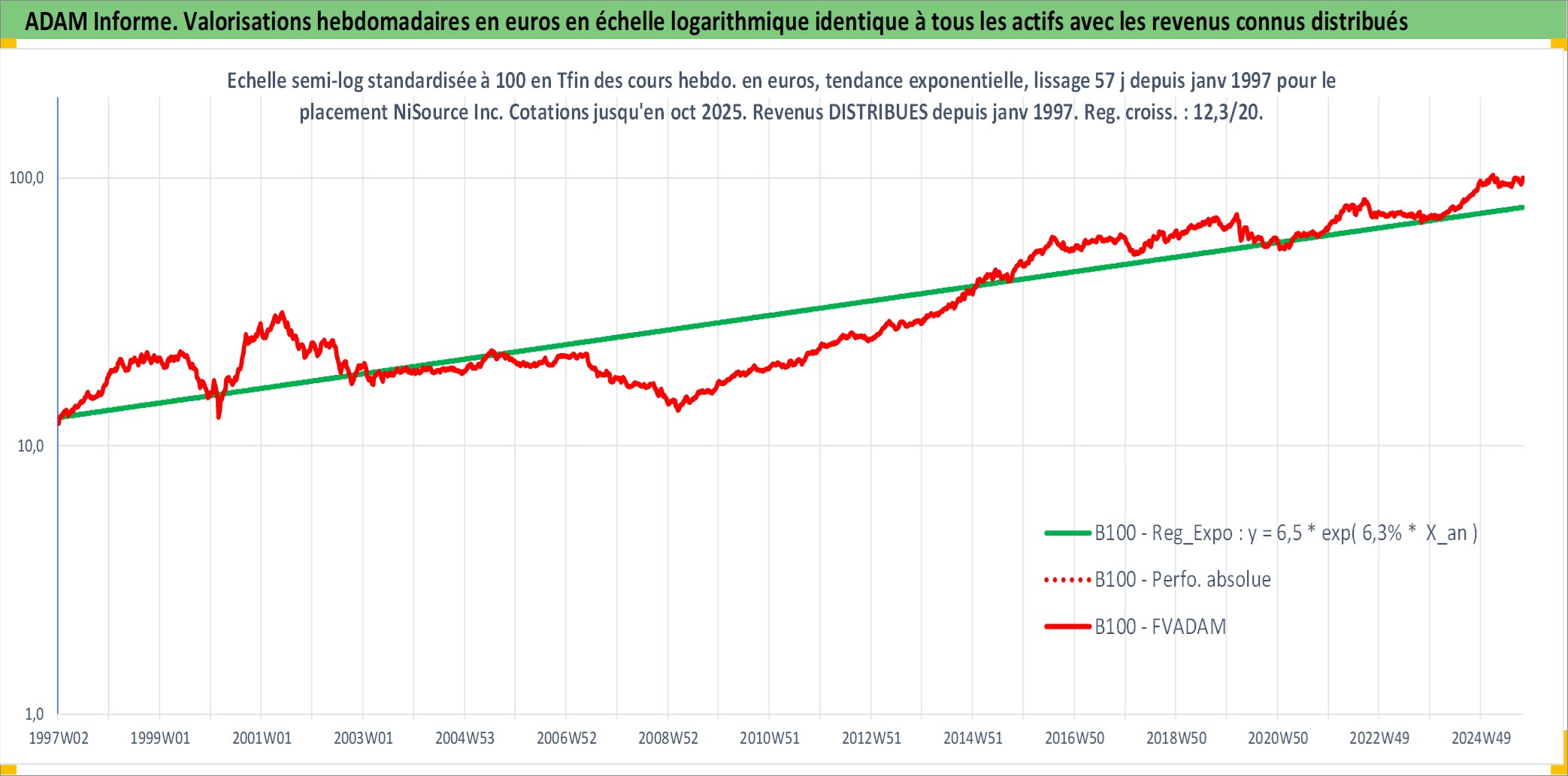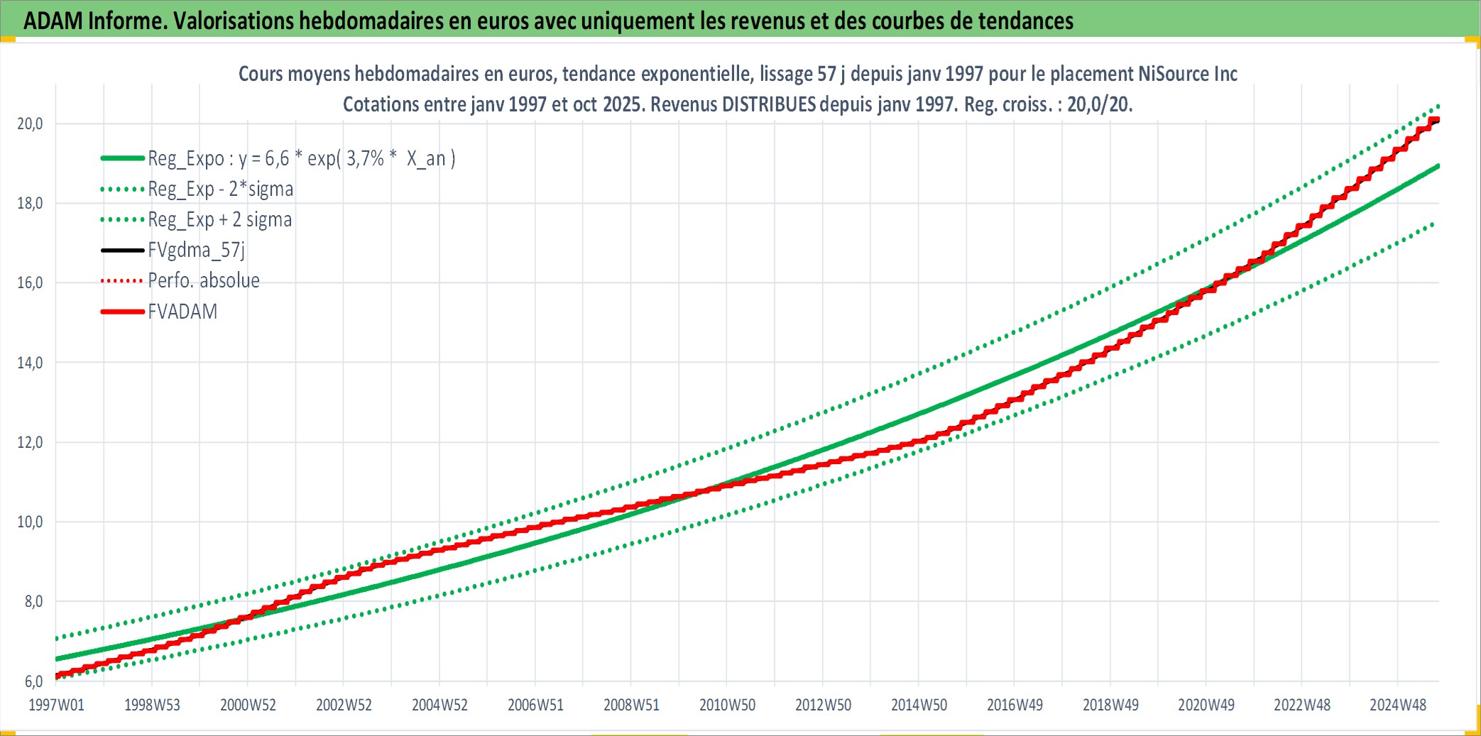 Site dédié aux investisseursPage dédiée sur site financeAnalyse des valorisations hebdomadaires de l'action NiSource Inc. Cet actif est cote en USD. Les valorisations sont en contrevaleur EURO et couvrent les semaines 1997W01 a 2025W40. Les revenus de cet actif financier sont pris en compte depuis la semaine 1997W05. La note globale ESG de cet actif est estimee a 5.0 (apres rebasage entre 0 et 20).