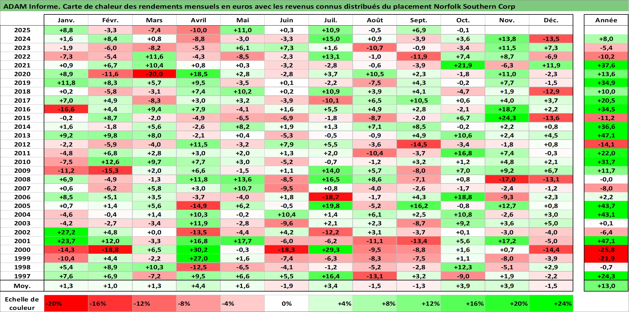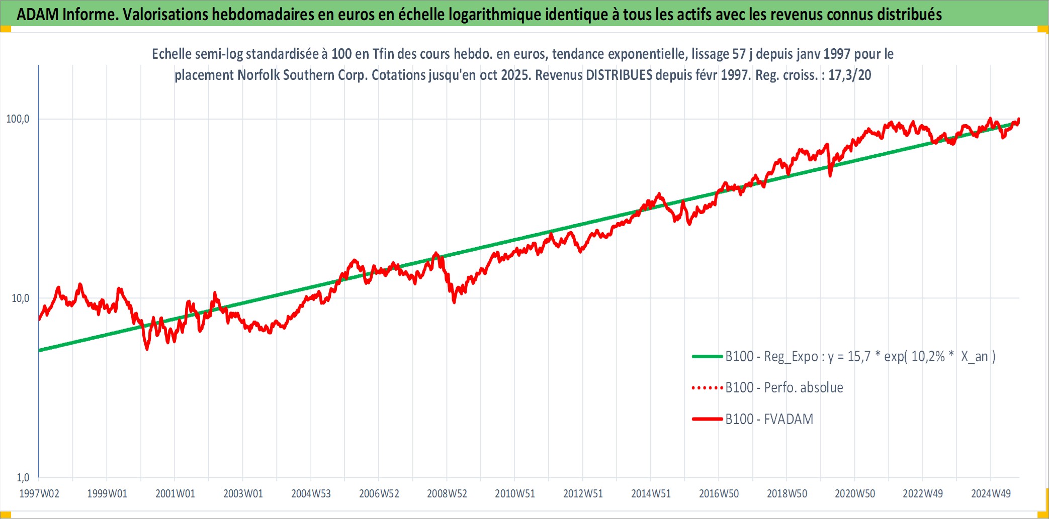 Site dédié aux investisseursPage dédiée sur site financeAnalyse des valorisations hebdomadaires de l'action Norfolk Southern Corp. Cet actif est cote en USD. Les valorisations sont en contrevaleur EURO et couvrent les semaines 1997W01 a 2025W40. Les revenus de cet actif financier sont pris en compte depuis la semaine 1997W06. La note globale ESG de cet actif est estimee a 9.0 (apres rebasage entre 0 et 20).