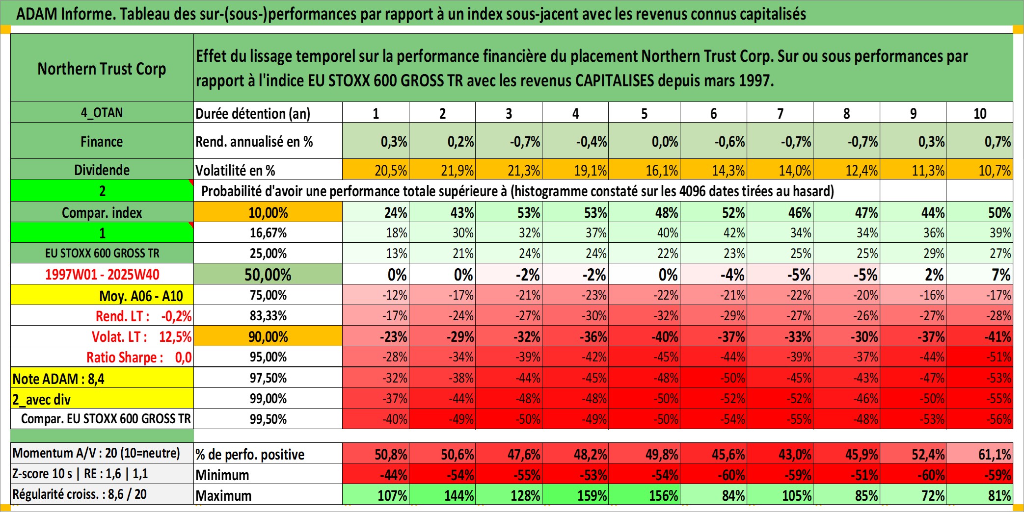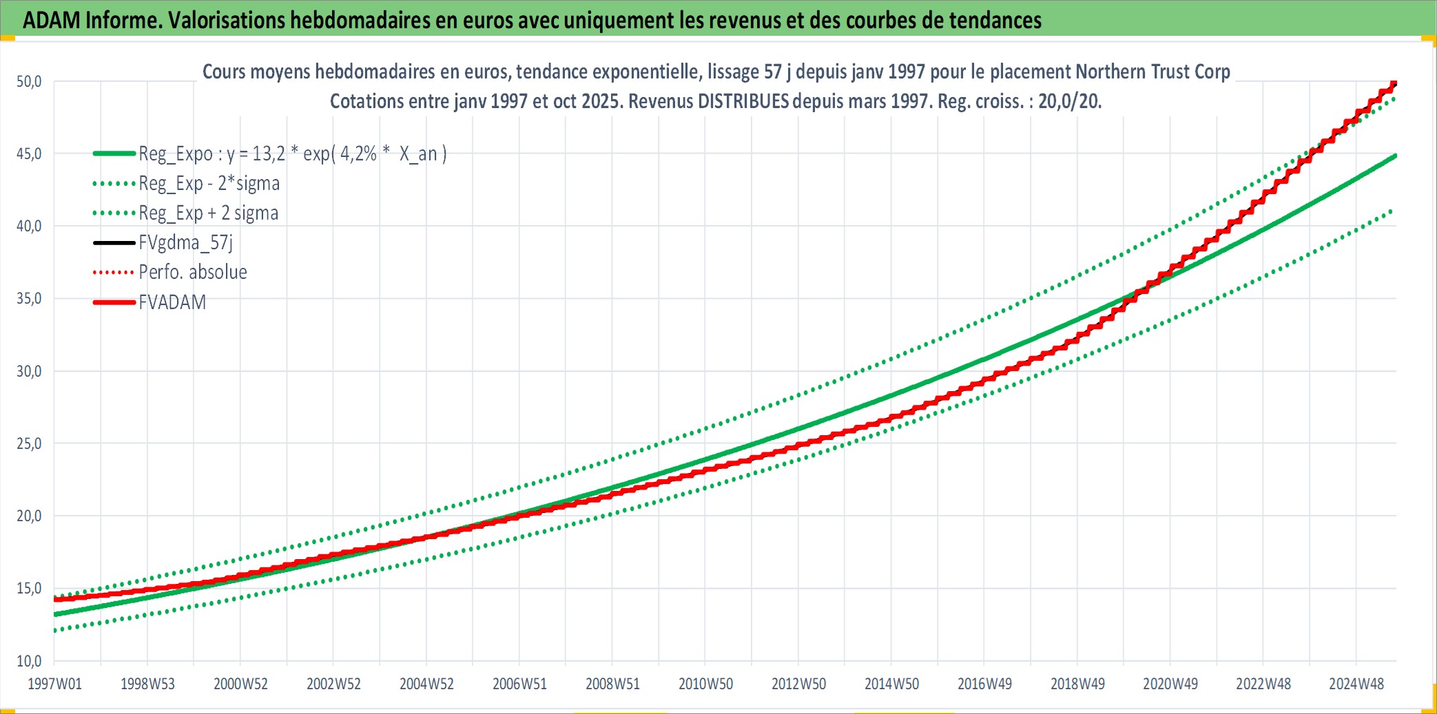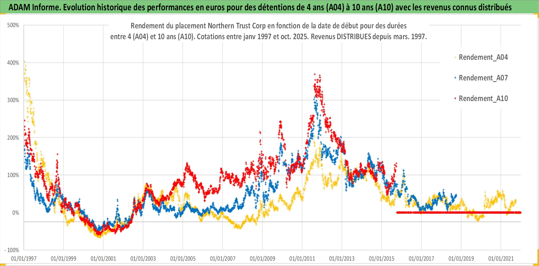 Site dédié aux investisseursPage dédiée sur site financeAnalyse des valorisations hebdomadaires de l'action Northern Trust Corp. Cet actif est cote en USD. Les valorisations sont en contrevaleur EURO et couvrent les semaines 1997W01 a 2025W40. Les revenus de cet actif financier sont pris en compte depuis la semaine 1997W10. La note globale ESG de cet actif est estimee a 8.0 (apres rebasage entre 0 et 20).