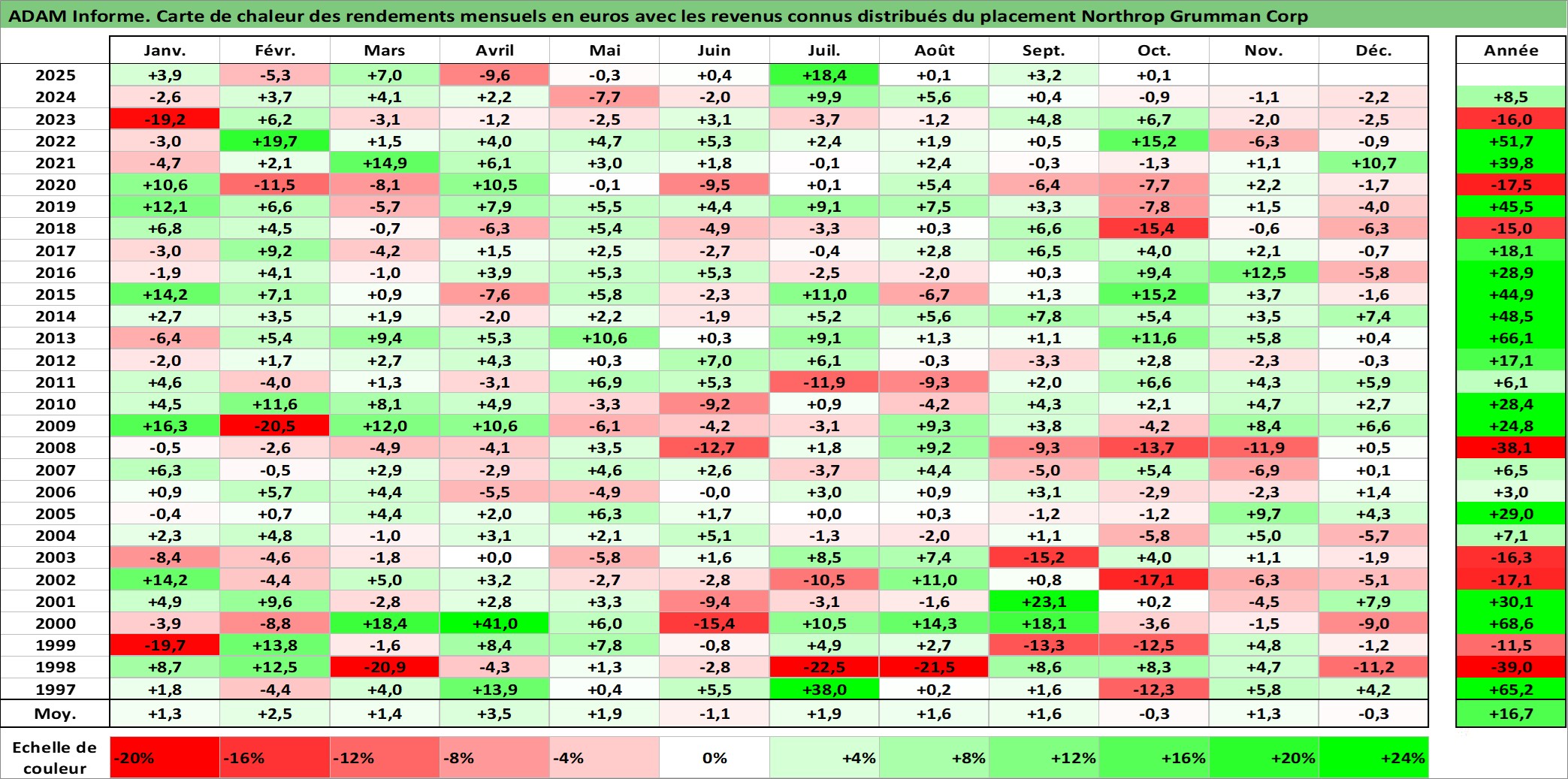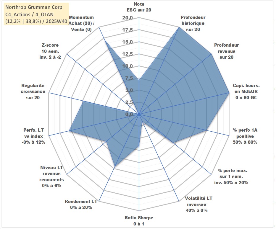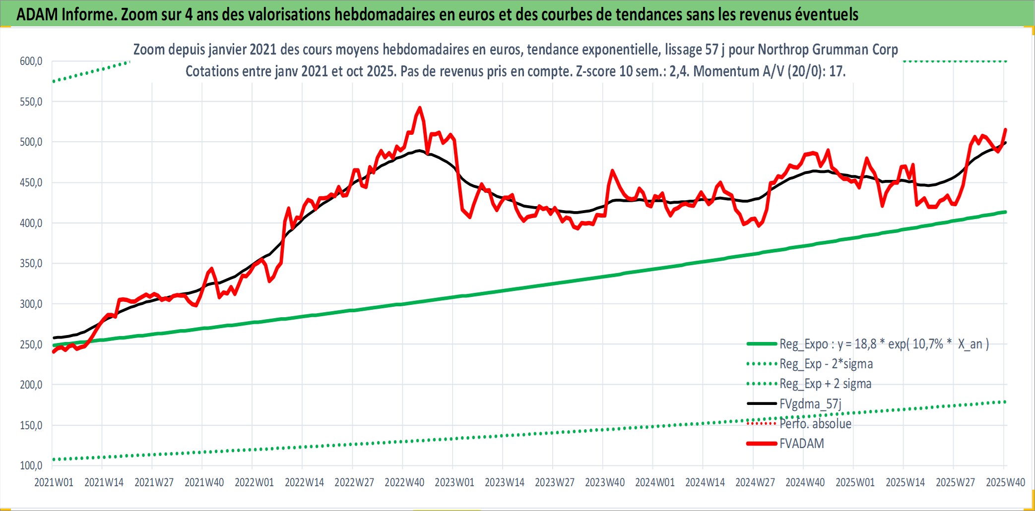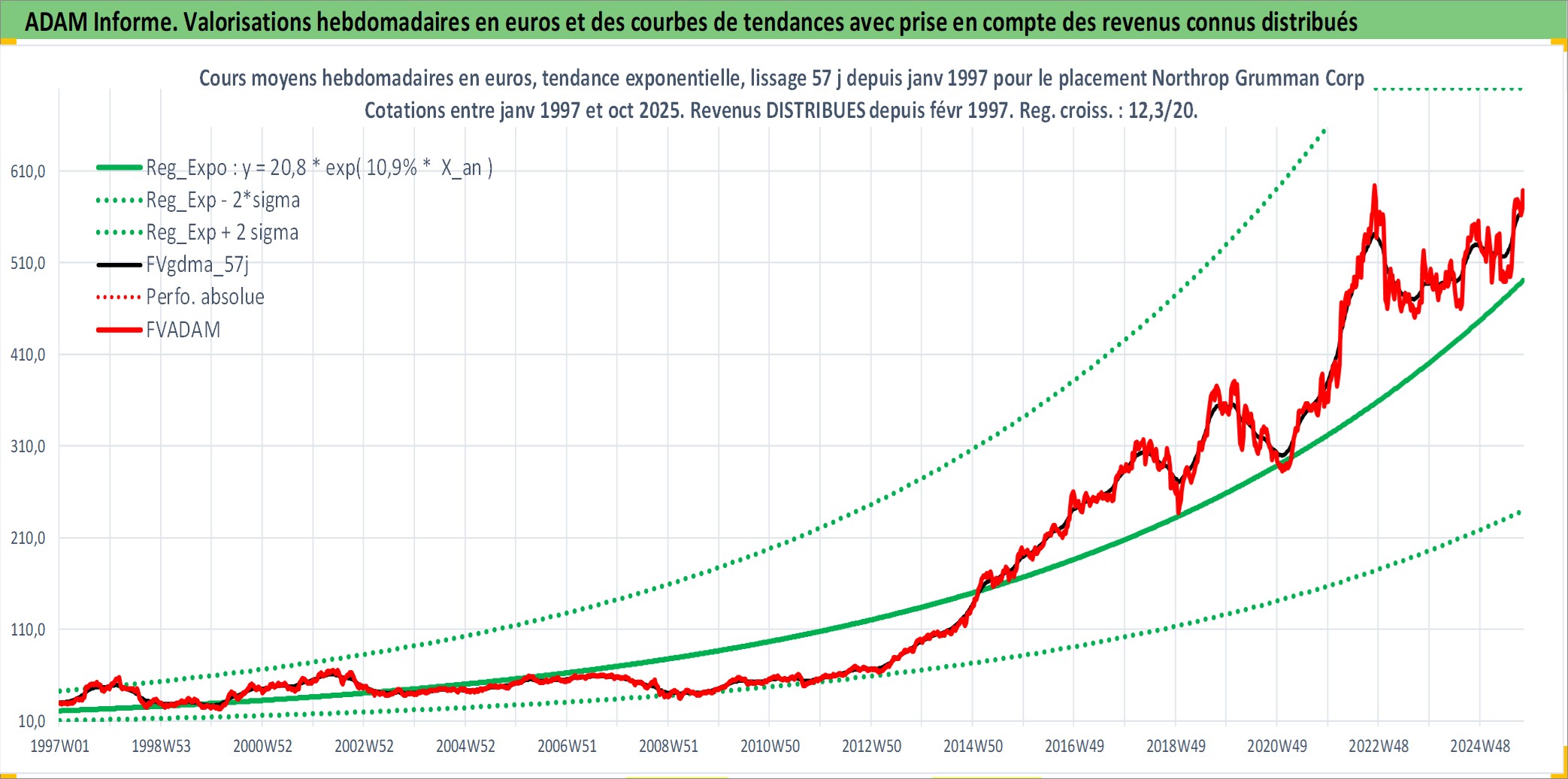 Site dédié aux investisseursPage dédiée sur site financeAnalyse des valorisations hebdomadaires de l'action Northrop Grumman Corp. Cet actif est cote en USD. Les valorisations sont en contrevaleur EURO et couvrent les semaines 1997W01 a 2025W40. Les revenus de cet actif financier sont pris en compte depuis la semaine 1997W09. La note globale ESG de cet actif est estimee a 7.0 (apres rebasage entre 0 et 20).