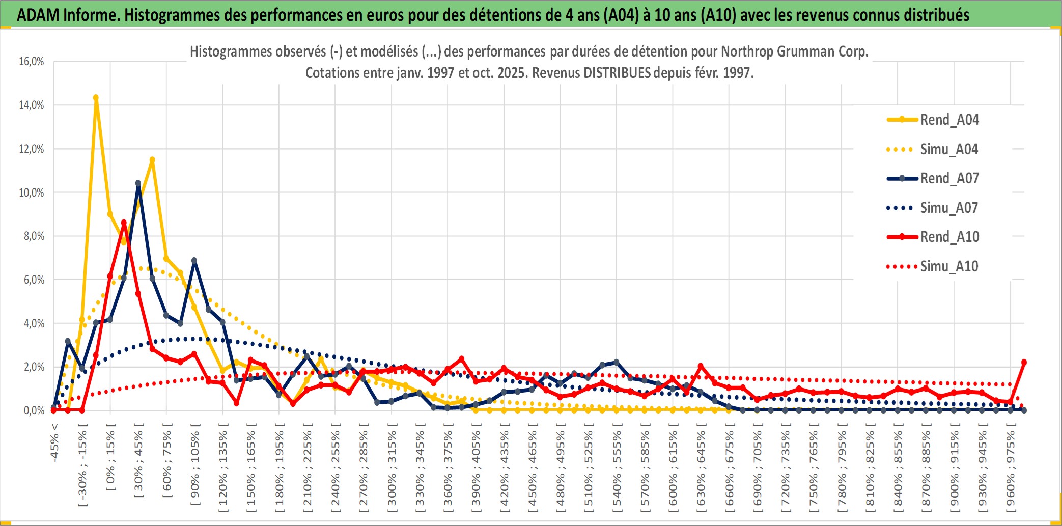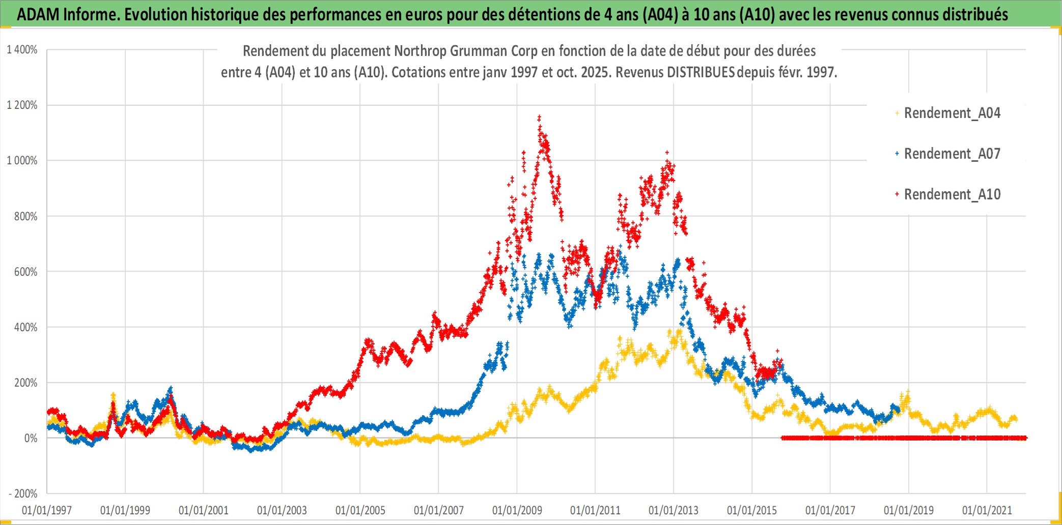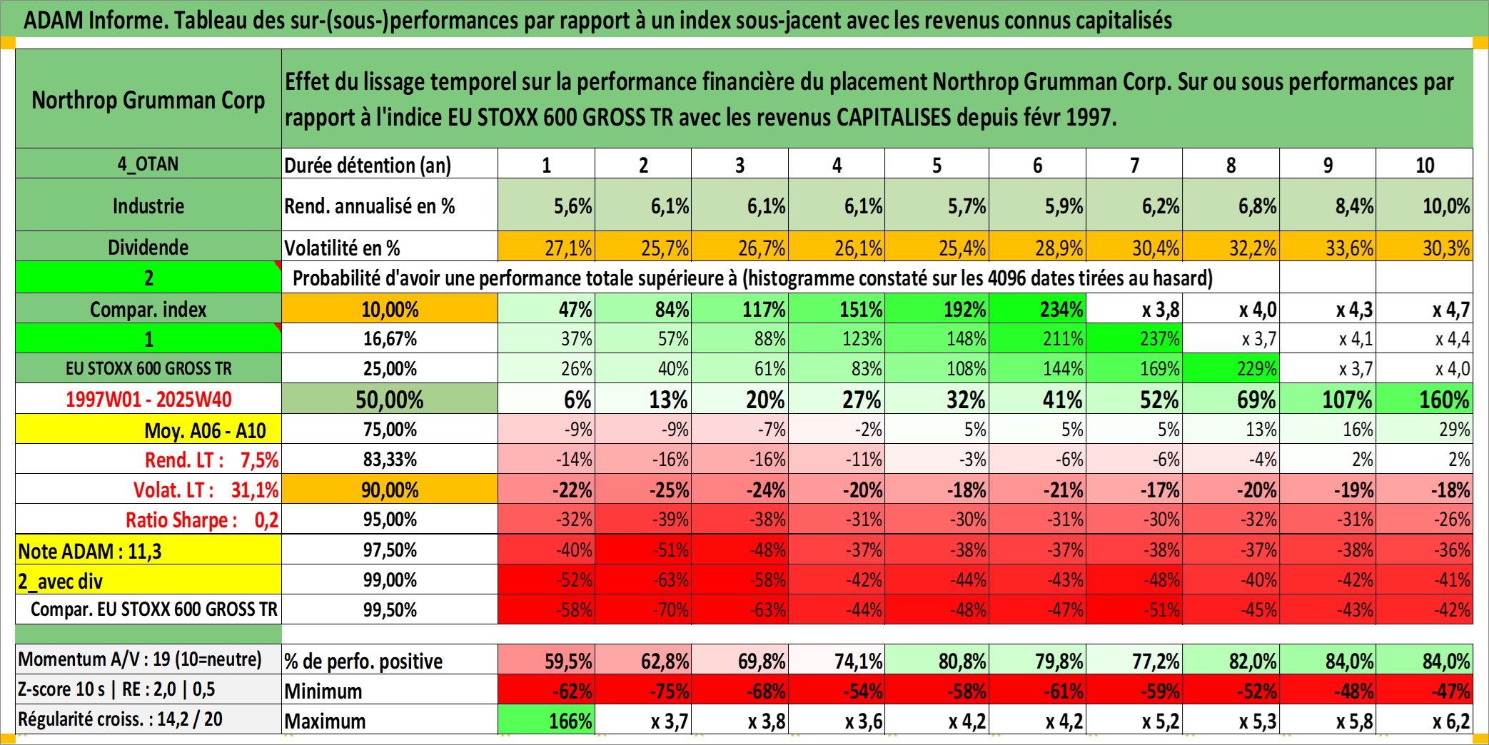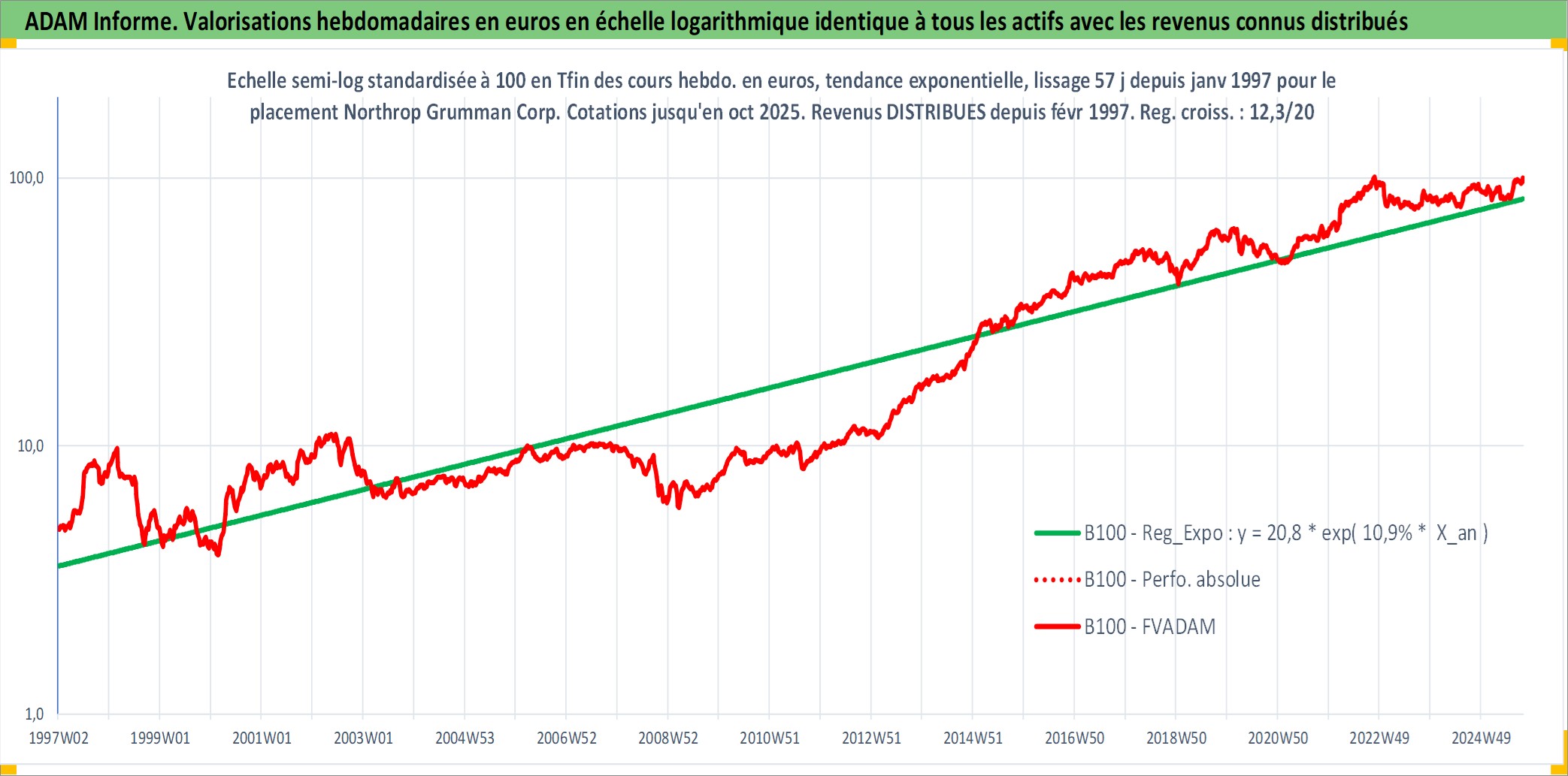 Site dédié aux investisseursPage dédiée sur site financeAnalyse des valorisations hebdomadaires de l'action Northrop Grumman Corp. Cet actif est cote en USD. Les valorisations sont en contrevaleur EURO et couvrent les semaines 1997W01 a 2025W40. Les revenus de cet actif financier sont pris en compte depuis la semaine 1997W09. La note globale ESG de cet actif est estimee a 7.0 (apres rebasage entre 0 et 20).