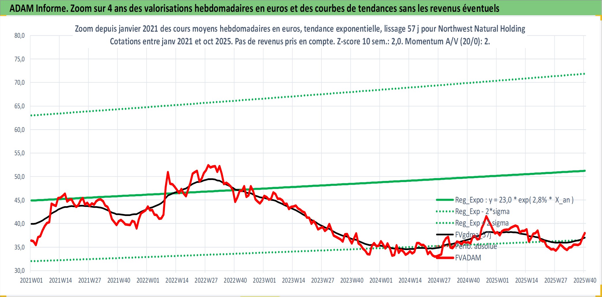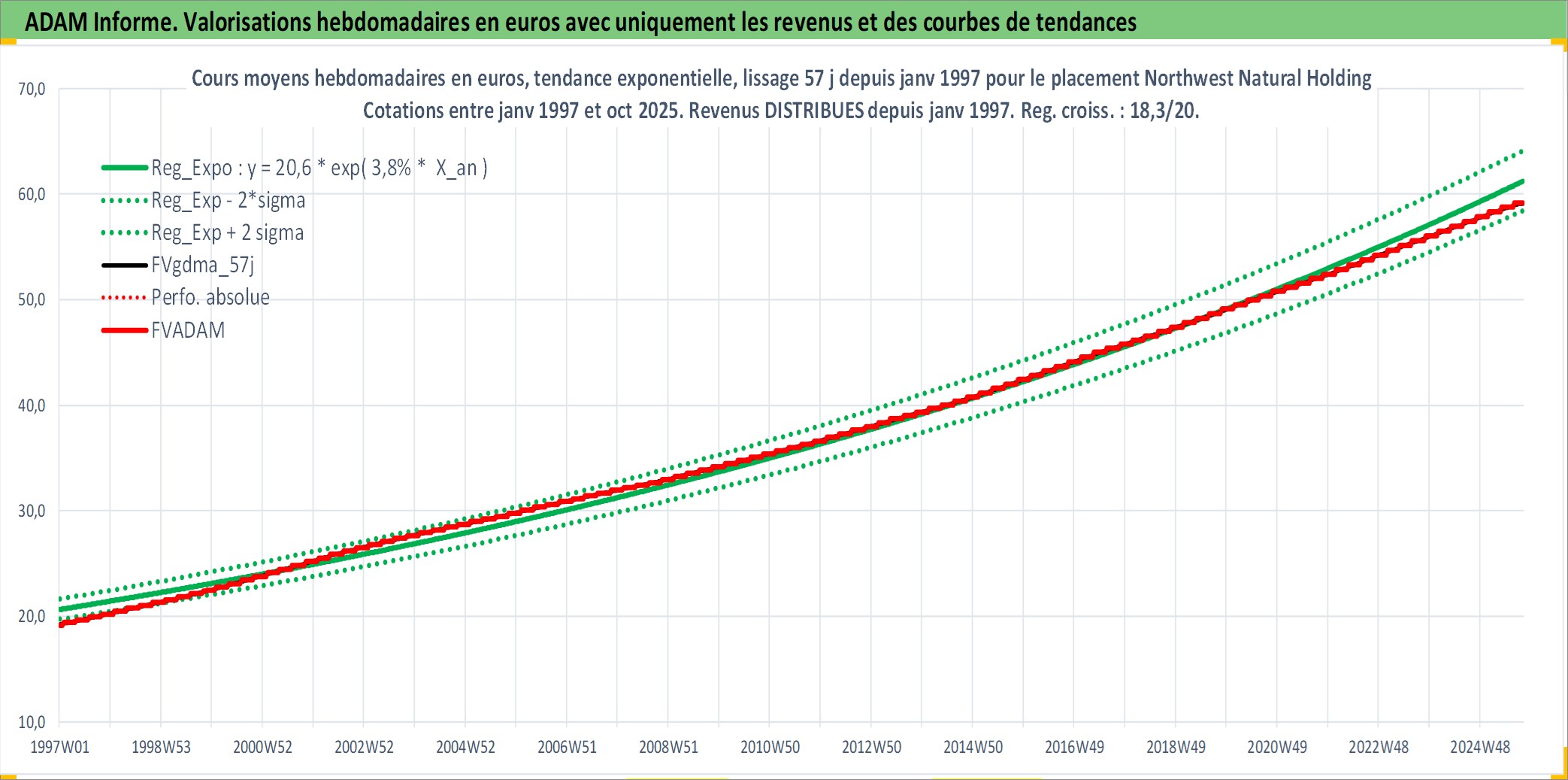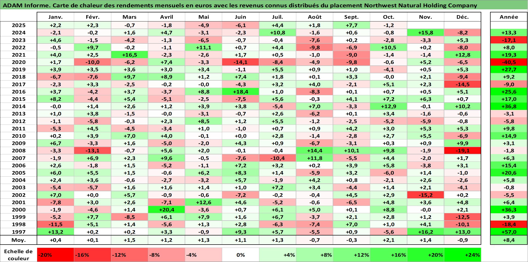 Site dédié aux investisseursPage dédiée sur site financeAnalyse des valorisations hebdomadaires de l'action Northwest Natural Holding Company. Cet actif est cote en USD. Les valorisations sont en contrevaleur EURO et couvrent les semaines 1997W01 a 2025W40. Les revenus de cet actif financier sont pris en compte depuis la semaine 1997W05. La note ESG de cet actif n'est pas connue.