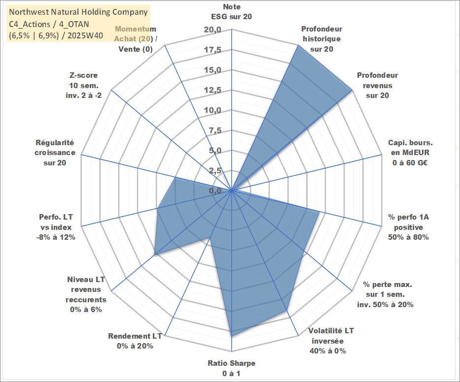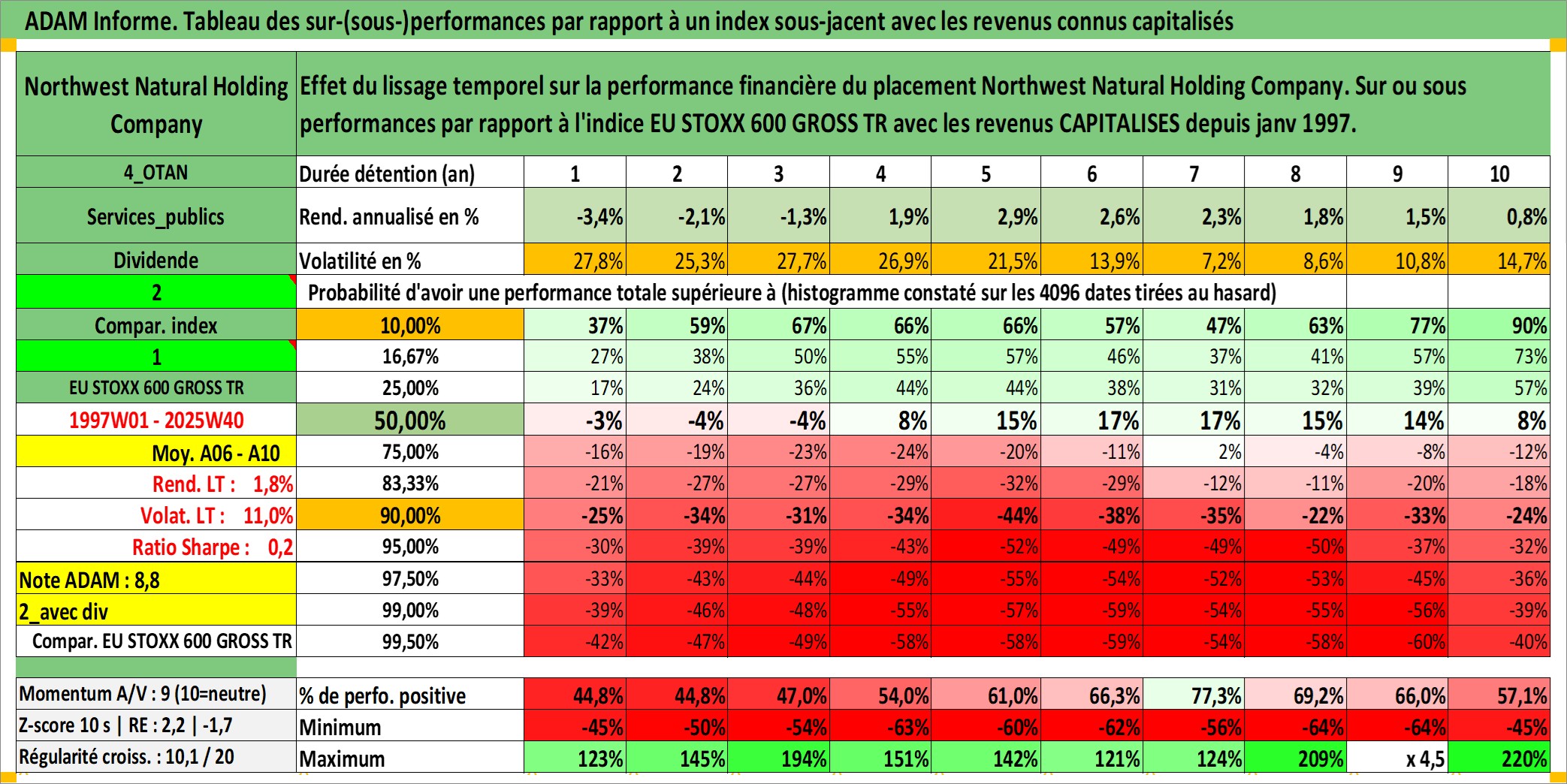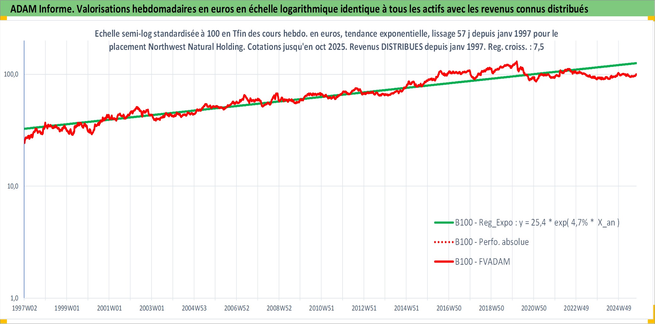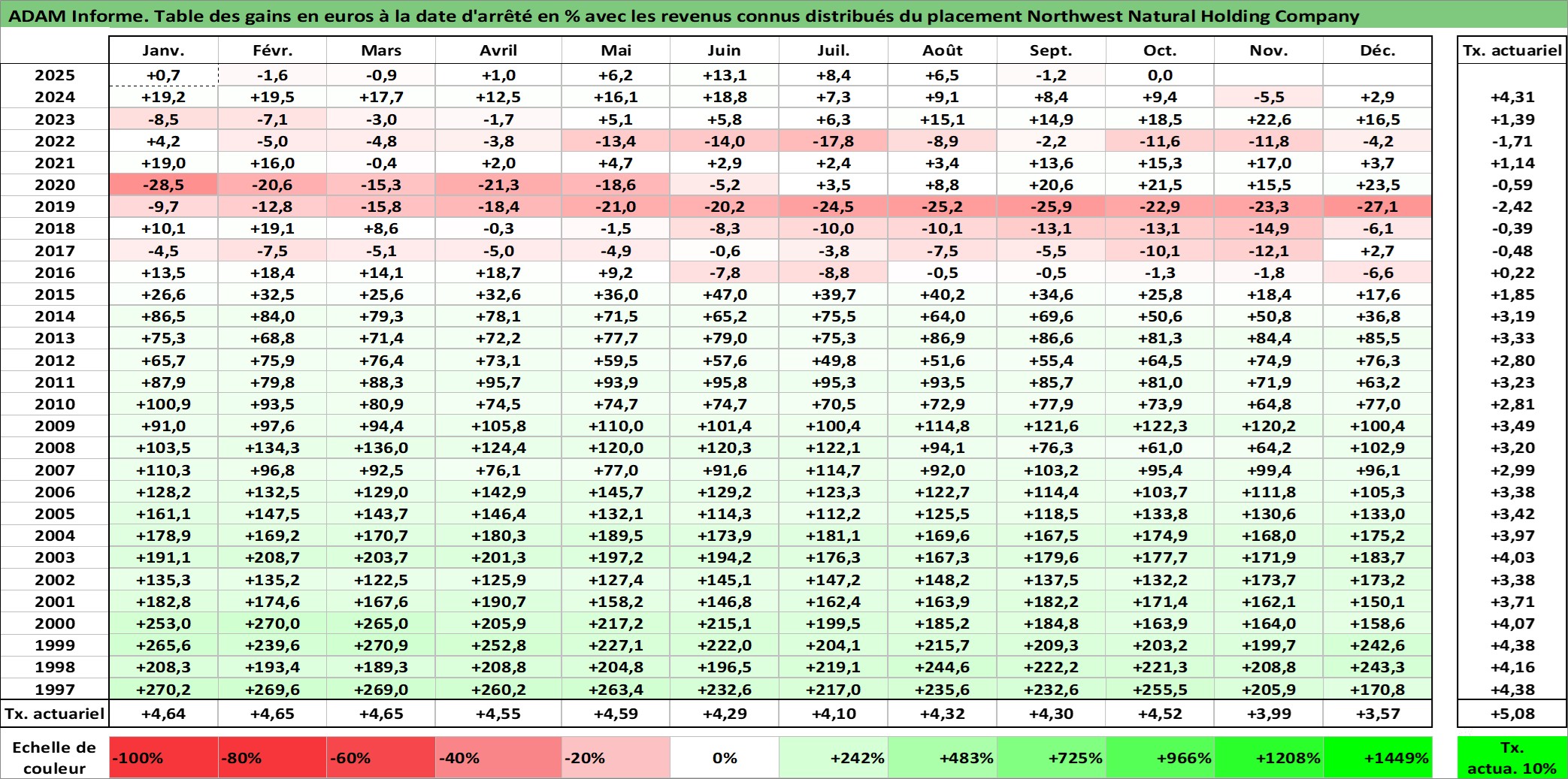 Site dédié aux investisseursPage dédiée sur site financeAnalyse des valorisations hebdomadaires de l'action Northwest Natural Holding Company. Cet actif est cote en USD. Les valorisations sont en contrevaleur EURO et couvrent les semaines 1997W01 a 2025W40. Les revenus de cet actif financier sont pris en compte depuis la semaine 1997W05. La note ESG de cet actif n'est pas connue.