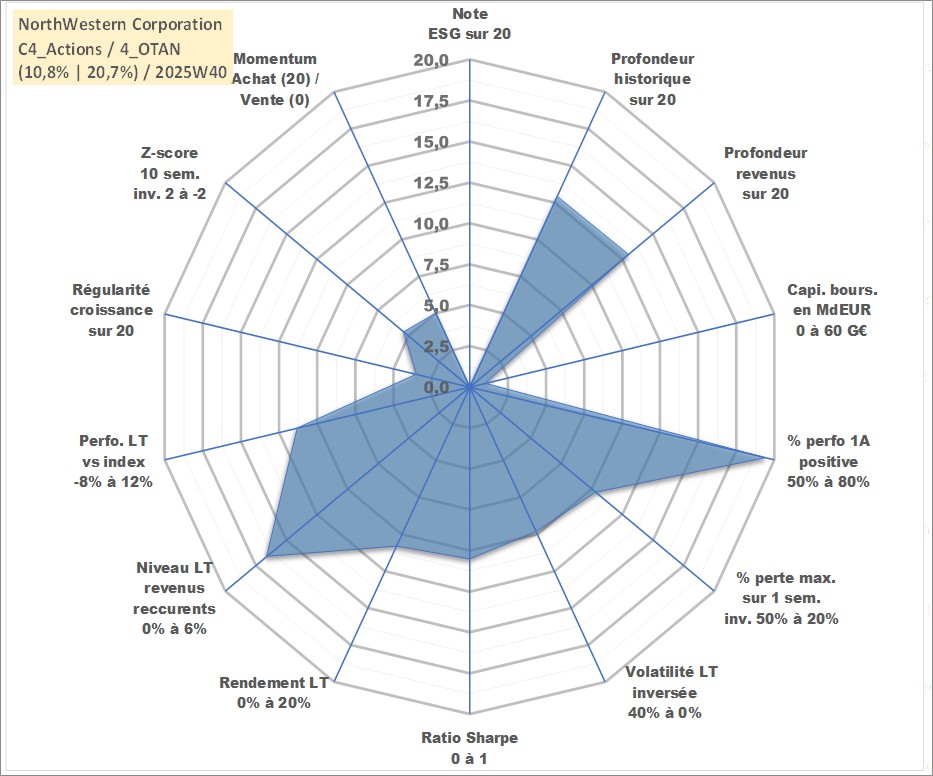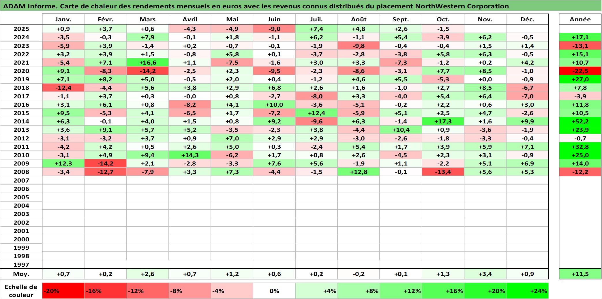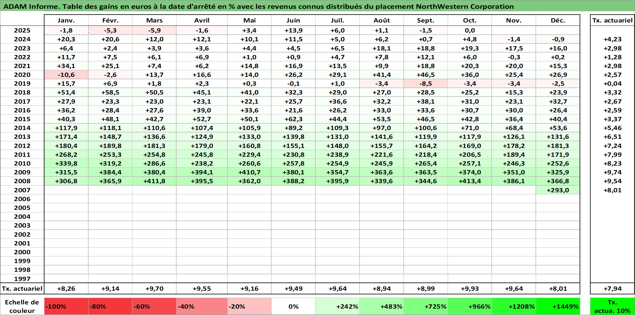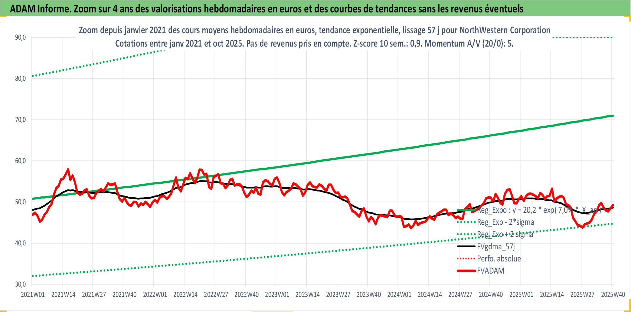 Site dédié aux investisseursPage dédiée sur site financeAnalyse des valorisations hebdomadaires de l'action NorthWestern Corporation. Cet actif est cote en USD. Les valorisations sont en contrevaleur EURO et couvrent les semaines 2007W52 a 2025W40. Les revenus de cet actif financier sont pris en compte depuis la semaine 2008W11. La note ESG de cet actif n'est pas connue.