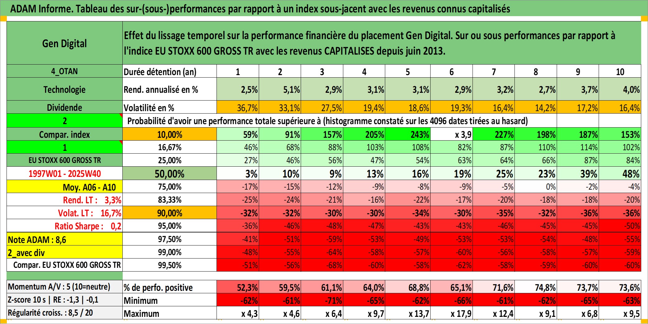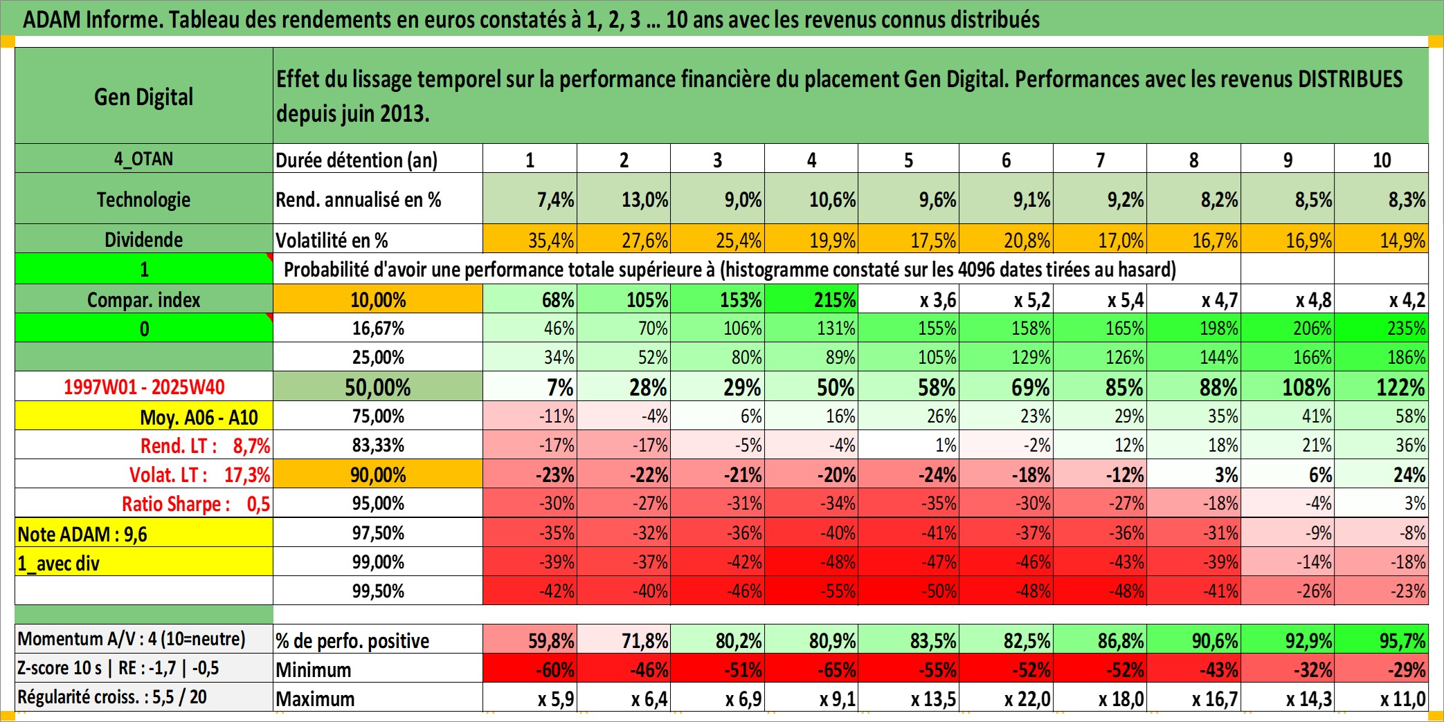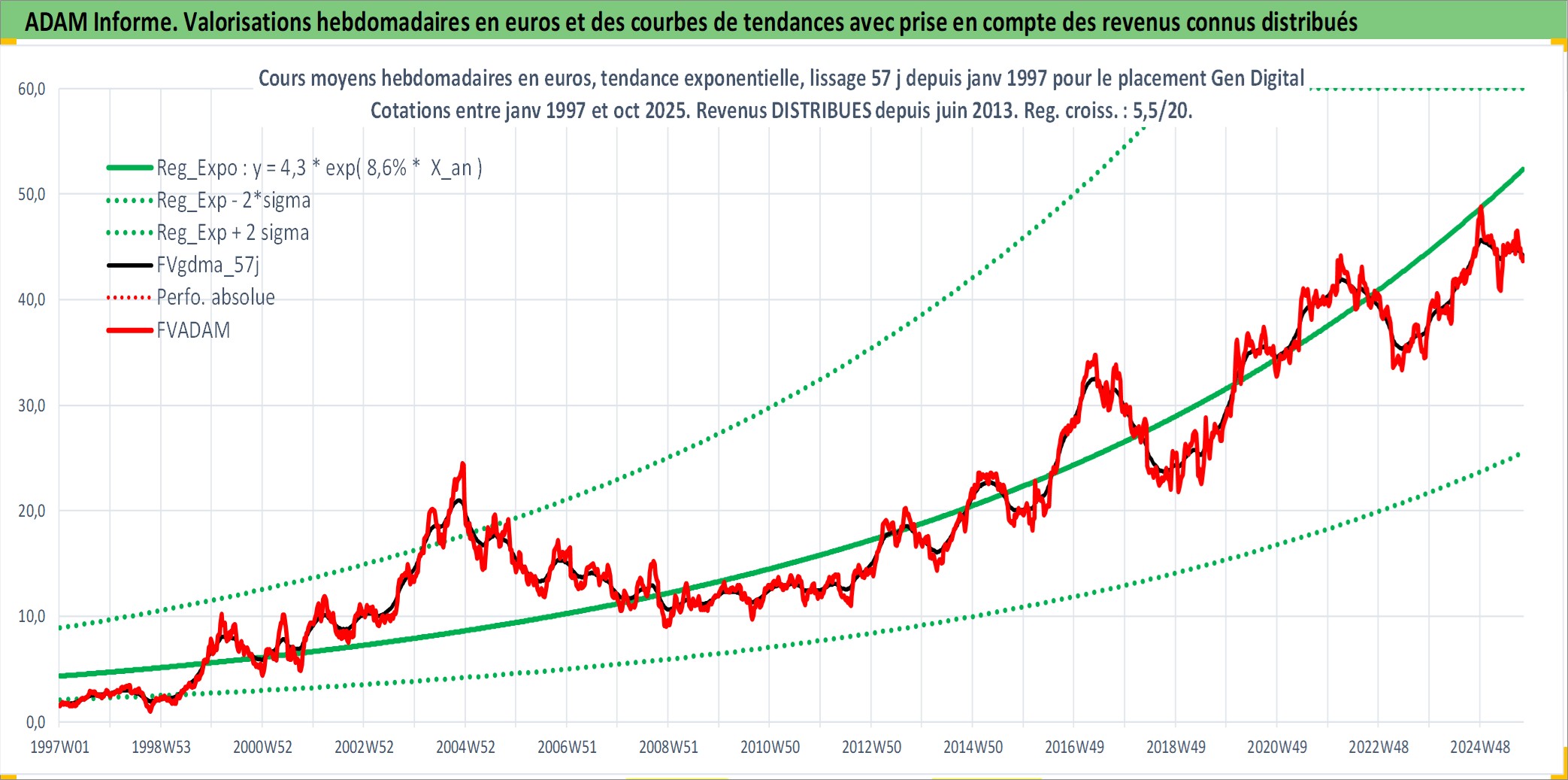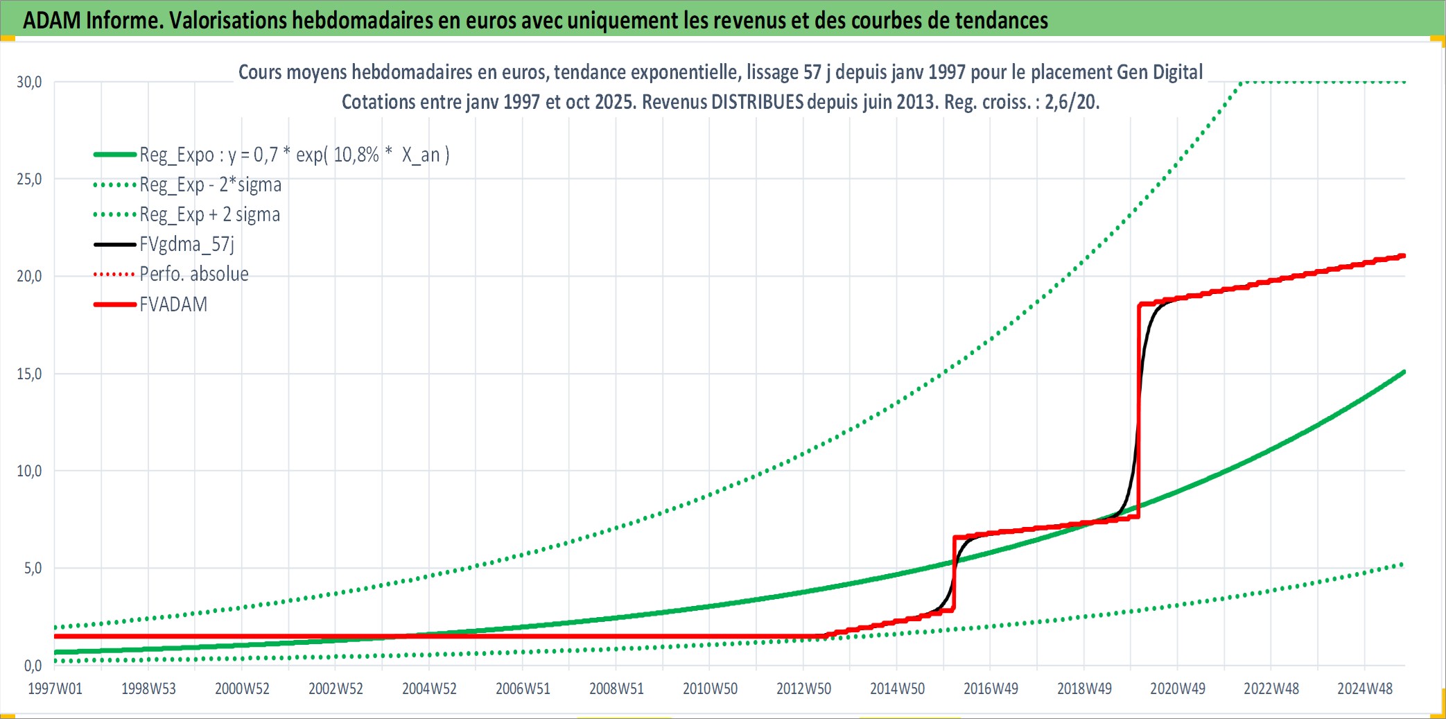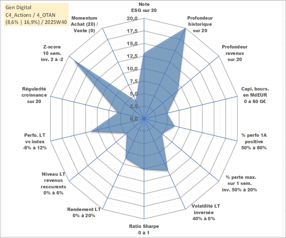 Site dédié aux investisseursPage dédiée sur site financeAnalyse des valorisations hebdomadaires de l'action Gen Digital. Cet actif est cote en USD. Les valorisations sont en contrevaleur EURO et couvrent les semaines 1997W01 a 2025W40. Les revenus de cet actif financier sont pris en compte depuis la semaine 2013W25. La note globale ESG de cet actif est estimee a 13.0 (apres rebasage entre 0 et 20).