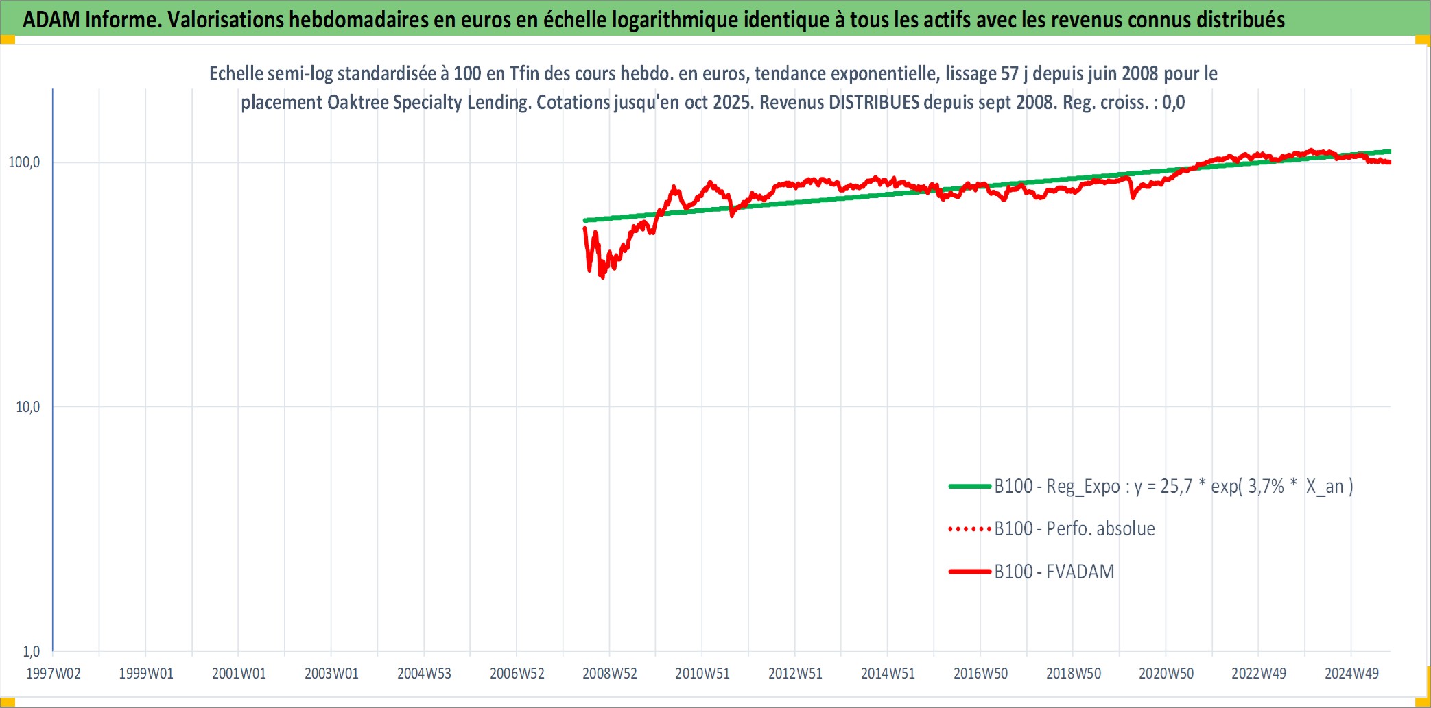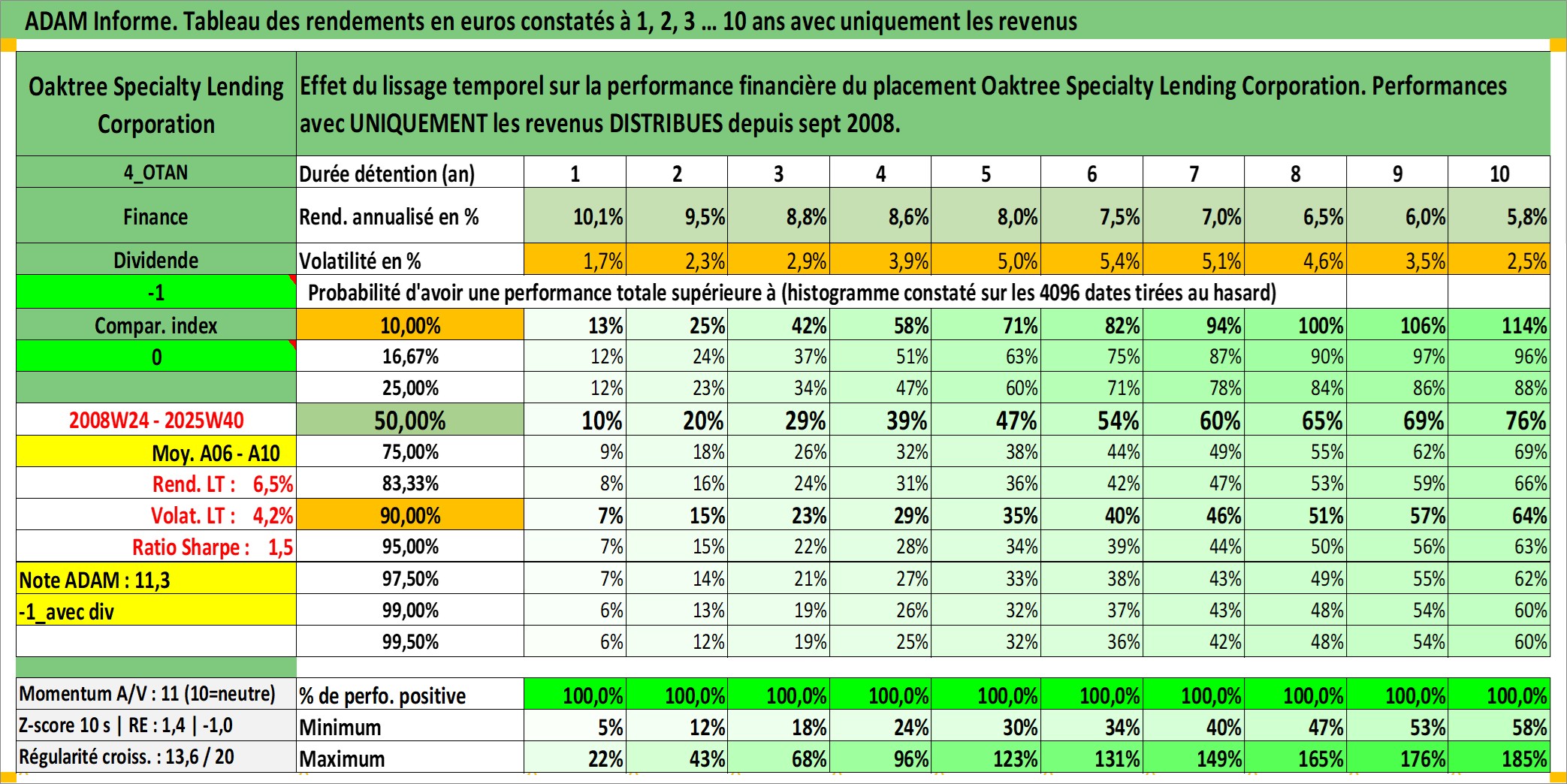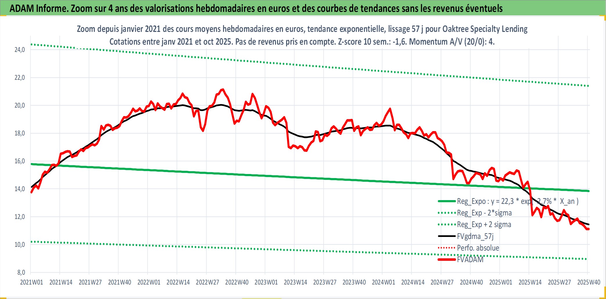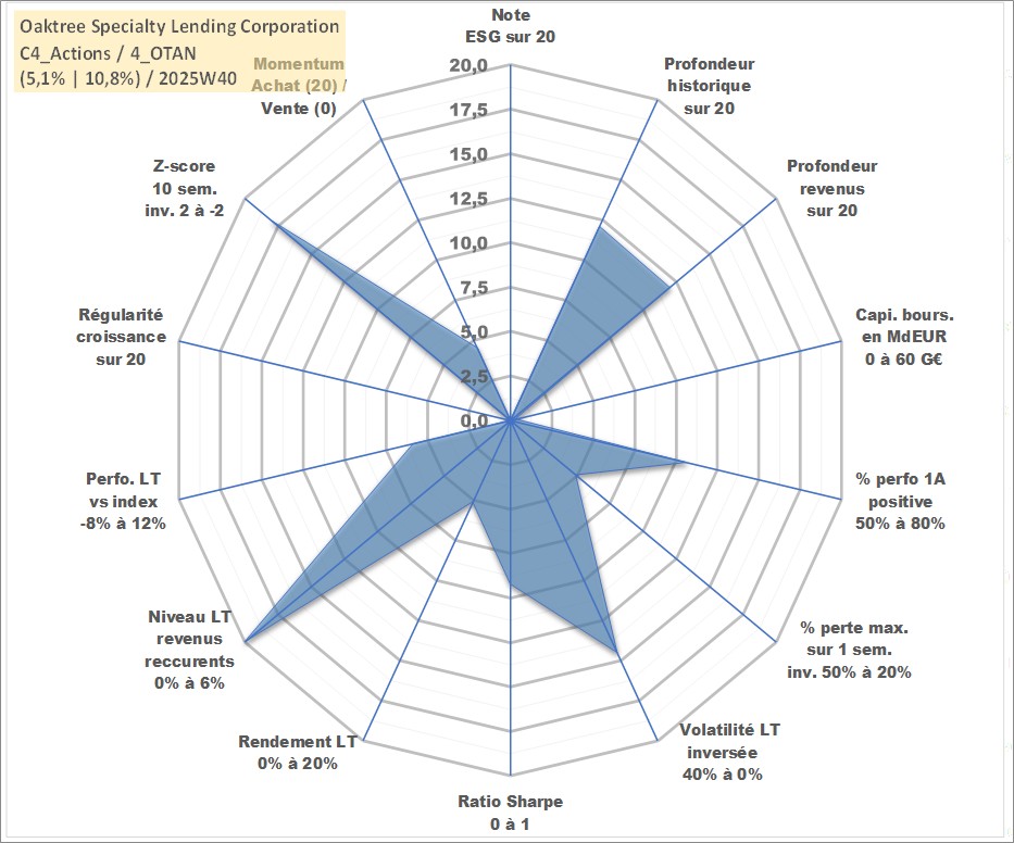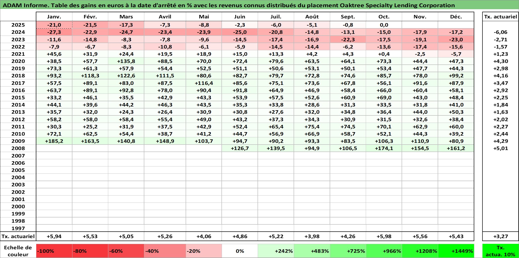 Site dédié aux investisseursPage dédiée sur site financeAnalyse des valorisations hebdomadaires de l'action Oaktree Specialty Lending Corporation. Cet actif est cote en USD. Les valorisations sont en contrevaleur EURO et couvrent les semaines 2008W24 a 2025W40. Les revenus de cet actif financier sont pris en compte depuis la semaine 2008W37. La note ESG de cet actif n'est pas connue.