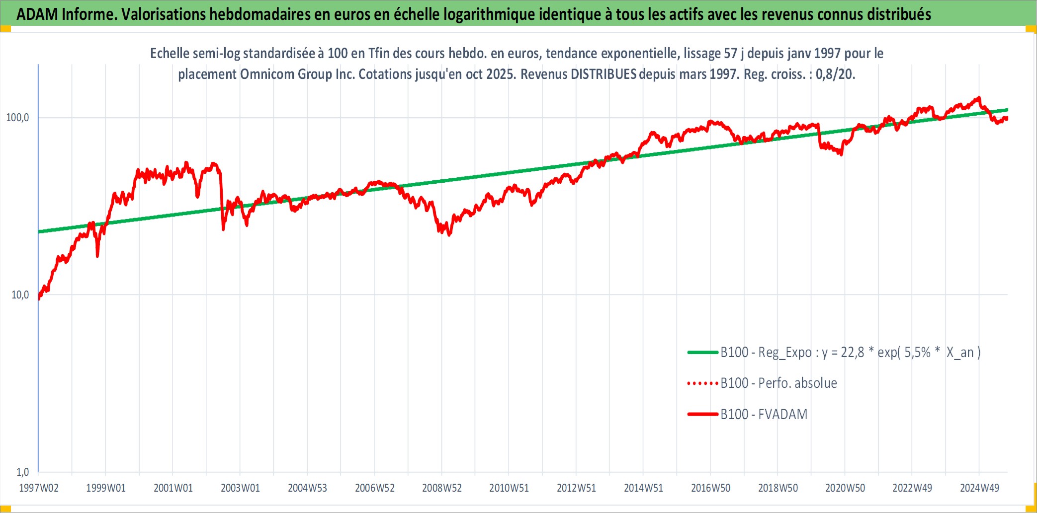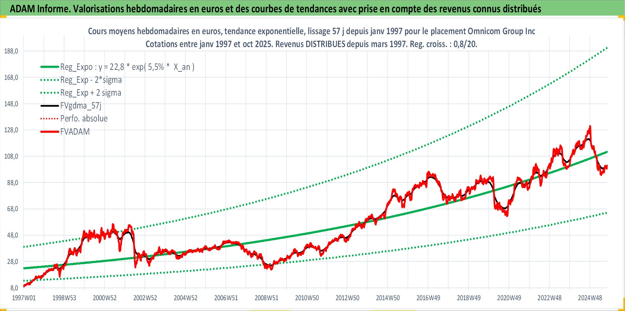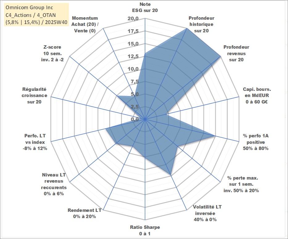 Site dédié aux investisseursPage dédiée sur site financeAnalyse des valorisations hebdomadaires de l'action Omnicom Group Inc. Cet actif est cote en USD. Les valorisations sont en contrevaleur EURO et couvrent les semaines 1997W01 a 2025W40. Les revenus de cet actif financier sont pris en compte depuis la semaine 1997W11. La note globale ESG de cet actif est estimee a 13.0 (apres rebasage entre 0 et 20).