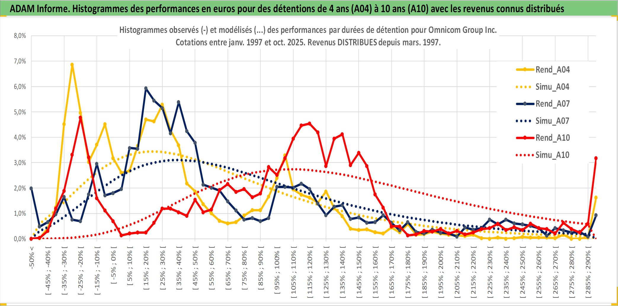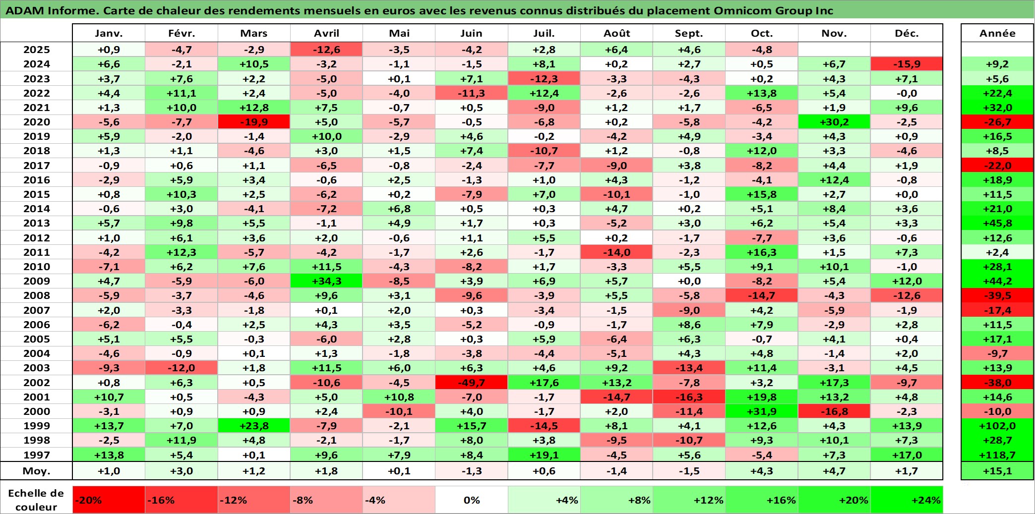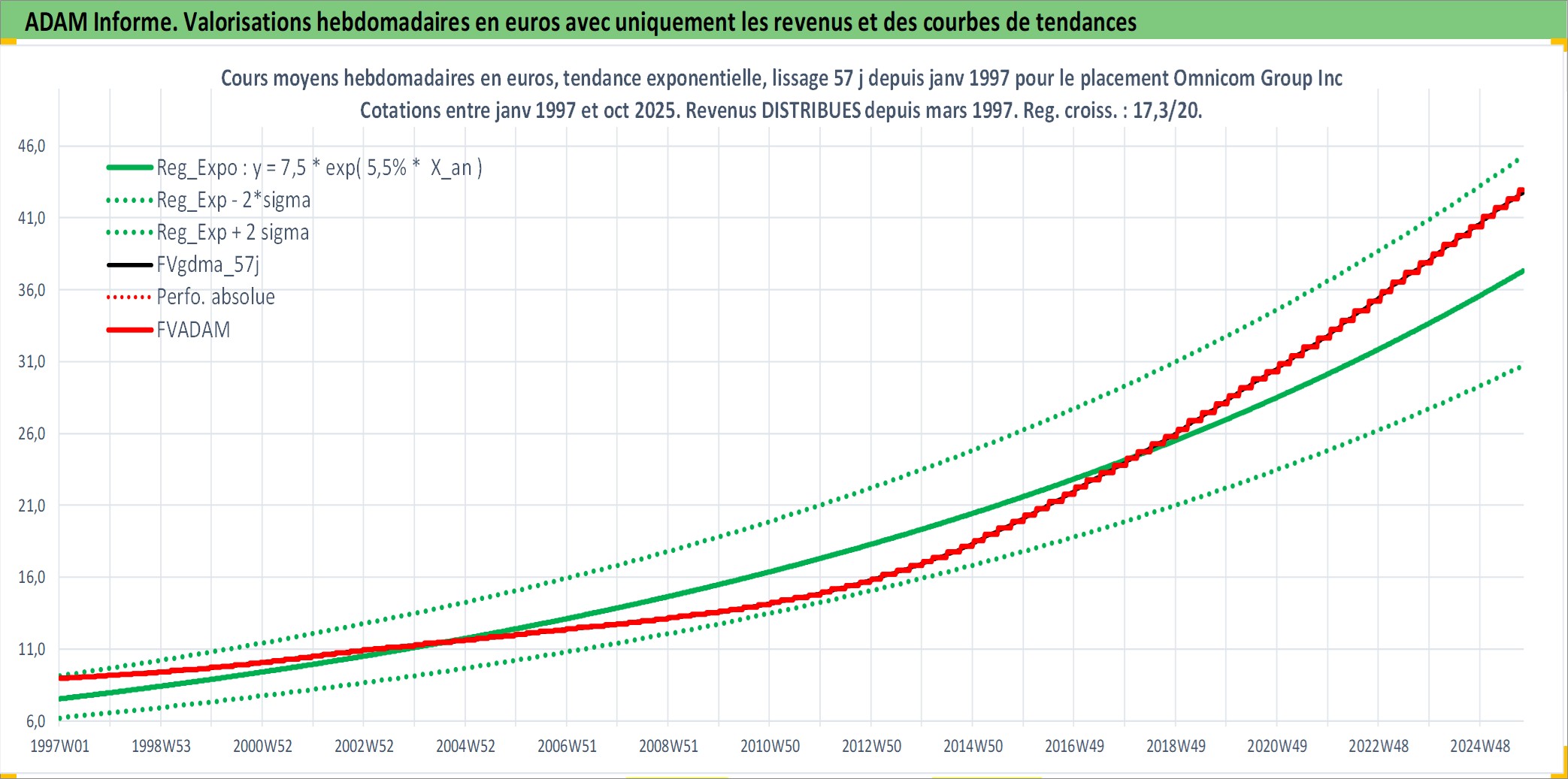Site dédié aux investisseursPage dédiée sur site financeAnalyse des valorisations hebdomadaires de l'action Omnicom Group Inc. Cet actif est cote en USD. Les valorisations sont en contrevaleur EURO et couvrent les semaines 1997W01 a 2025W40. Les revenus de cet actif financier sont pris en compte depuis la semaine 1997W11. La note globale ESG de cet actif est estimee a 13.0 (apres rebasage entre 0 et 20).
