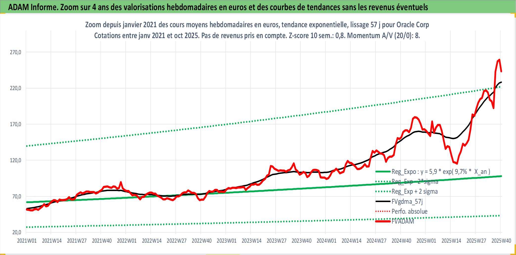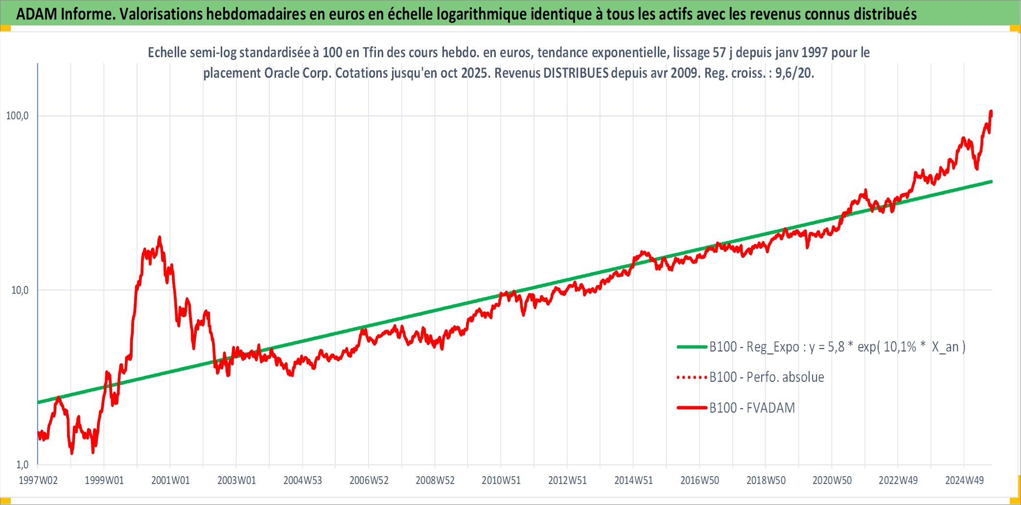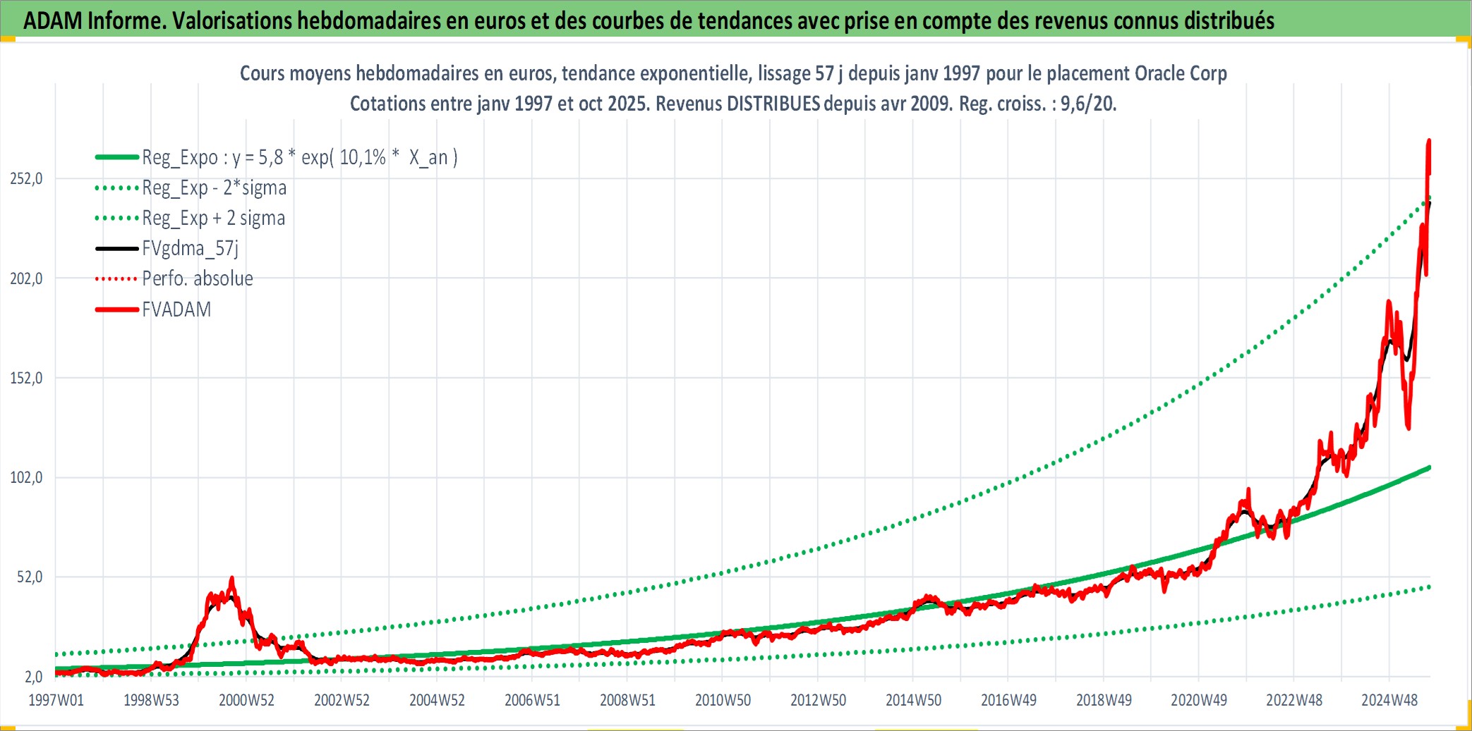 Site dédié aux investisseursPage dédiée sur site financeAnalyse des valorisations hebdomadaires de l'action Oracle Corp. Cet actif est cote en USD. Les valorisations sont en contrevaleur EURO et couvrent les semaines 1997W01 a 2025W40. Les revenus de cet actif financier sont pris en compte depuis la semaine 2009W15. La note globale ESG de cet actif est estimee a 14.0 (apres rebasage entre 0 et 20).