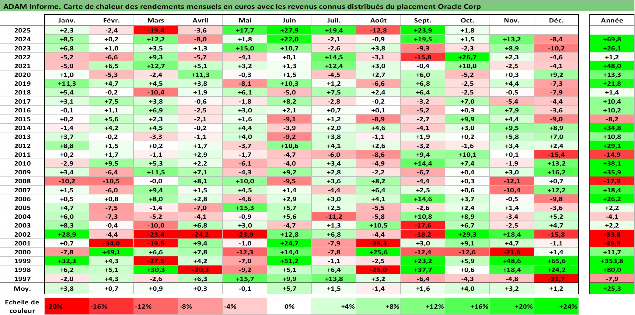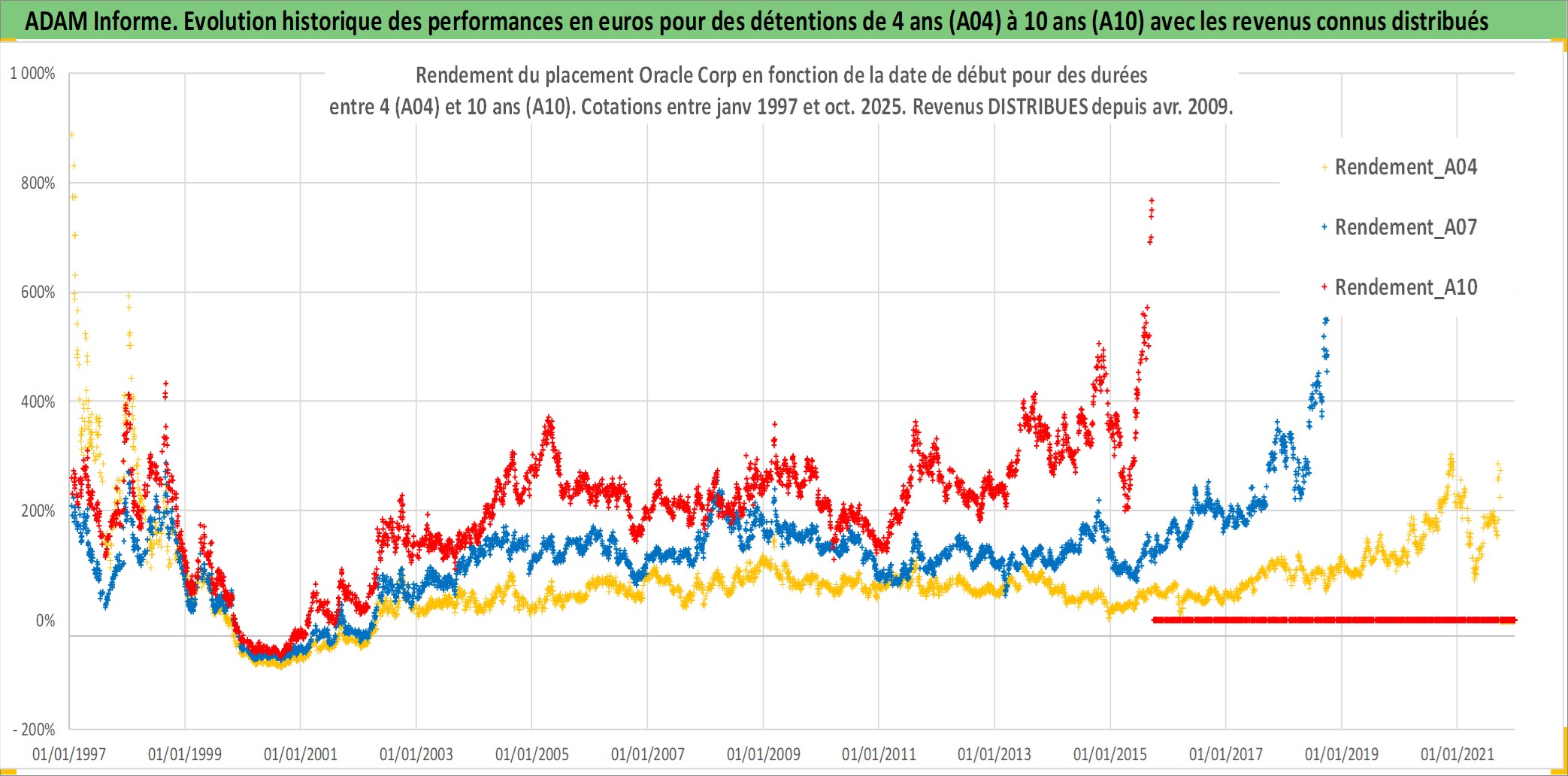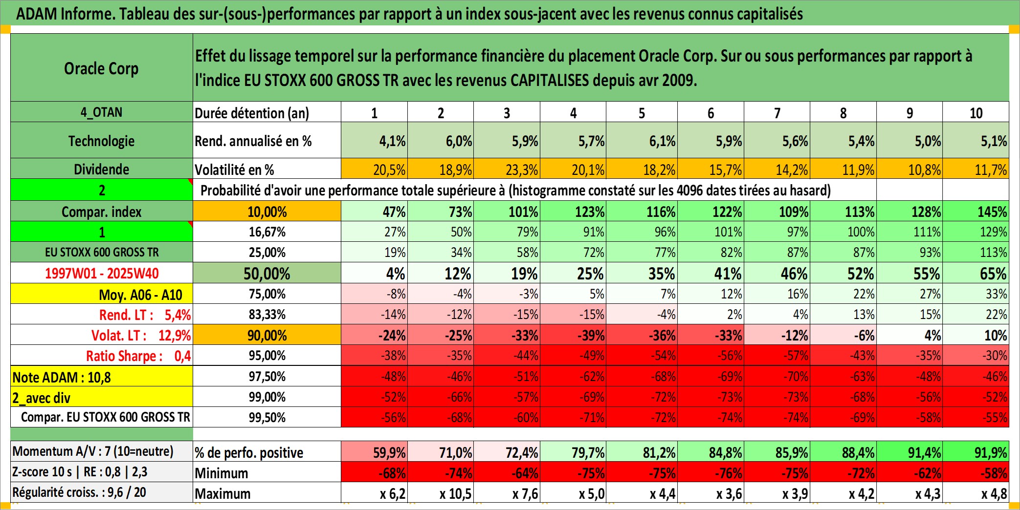 Site dédié aux investisseursPage dédiée sur site financeAnalyse des valorisations hebdomadaires de l'action Oracle Corp. Cet actif est cote en USD. Les valorisations sont en contrevaleur EURO et couvrent les semaines 1997W01 a 2025W40. Les revenus de cet actif financier sont pris en compte depuis la semaine 2009W15. La note globale ESG de cet actif est estimee a 14.0 (apres rebasage entre 0 et 20).