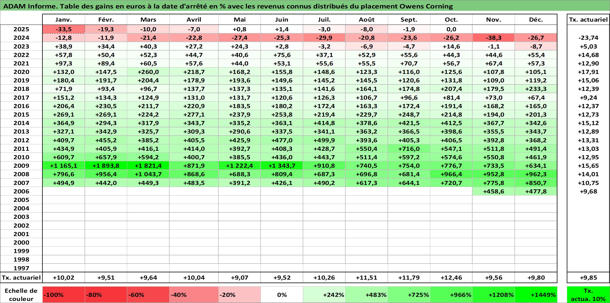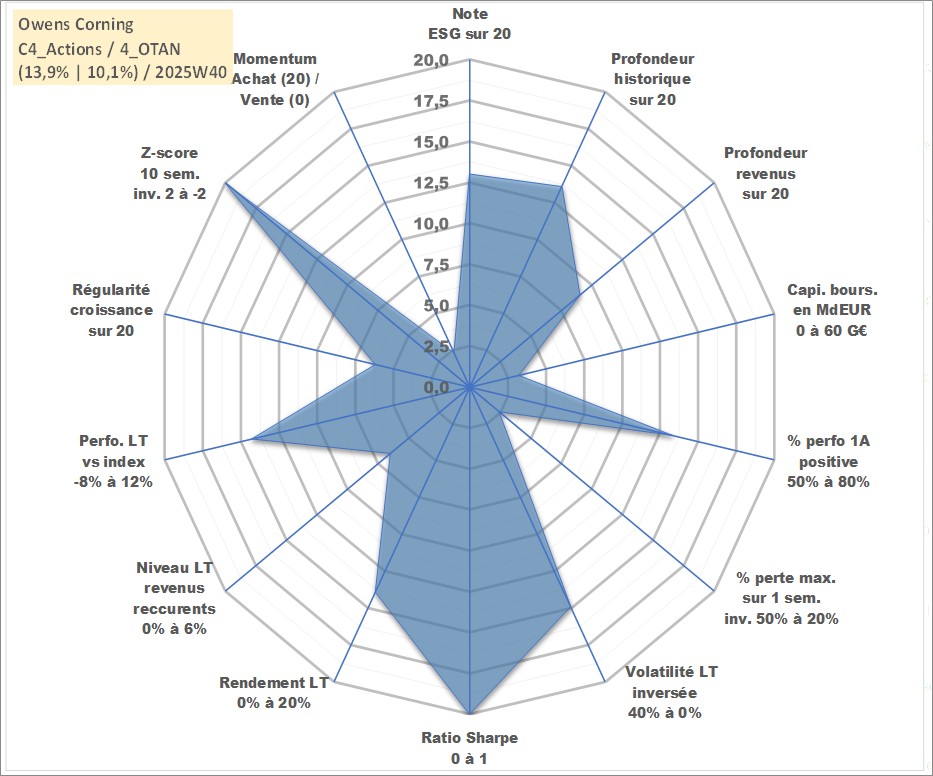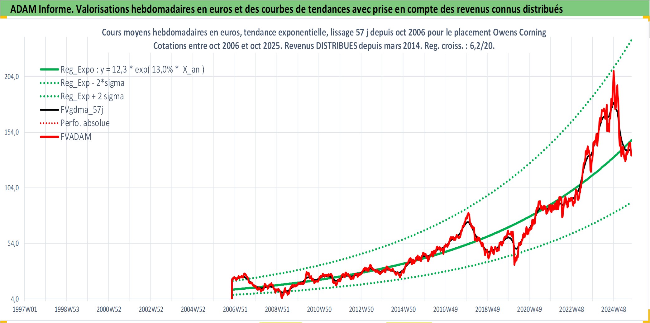 Site dédié aux investisseursPage dédiée sur site financeAnalyse des valorisations hebdomadaires de l'action Owens Corning. Cet actif est cote en USD. Les valorisations sont en contrevaleur EURO et couvrent les semaines 2006W44 a 2025W40. Les revenus de cet actif financier sont pris en compte depuis la semaine 2014W11. La note globale ESG de cet actif est estimee a 13.0 (apres rebasage entre 0 et 20).
